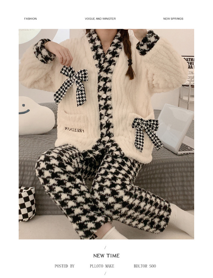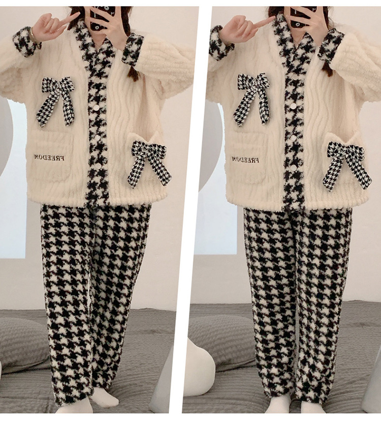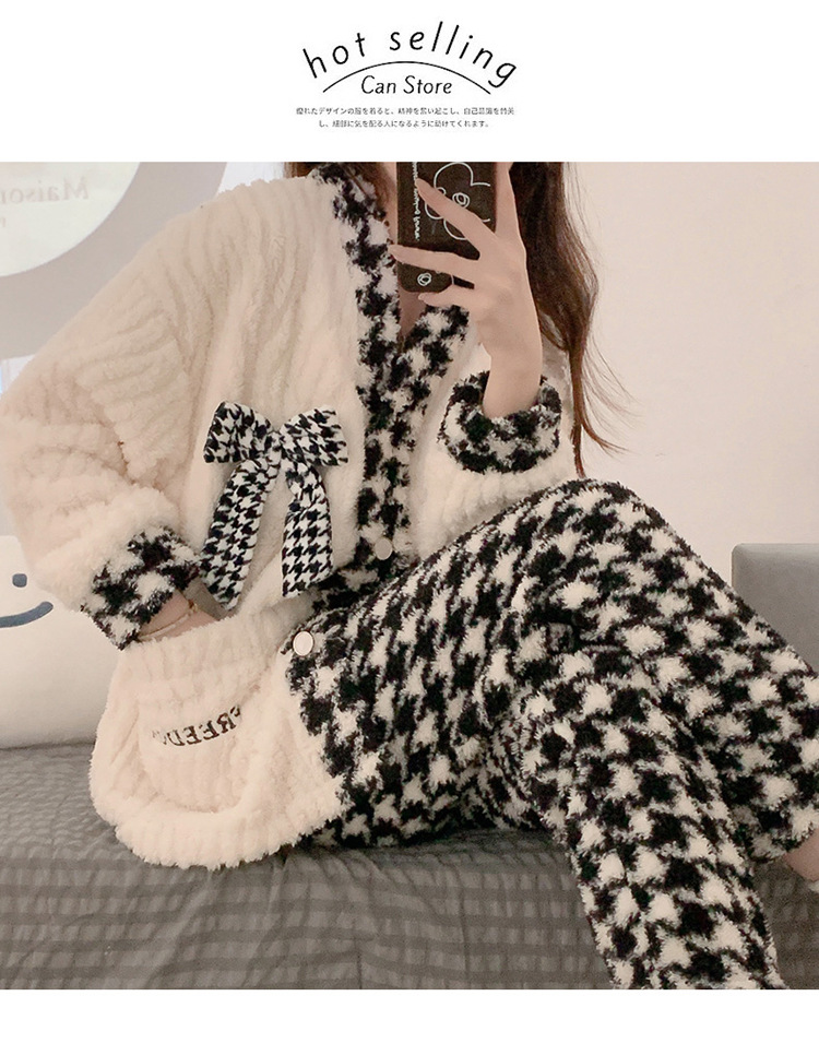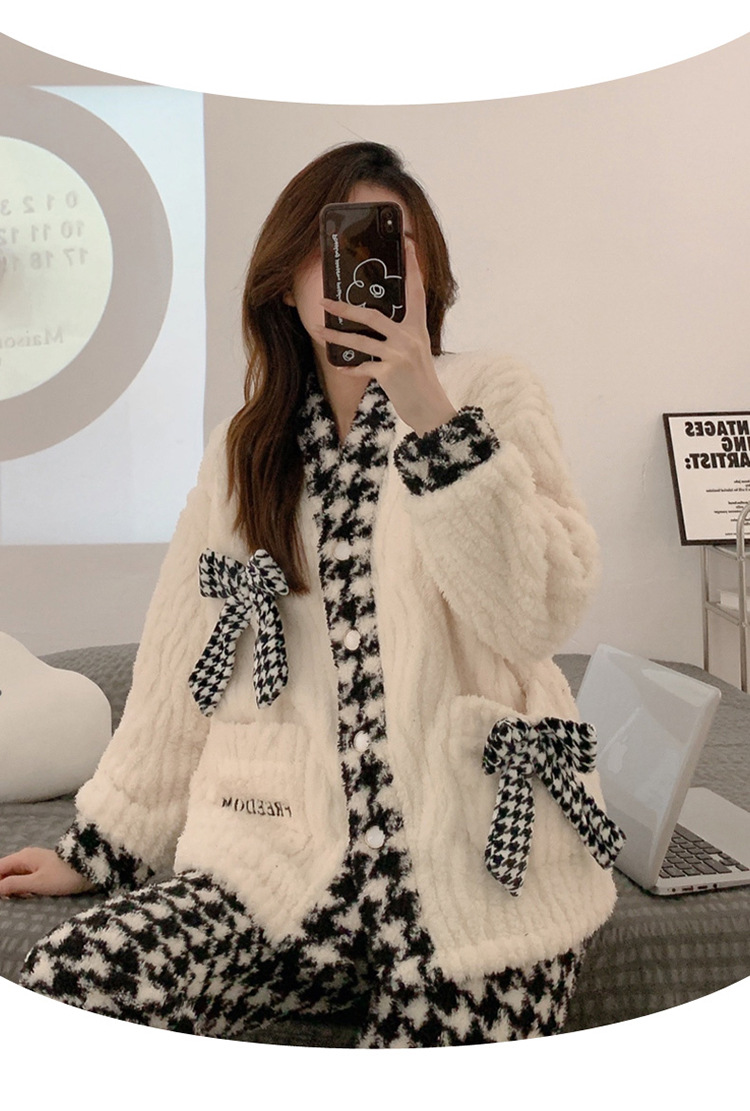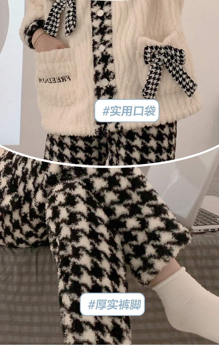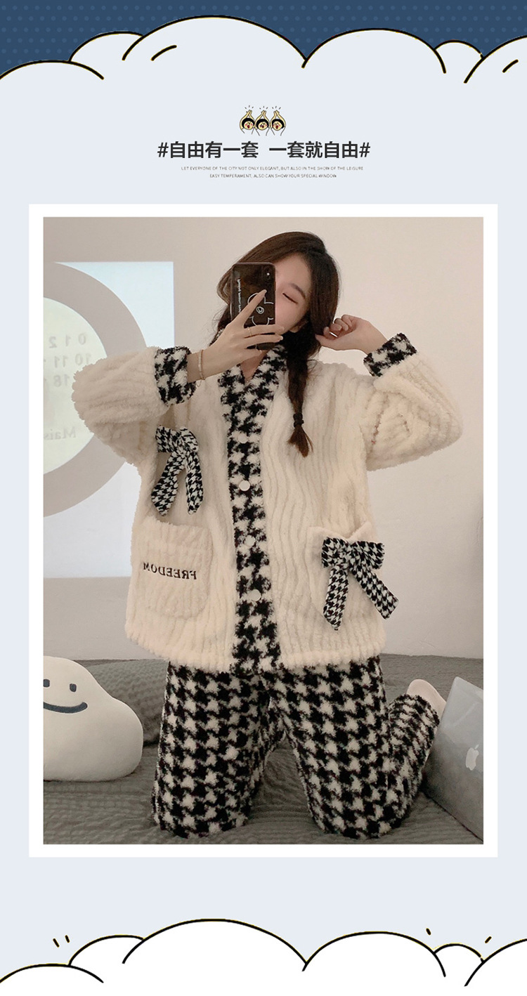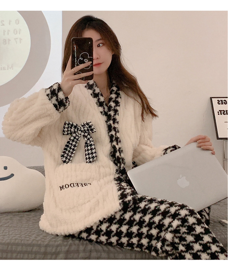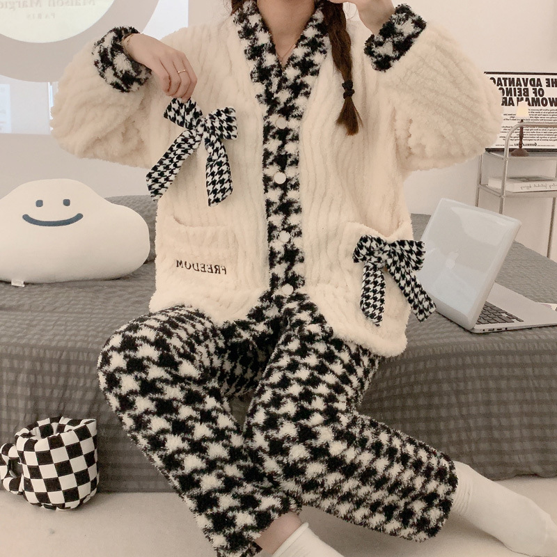 산호 양털 겨울 껍질 패턴 봉제 잠옷 여자의 두꺼운 카디건 달콤한 귀여운 인터넷 인기있는 따뜻한 가정복