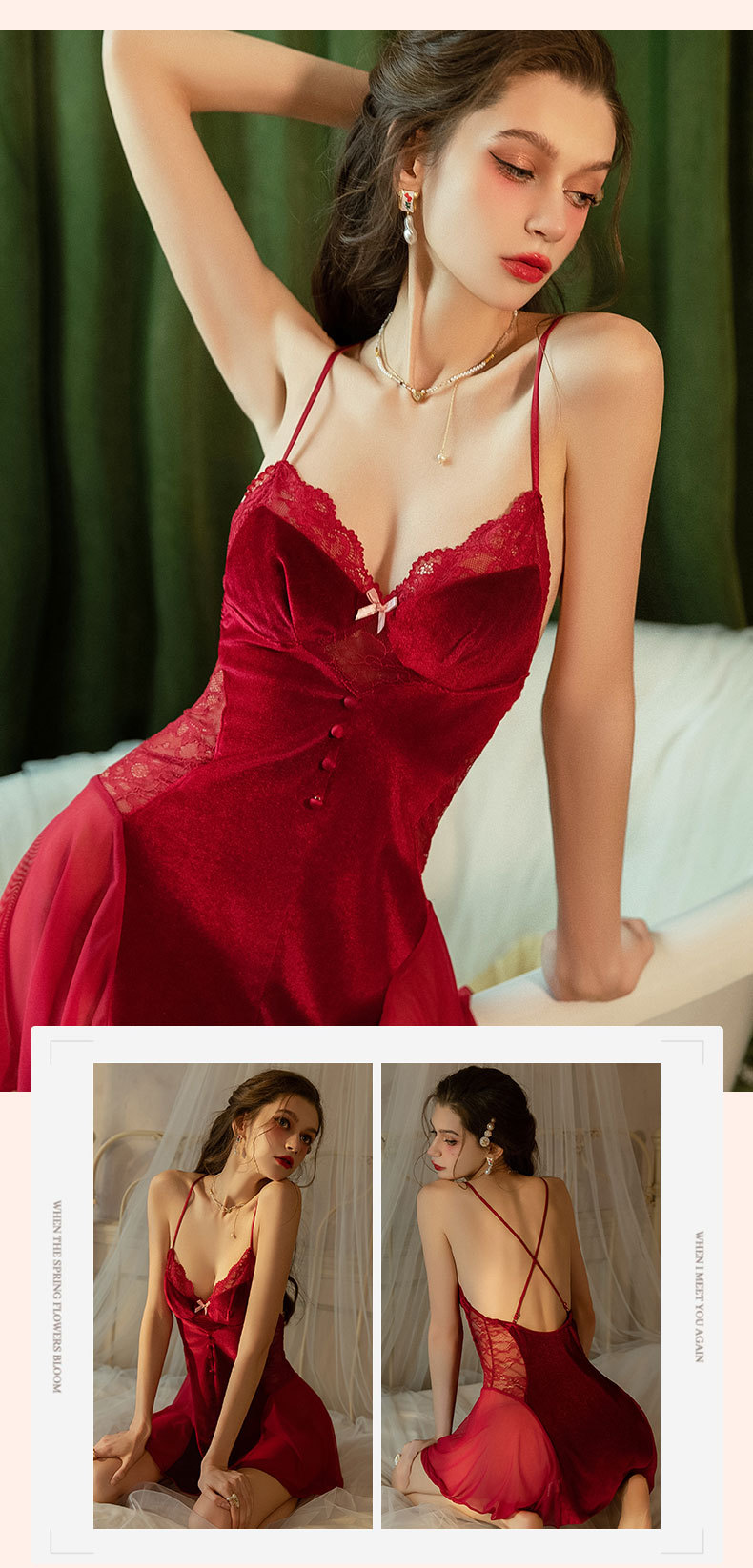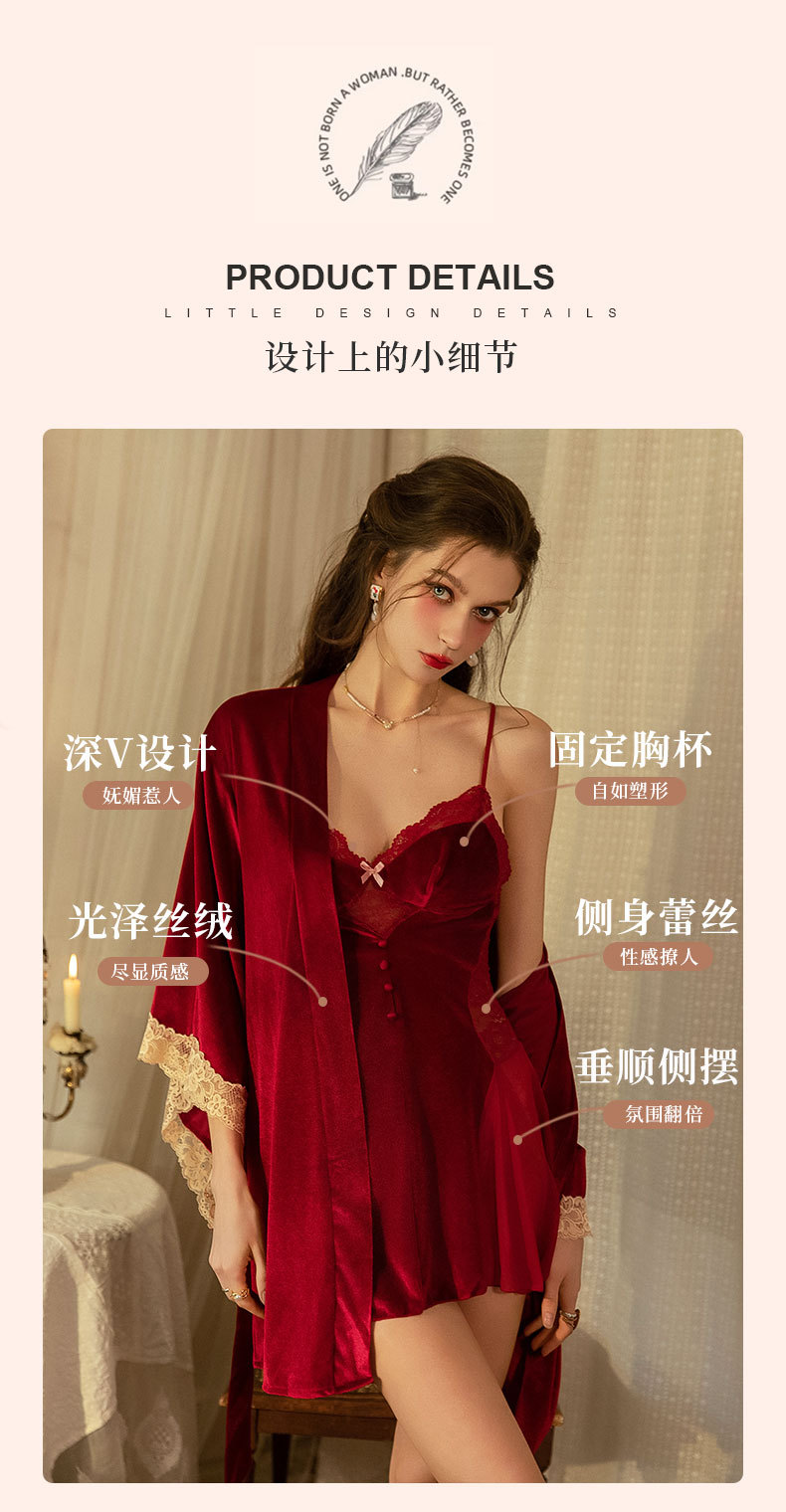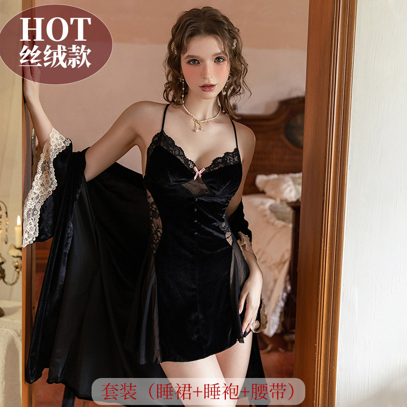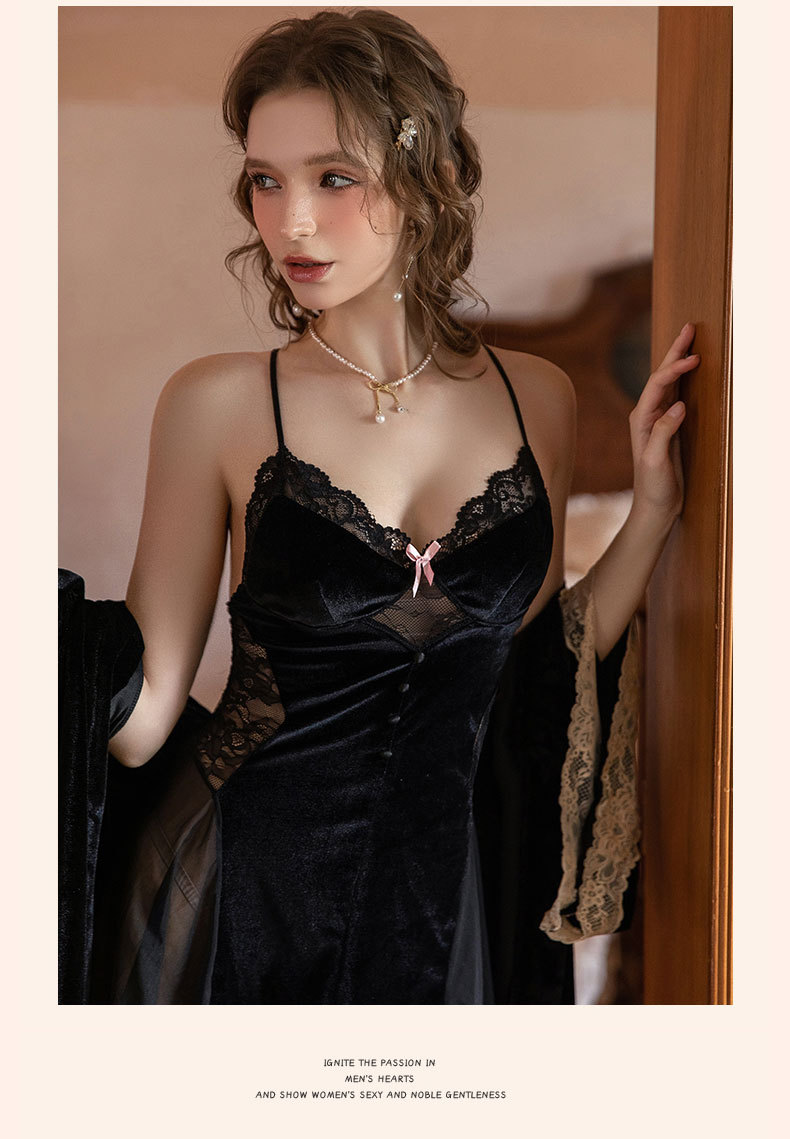가을 겨울 골드 벨벳 섹시 슬립 드레스 여성용 가슴 패드 포함 순수한 매력 스타일 속옷 레이스 스티치 잠옷 세트스토어 가기