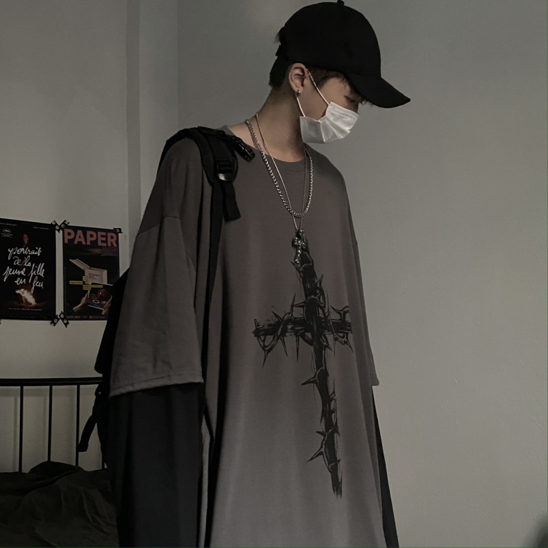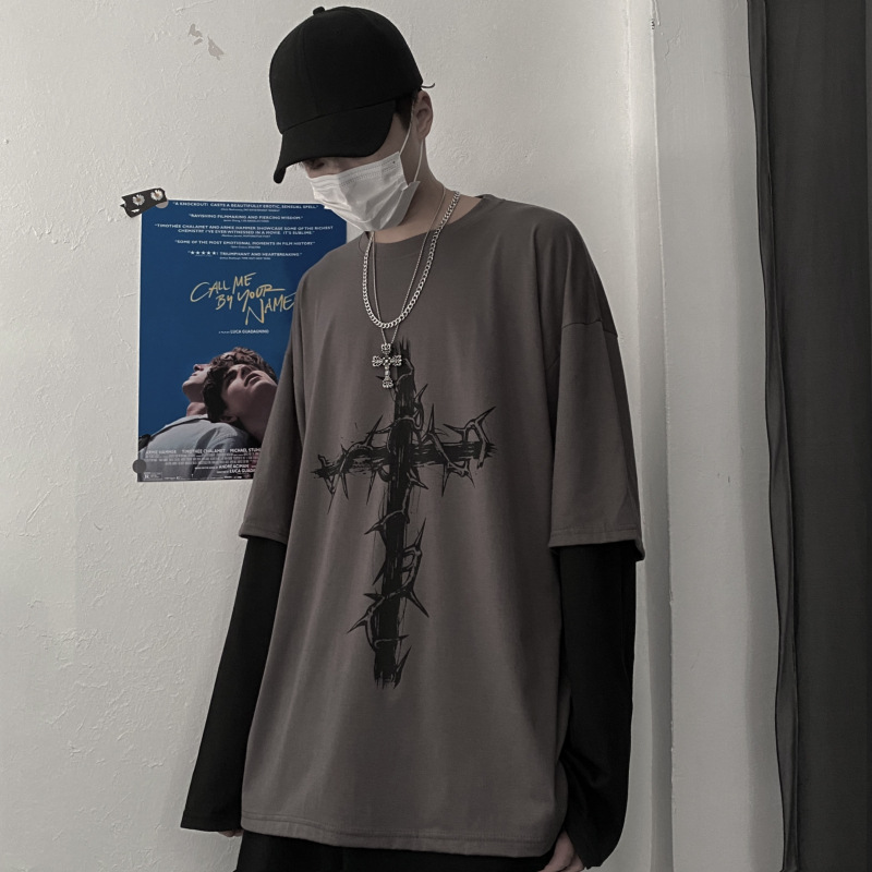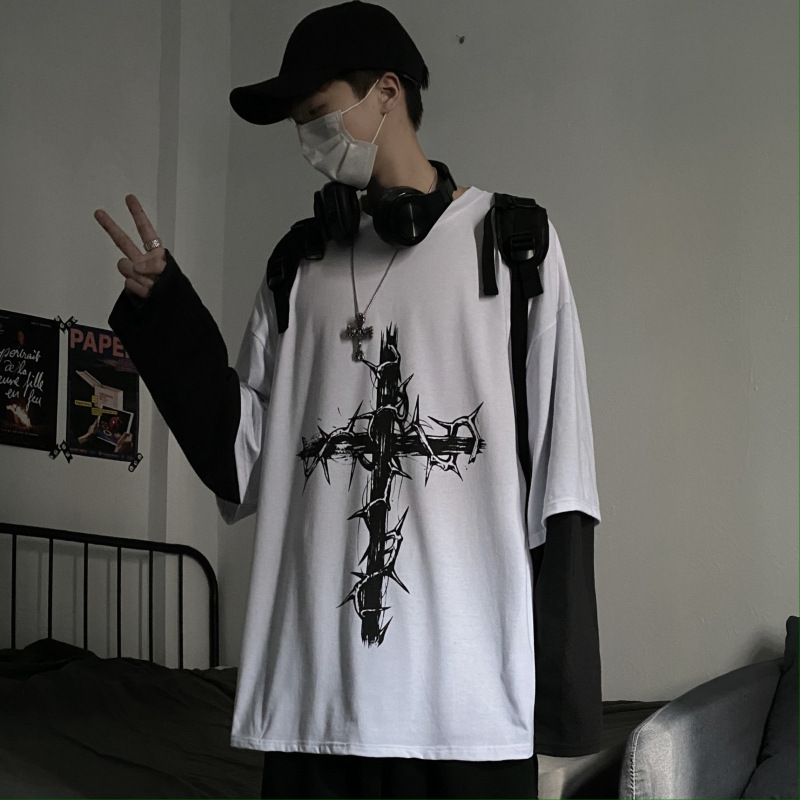 빈티지 하이 스트리트 디아블로 힙합 하라주쿠 가시 십자가 인쇄 된 느슨한 가짜 투피스 바느질 남성용 긴팔 티셔츠스토어 가기