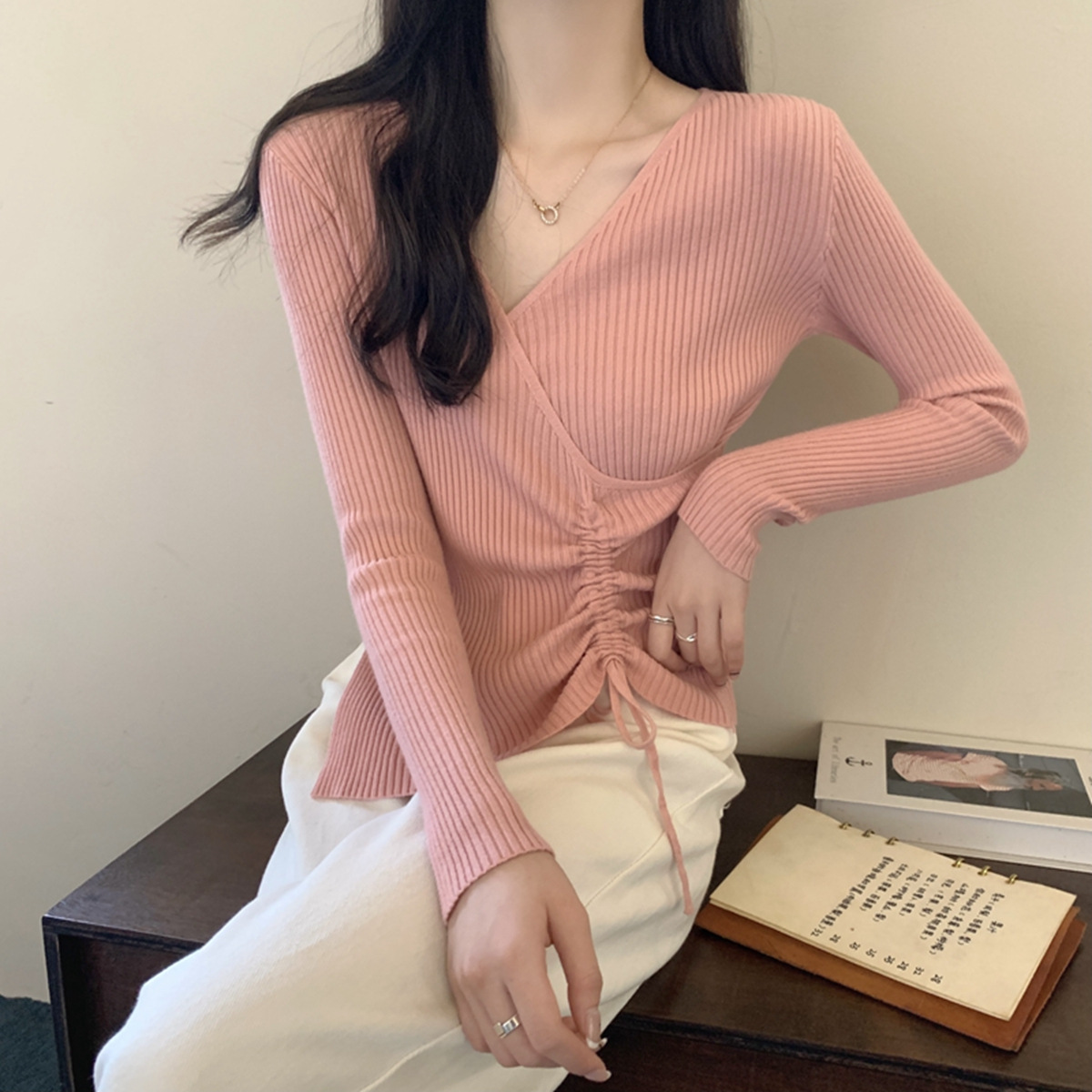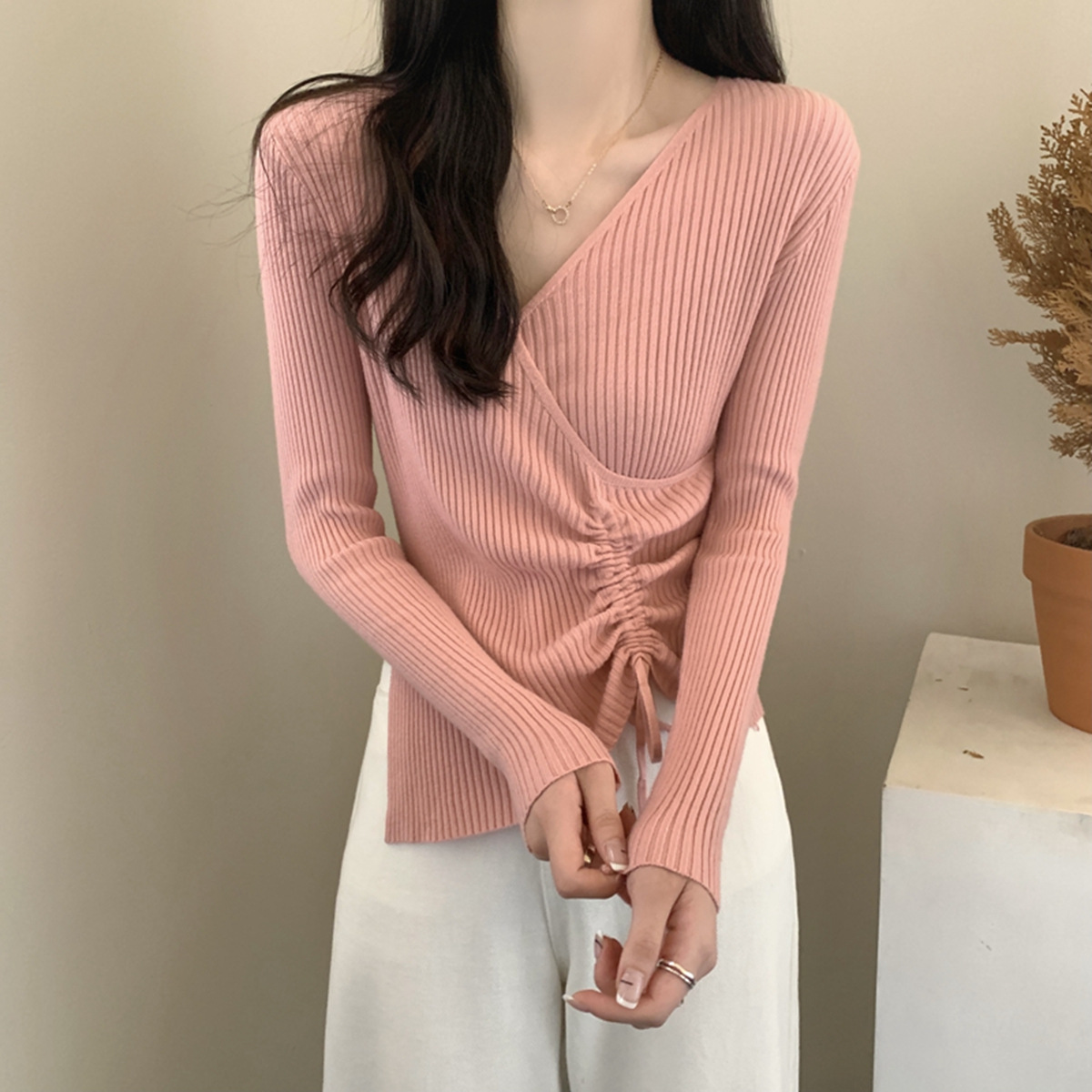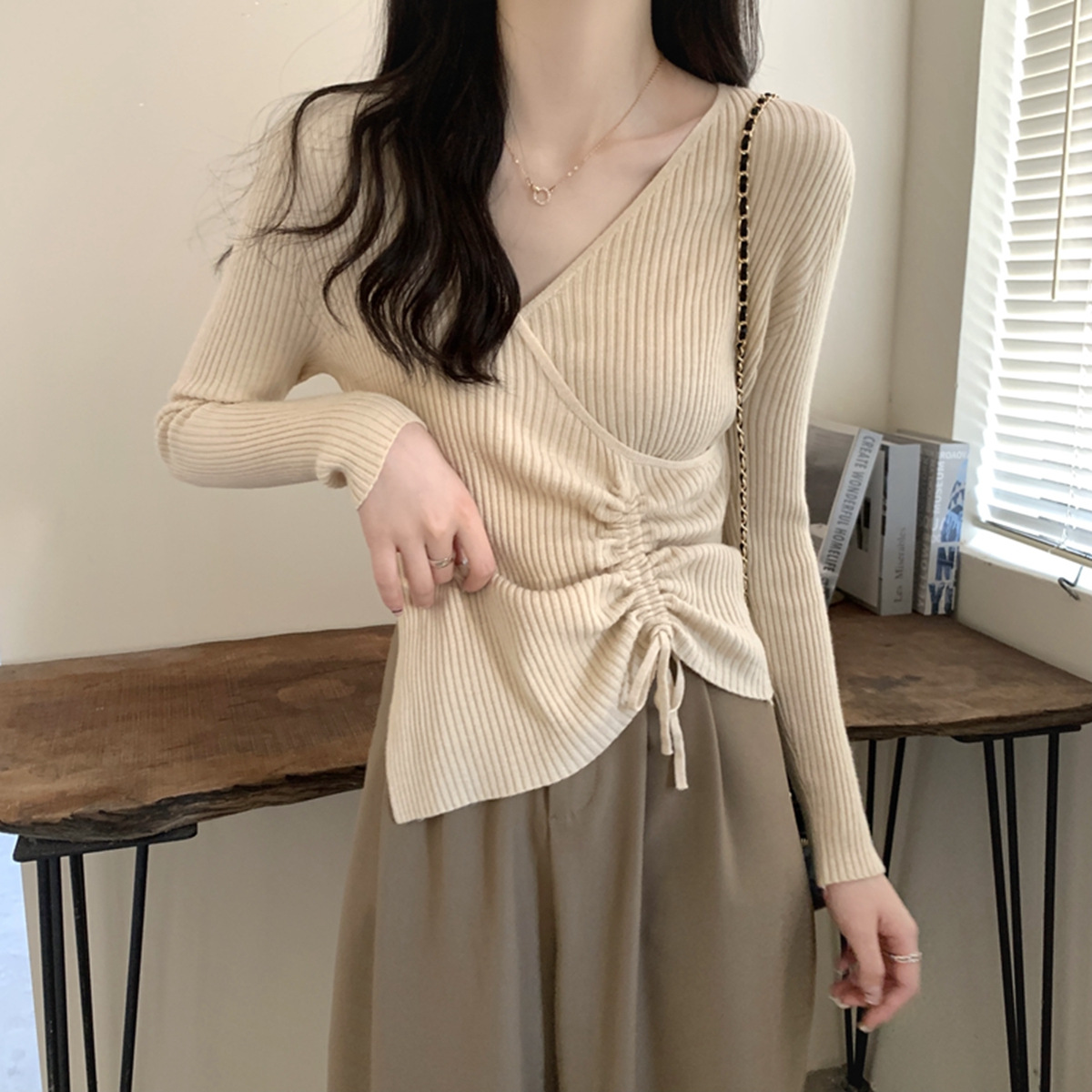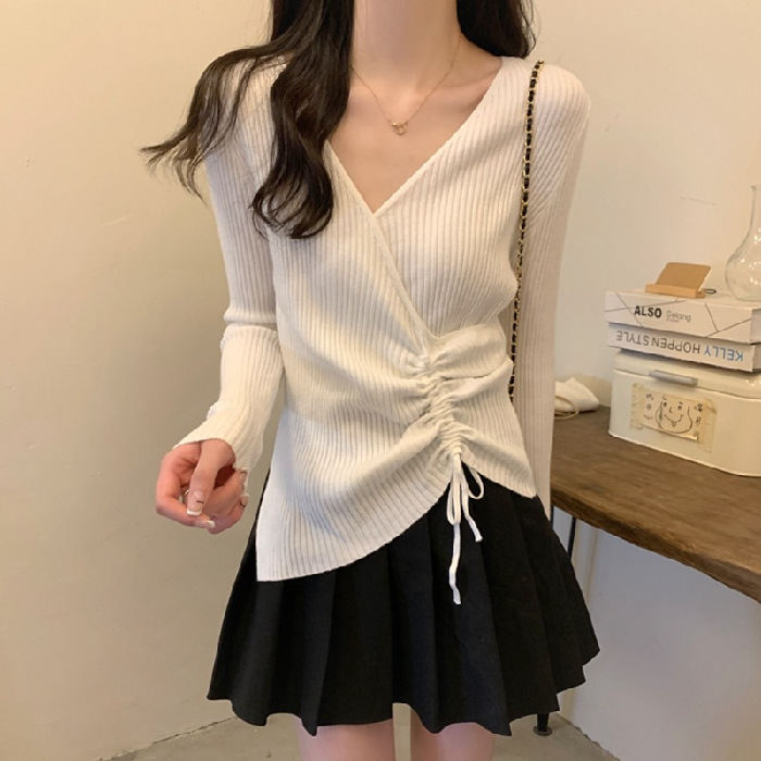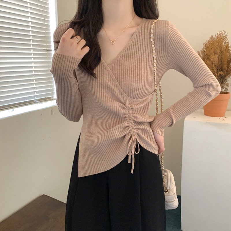 가을과 겨울 V-넥 니트 베이스 셔츠 여성용 내부 착용 가을과 겨울 프랑스 허리 불규칙한 스웨터 긴팔 스웨터 탑스토어 가기