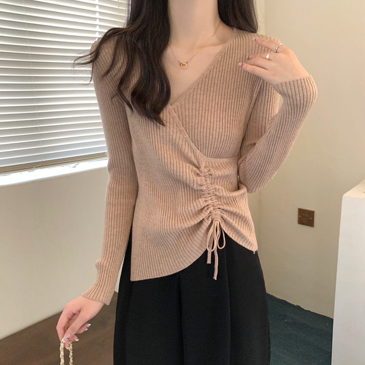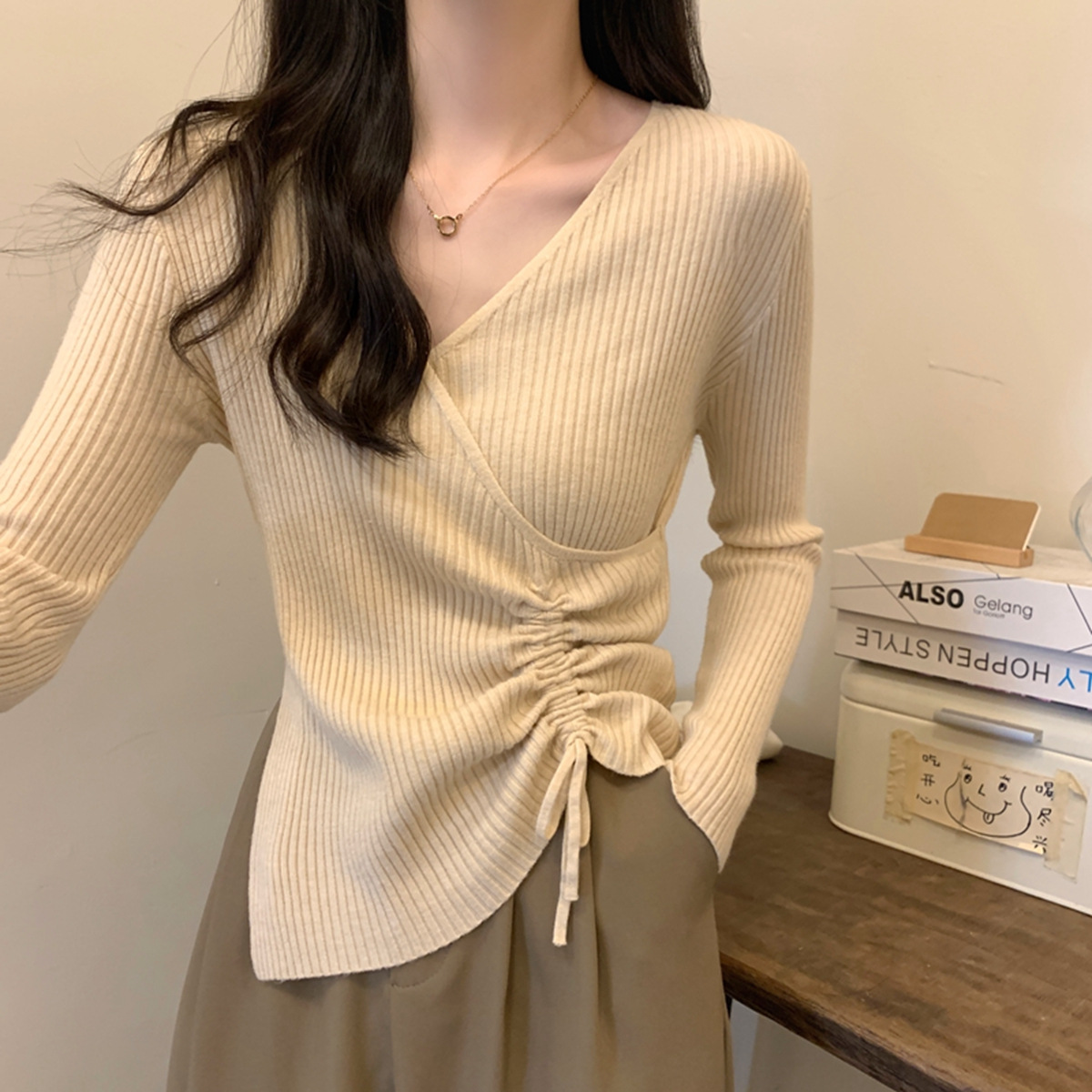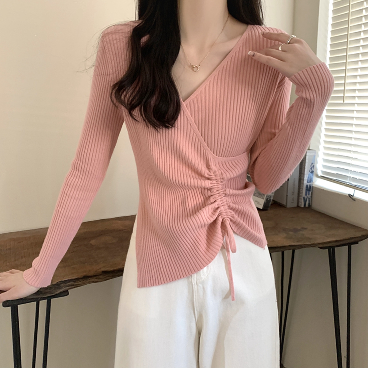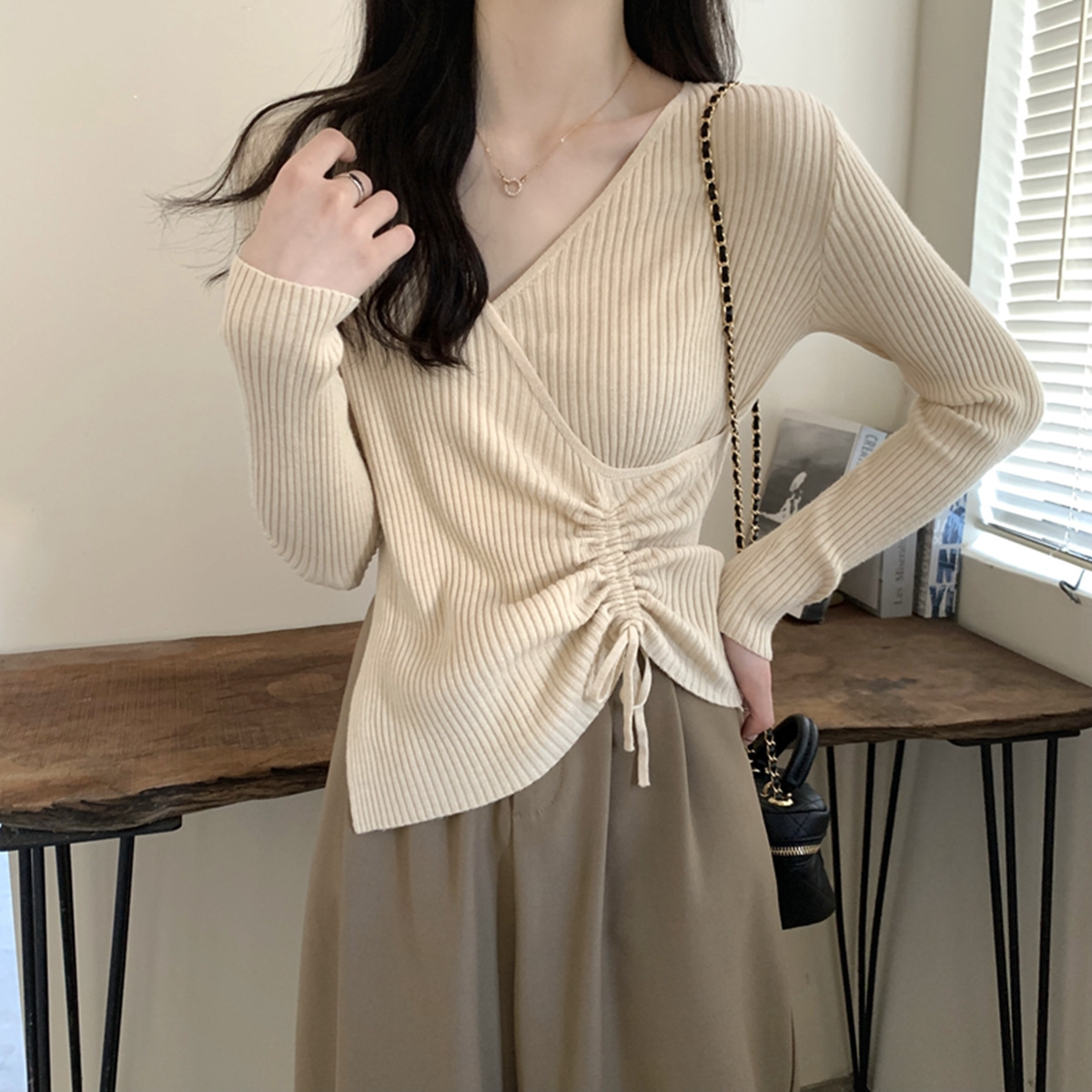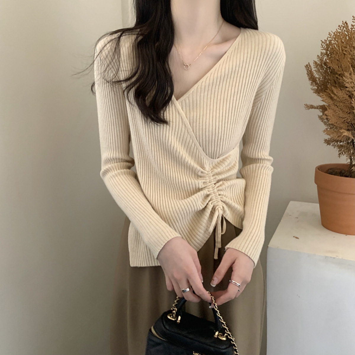 가을과 겨울 V-넥 니트 베이스 셔츠 여성용 내부 착용 가을과 겨울 프랑스 허리 불규칙한 스웨터 긴팔 스웨터 탑스토어 가기