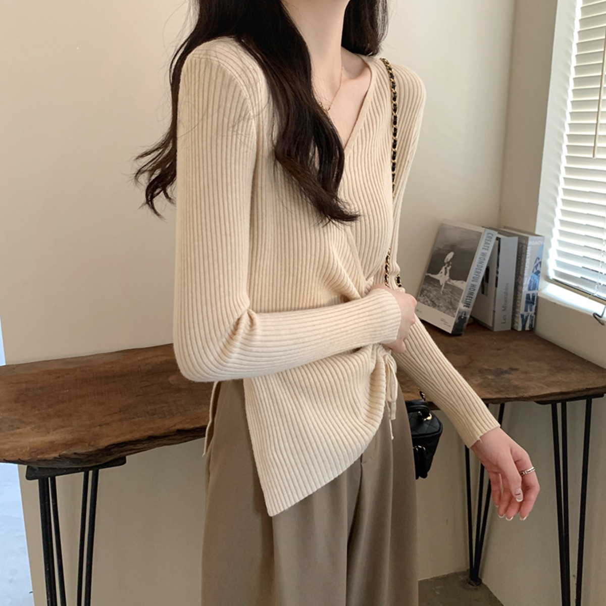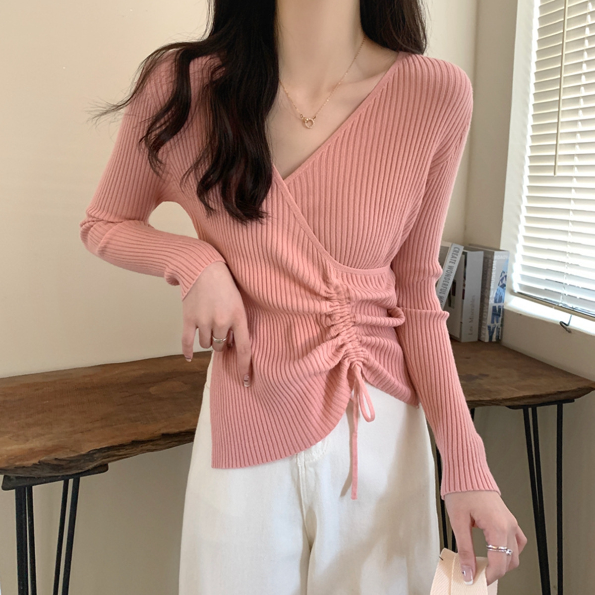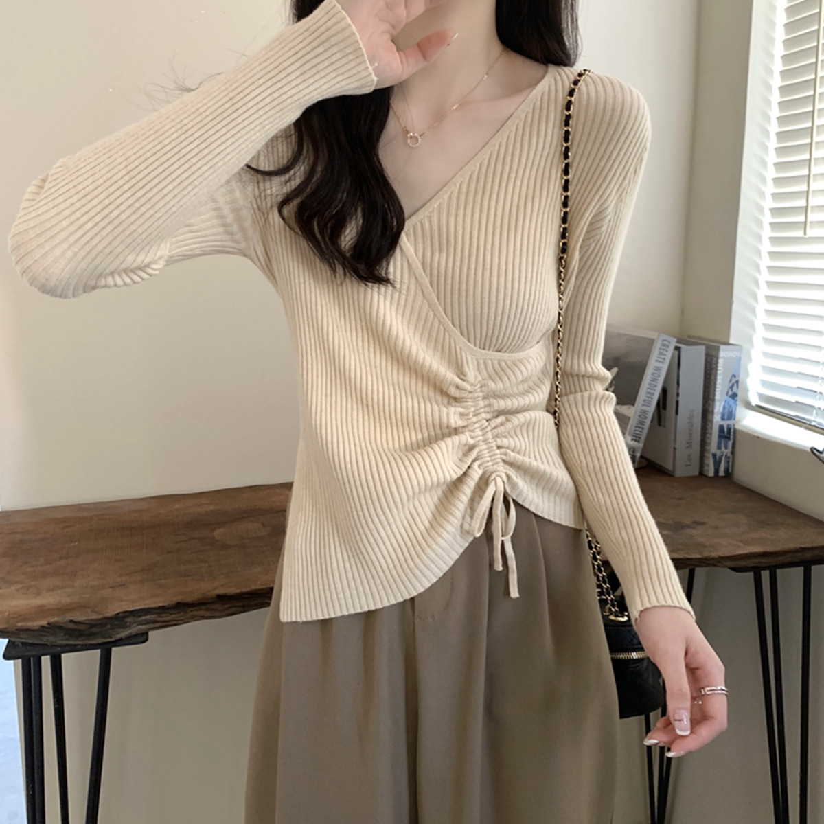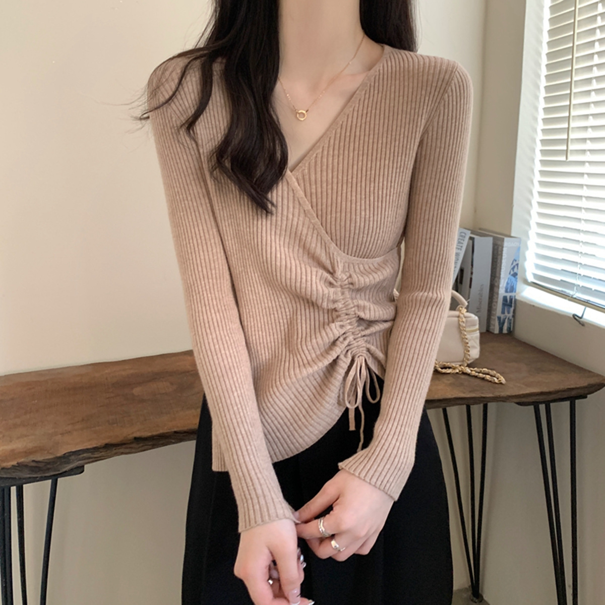 가을과 겨울 V-넥 니트 베이스 셔츠 여성용 내부 착용 가을과 겨울 프랑스 허리 불규칙한 스웨터 긴팔 스웨터 탑스토어 가기