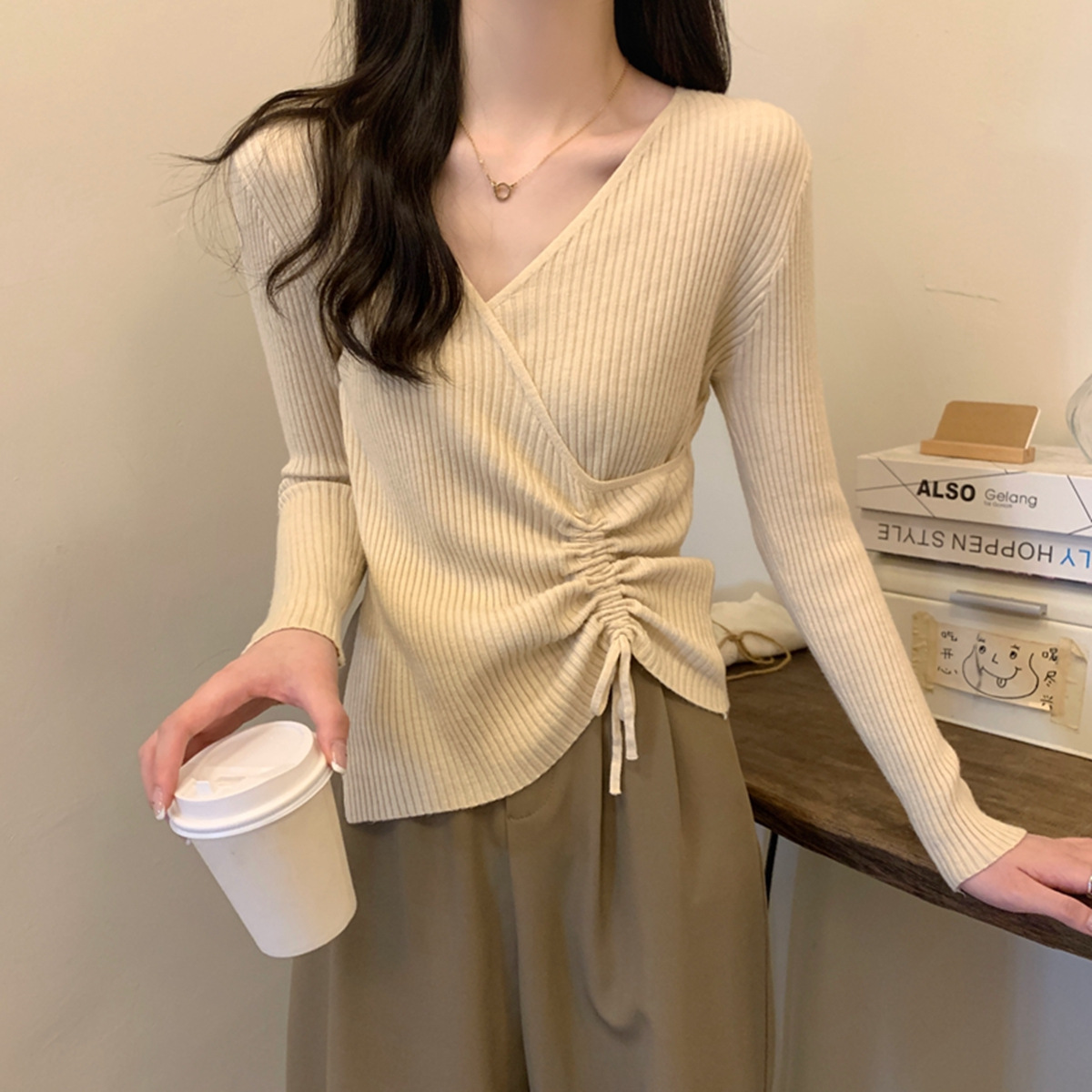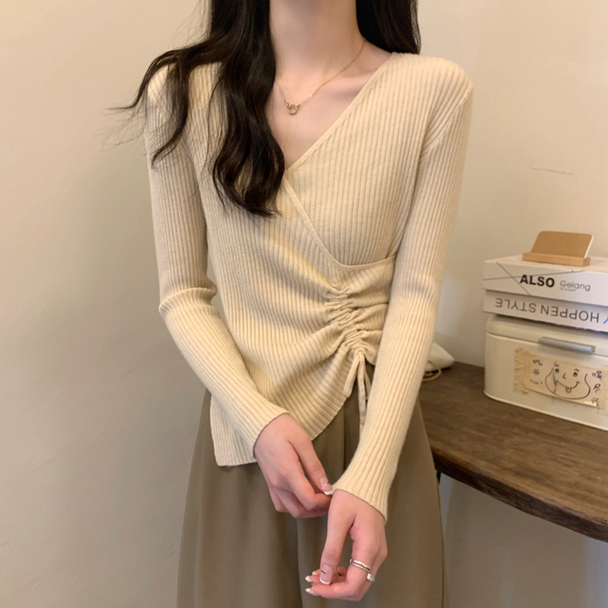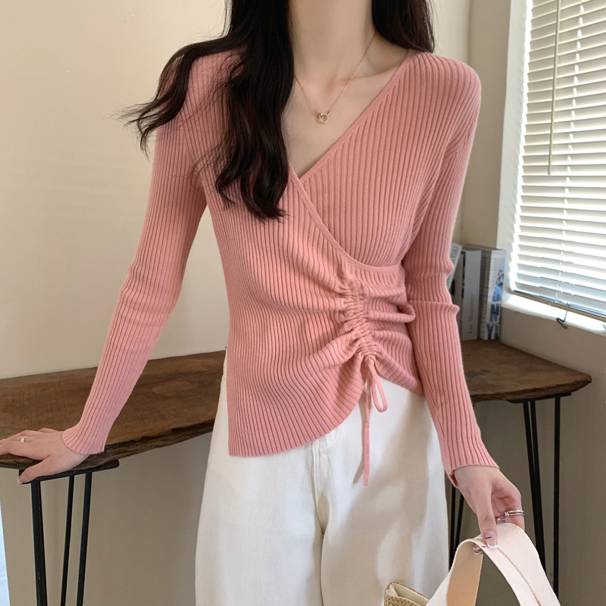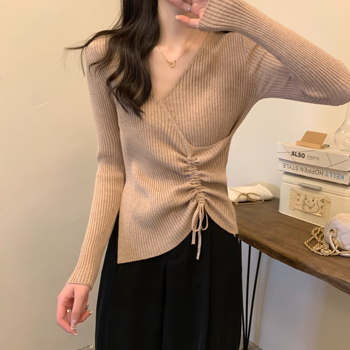 가을과 겨울 V-넥 니트 베이스 셔츠 여성용 내부 착용 가을과 겨울 프랑스 허리 불규칙한 스웨터 긴팔 스웨터 탑스토어 가기