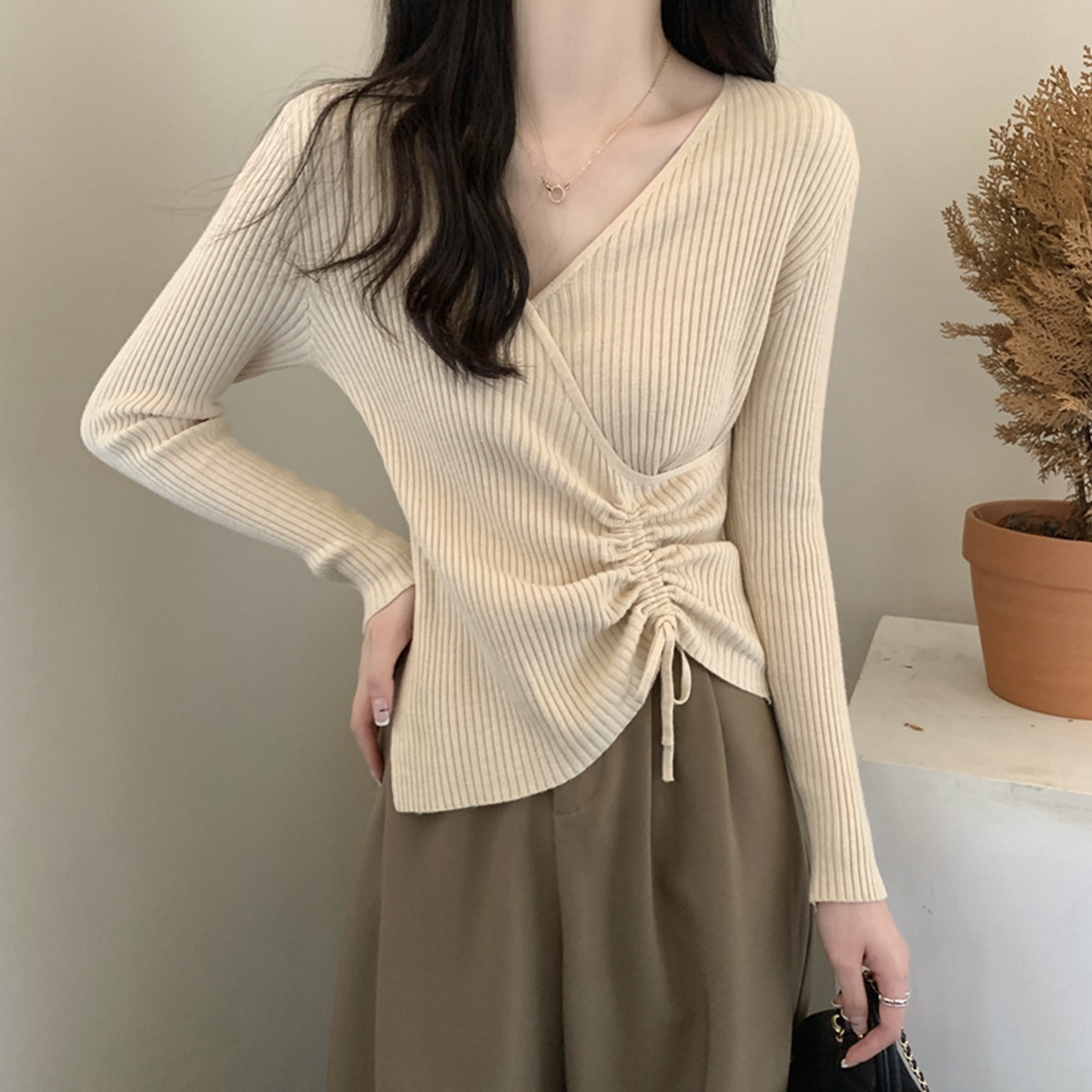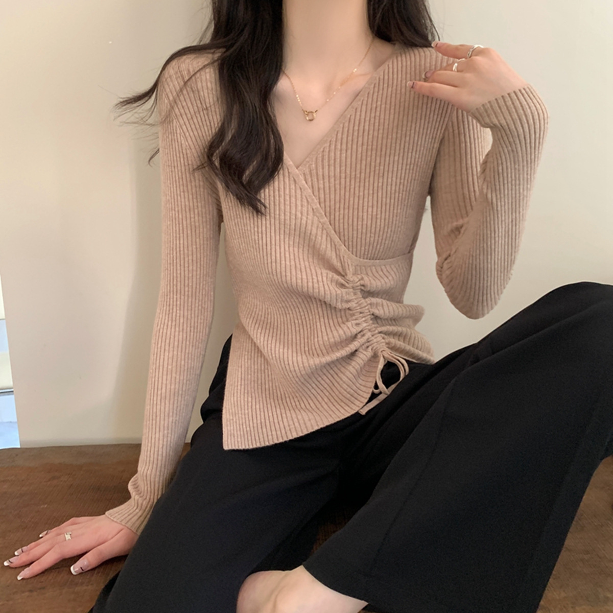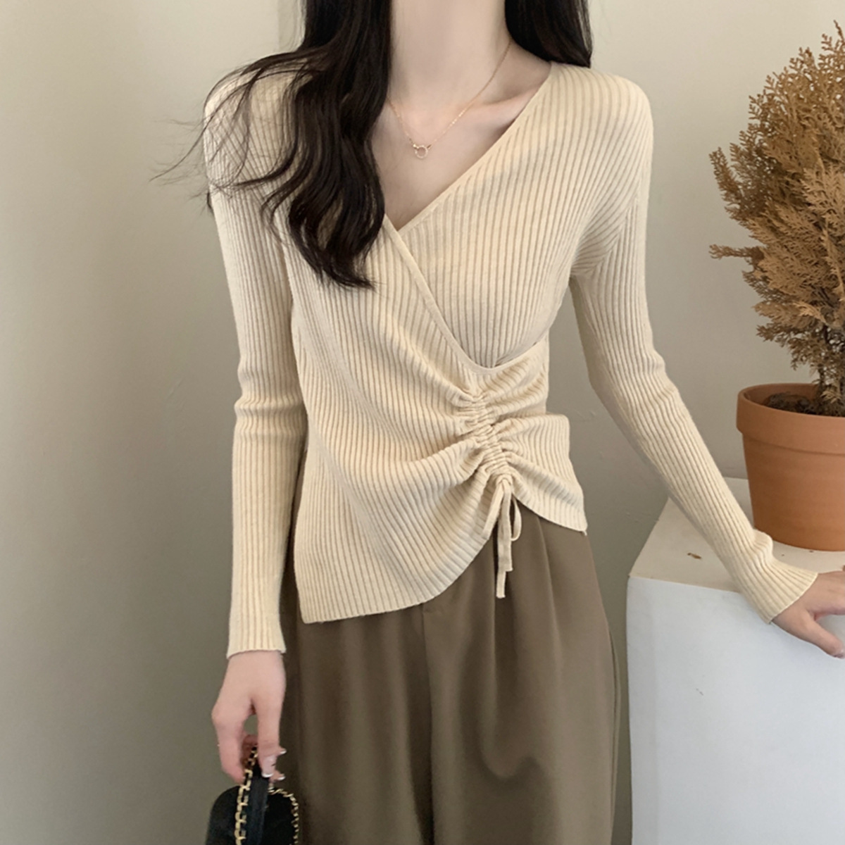 가을과 겨울 V-넥 니트 베이스 셔츠 여성용 내부 착용 가을과 겨울 프랑스 허리 불규칙한 스웨터 긴팔 스웨터 탑