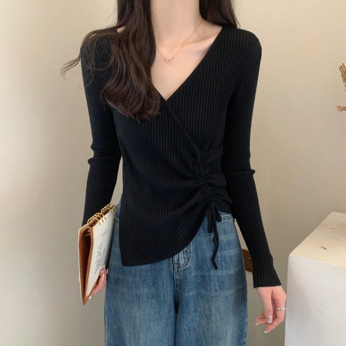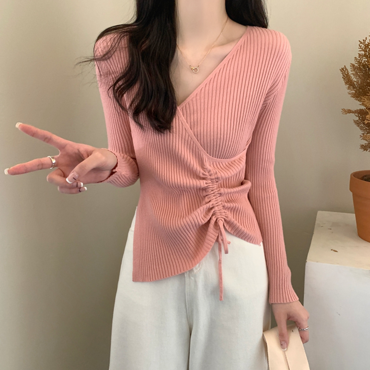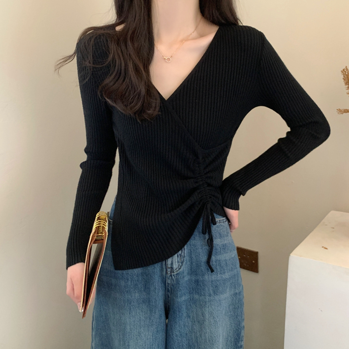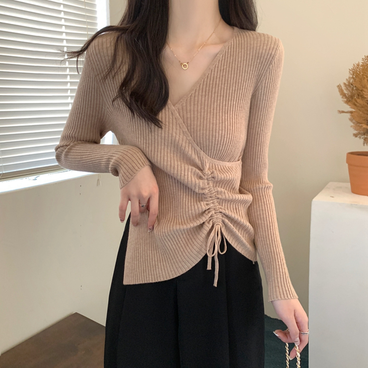 가을과 겨울 V-넥 니트 베이스 셔츠 여성용 내부 착용 가을과 겨울 프랑스 허리 불규칙한 스웨터 긴팔 스웨터 탑