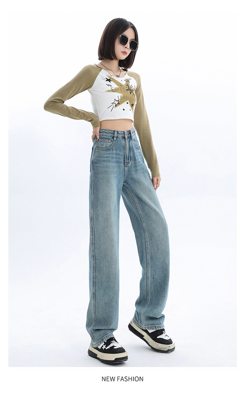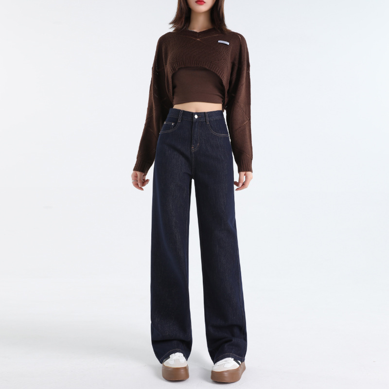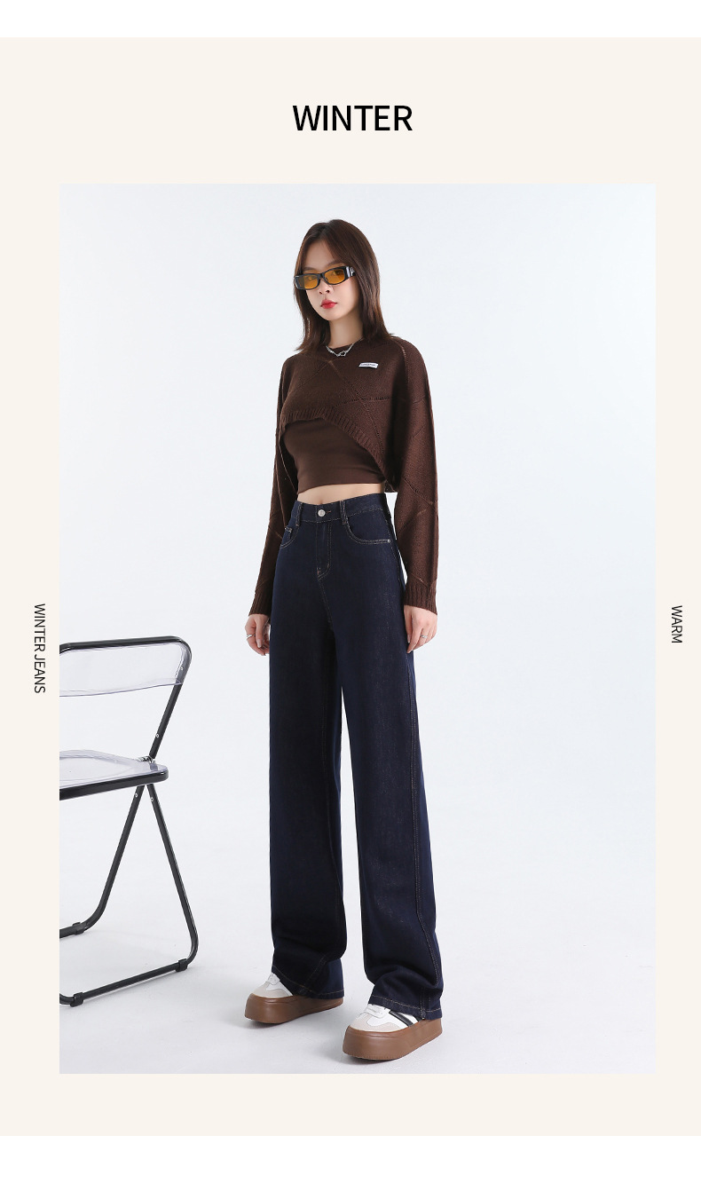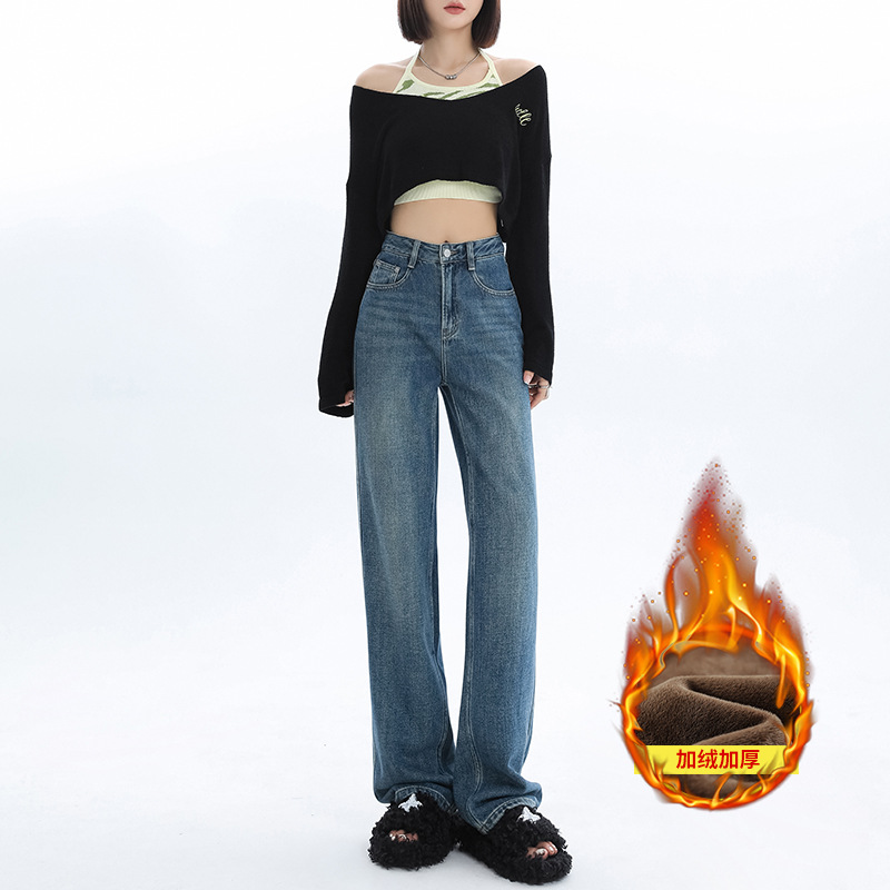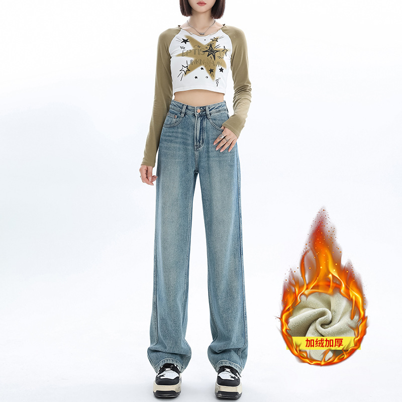 여성용 가을 겨울 신상 넓은 다리 청바지, 벨벳 안감, 두꺼운 고허리, 작은 키에도 잘 어울리는 루즈핏 스트레이트 바지스토어 가기