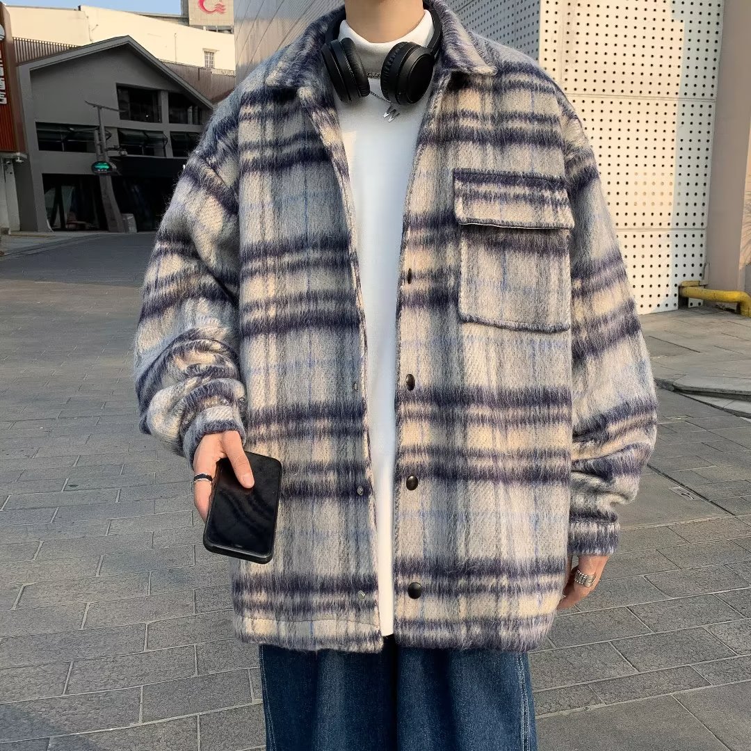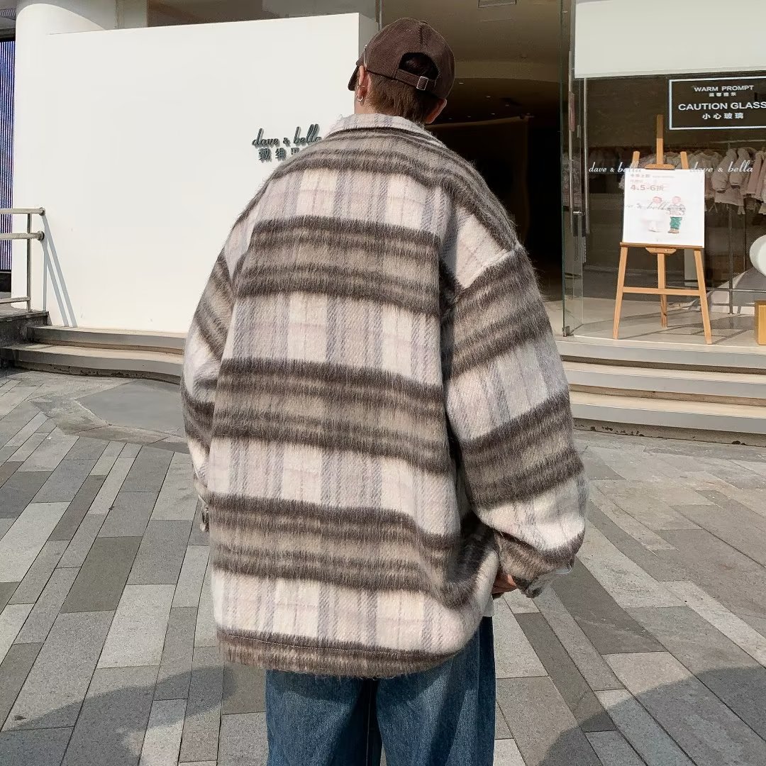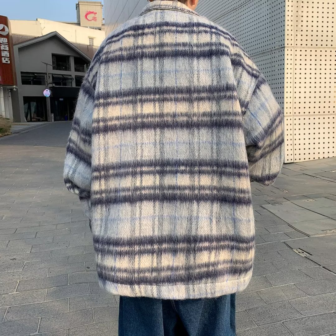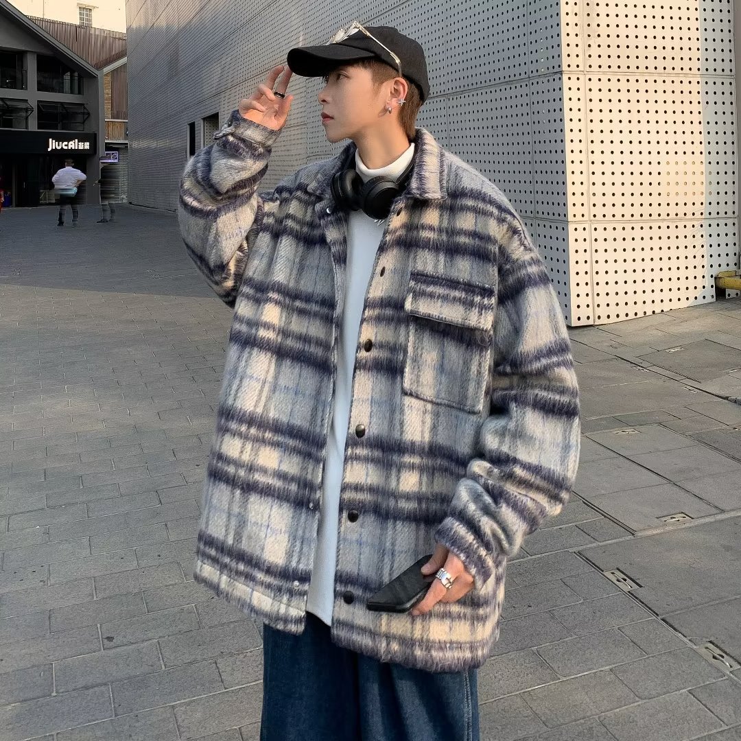 남성과 여성을위한 모직 격자 무늬 재킷 가을과 겨울 새로운 캐주얼 느슨한 미국 패션 브랜드 재킷 디자인 감각 틈새스토어 가기