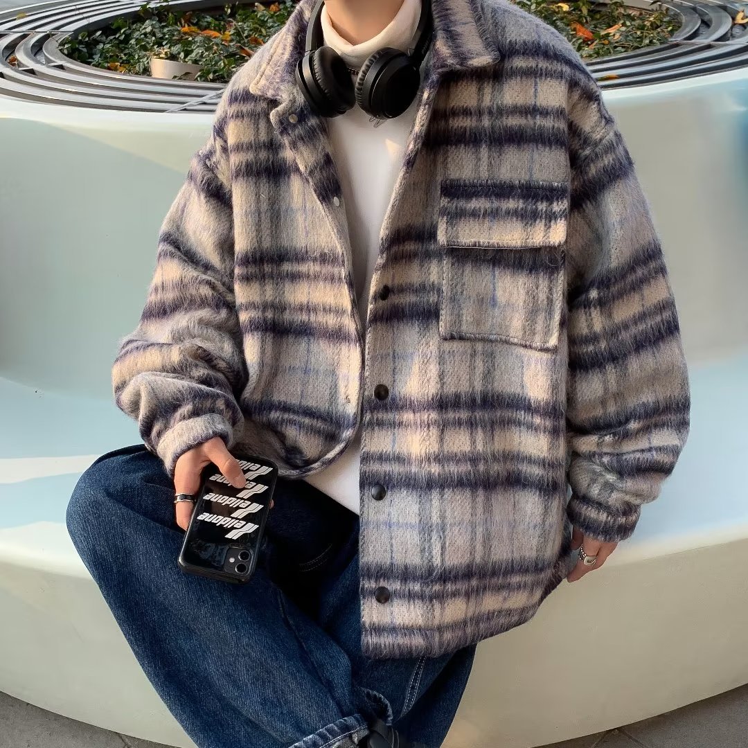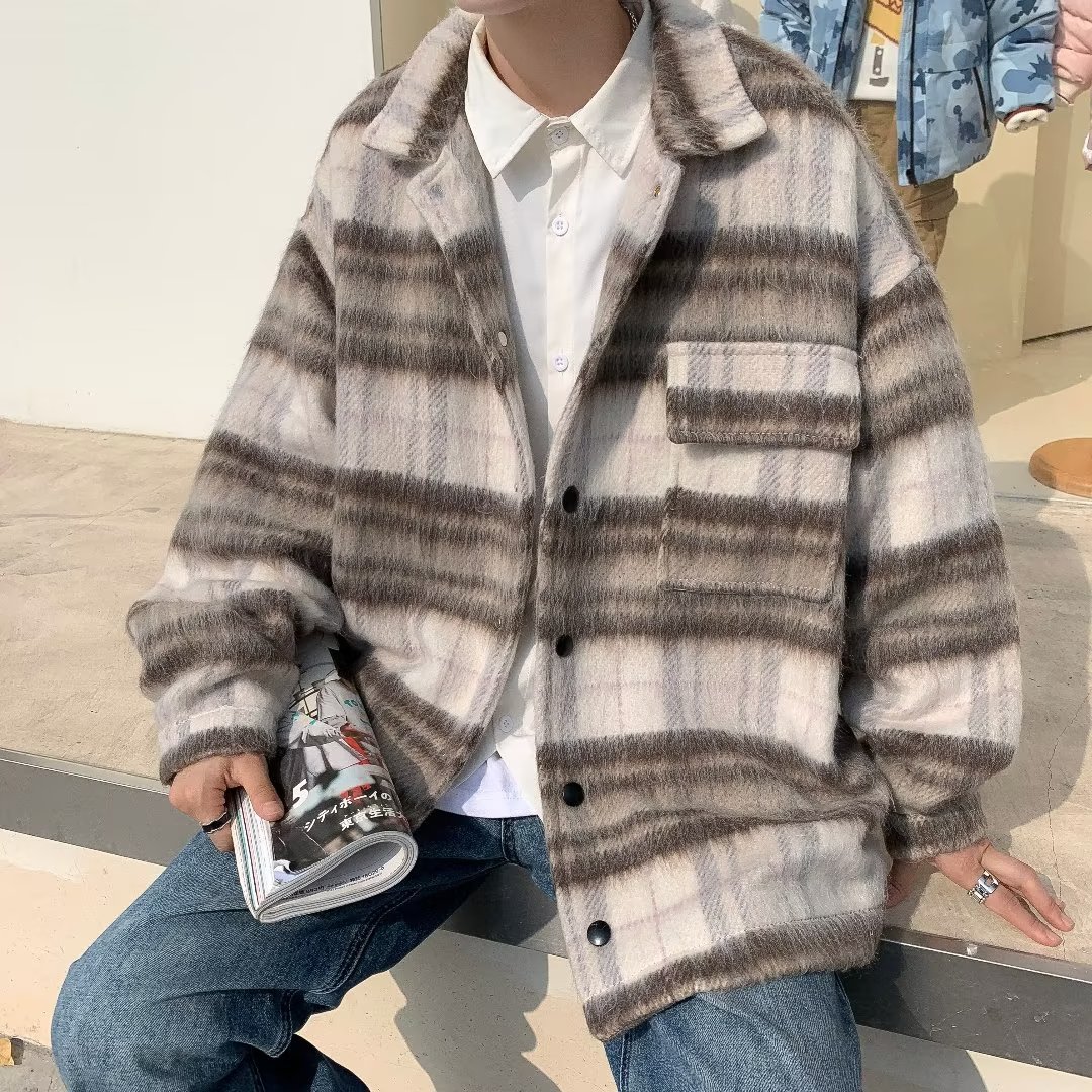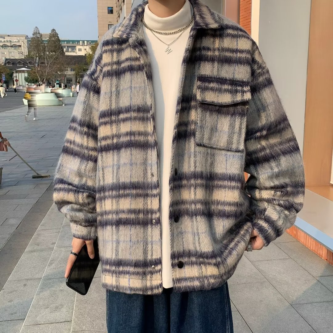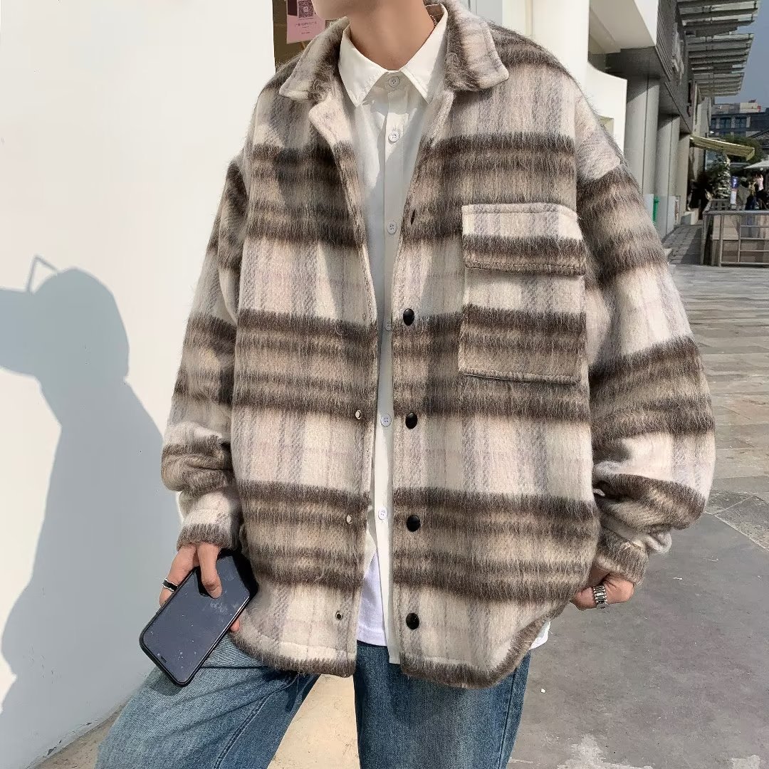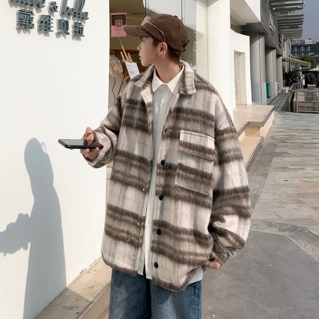남성과 여성을위한 모직 격자 무늬 재킷 가을과 겨울 새로운 캐주얼 느슨한 미국 패션 브랜드 재킷 디자인 감각 틈새스토어 가기