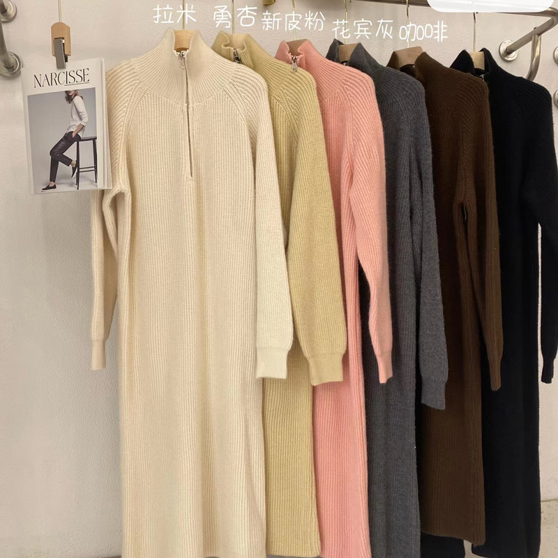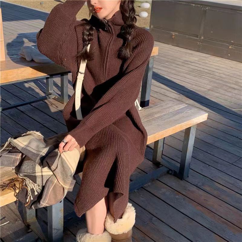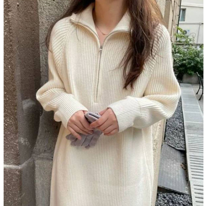 니트 풀오버 스웨터 여성용 겨울 지퍼 두꺼운 한국식 무릎 위 중간 길이 하이 넥 느슨한 내부 스웨터 원피스