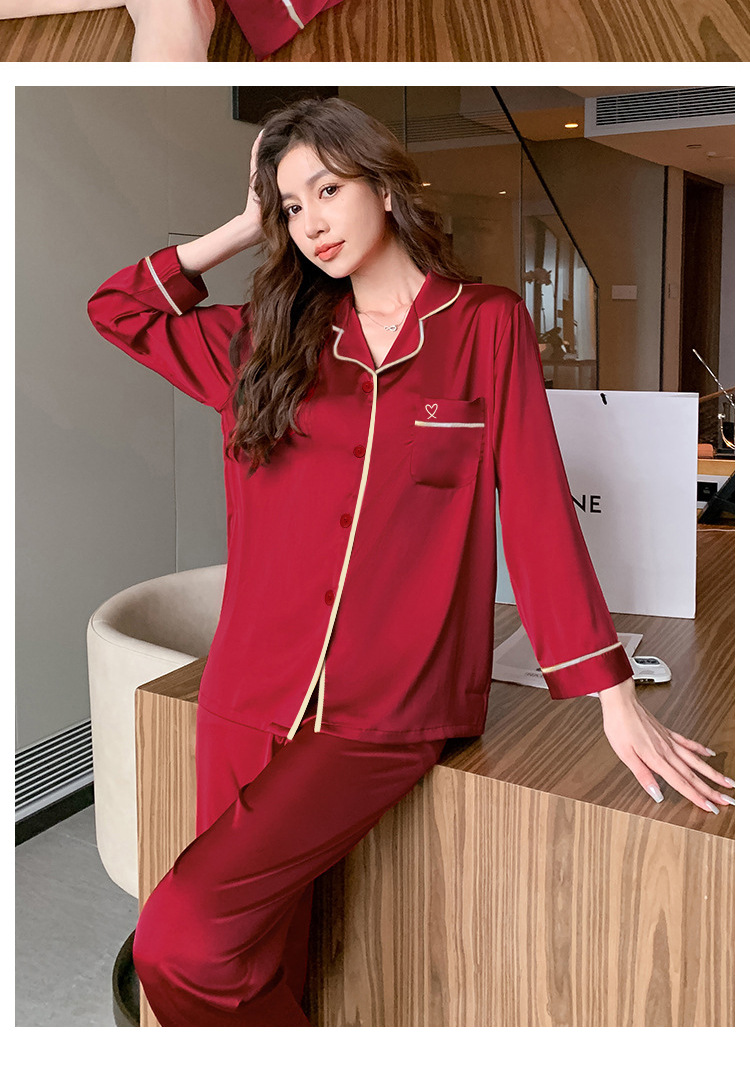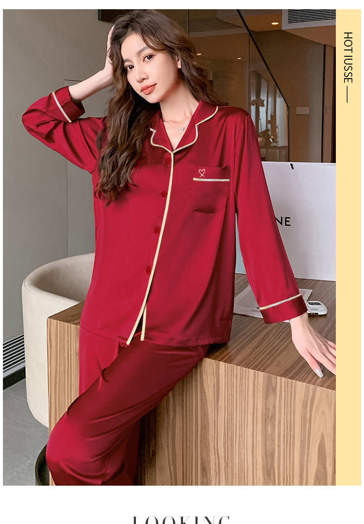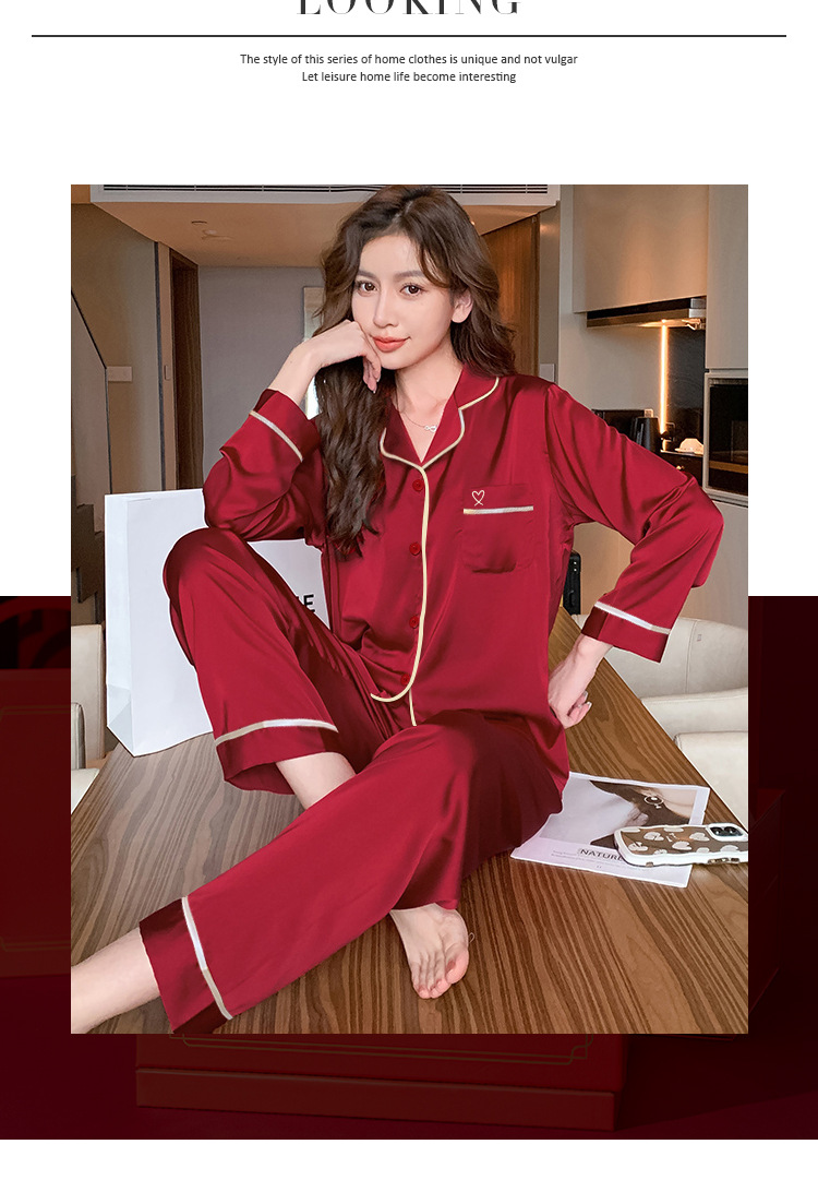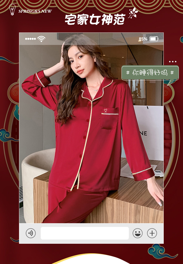 봄과 여름 조디악 년 여성을위한 하이 엔드 잠옷 아이스 실크 레드 웨딩 신혼 솔리드 컬러 홈웨어 세트 도매스토어 가기