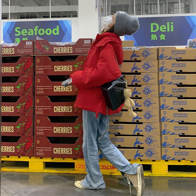 Bermingnian 빨간 다운 재킷 여자의 짧은 작은 2023 새로운 겨울 고급 감각 튀김 거리 새해 코트스토어 가기