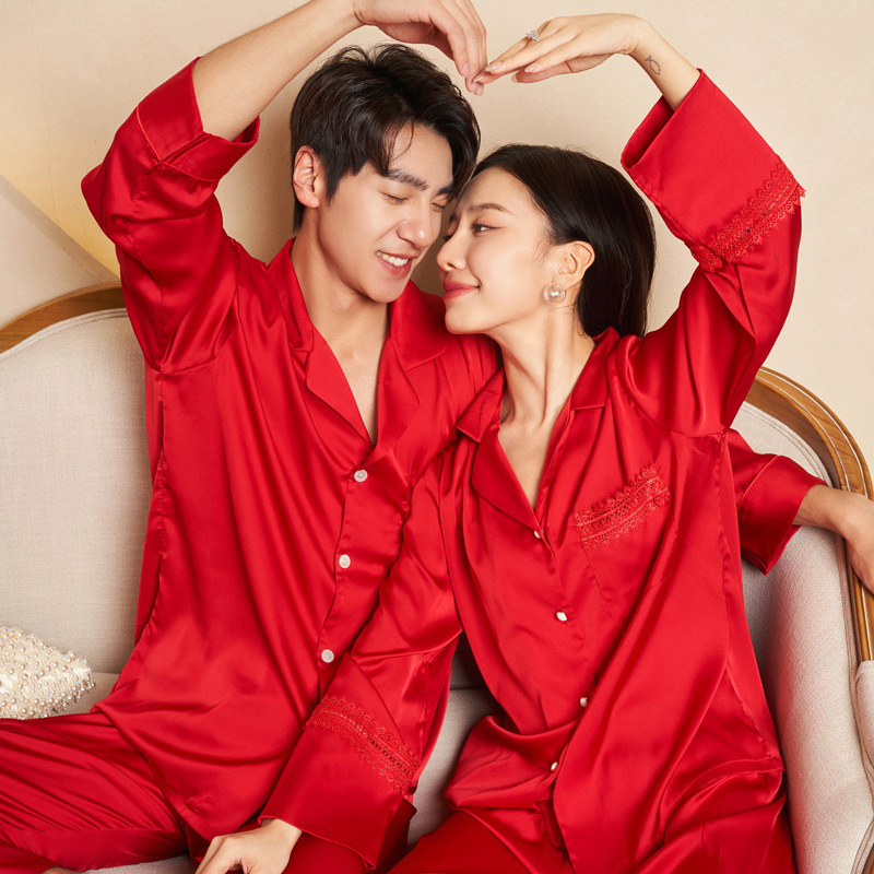 강남허 25년 가을 신상 커플 잠옷 긴팔 레드 더블 레이스 웨딩 축하 여성용 아이스 실크 홈웨어