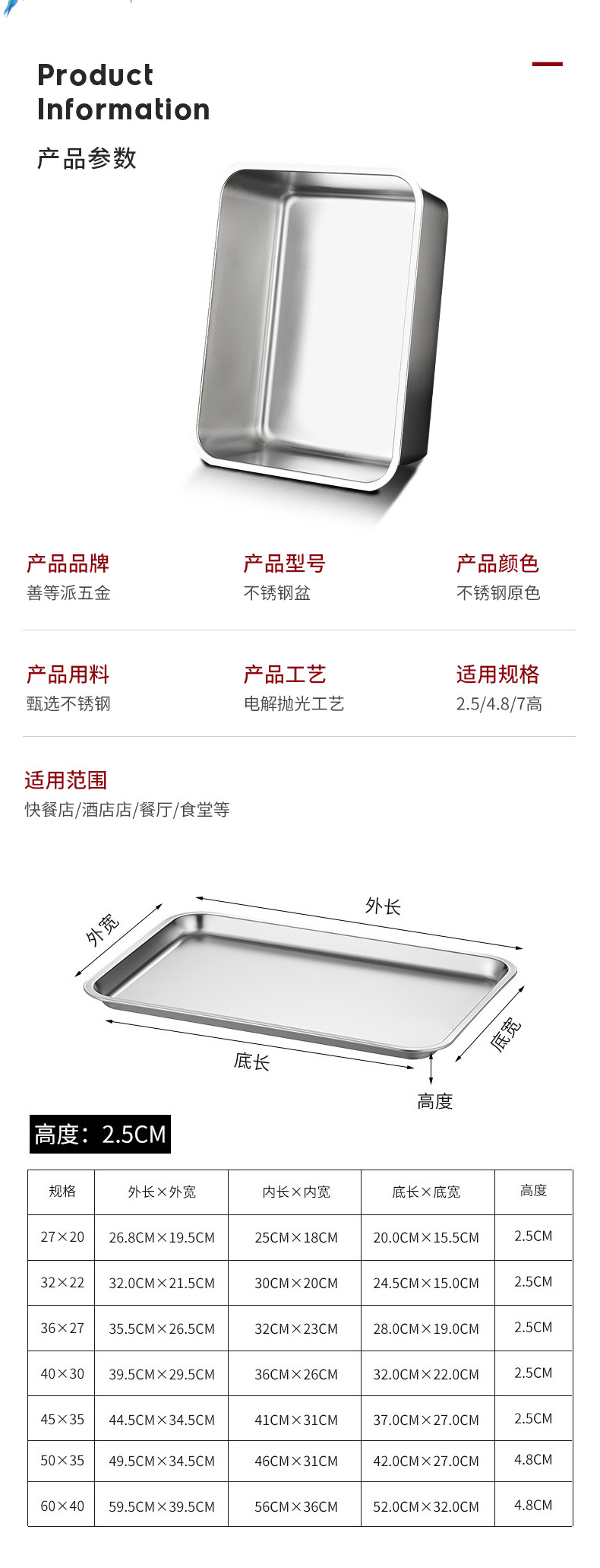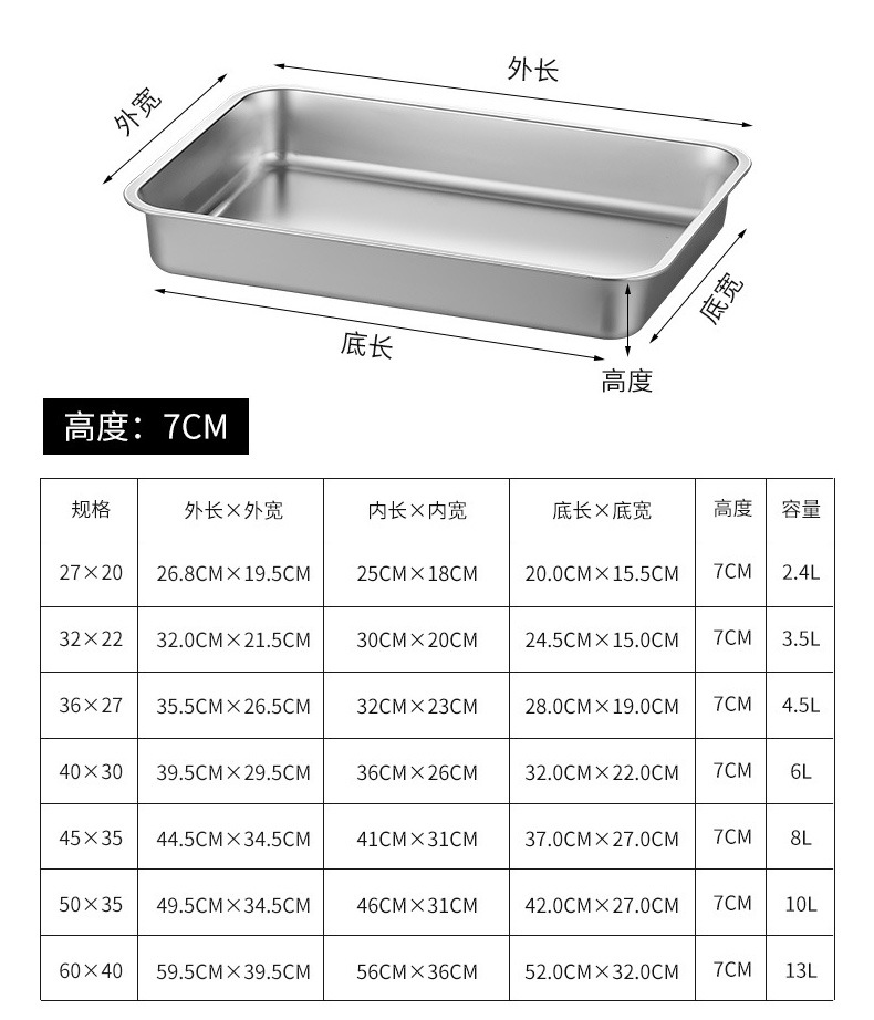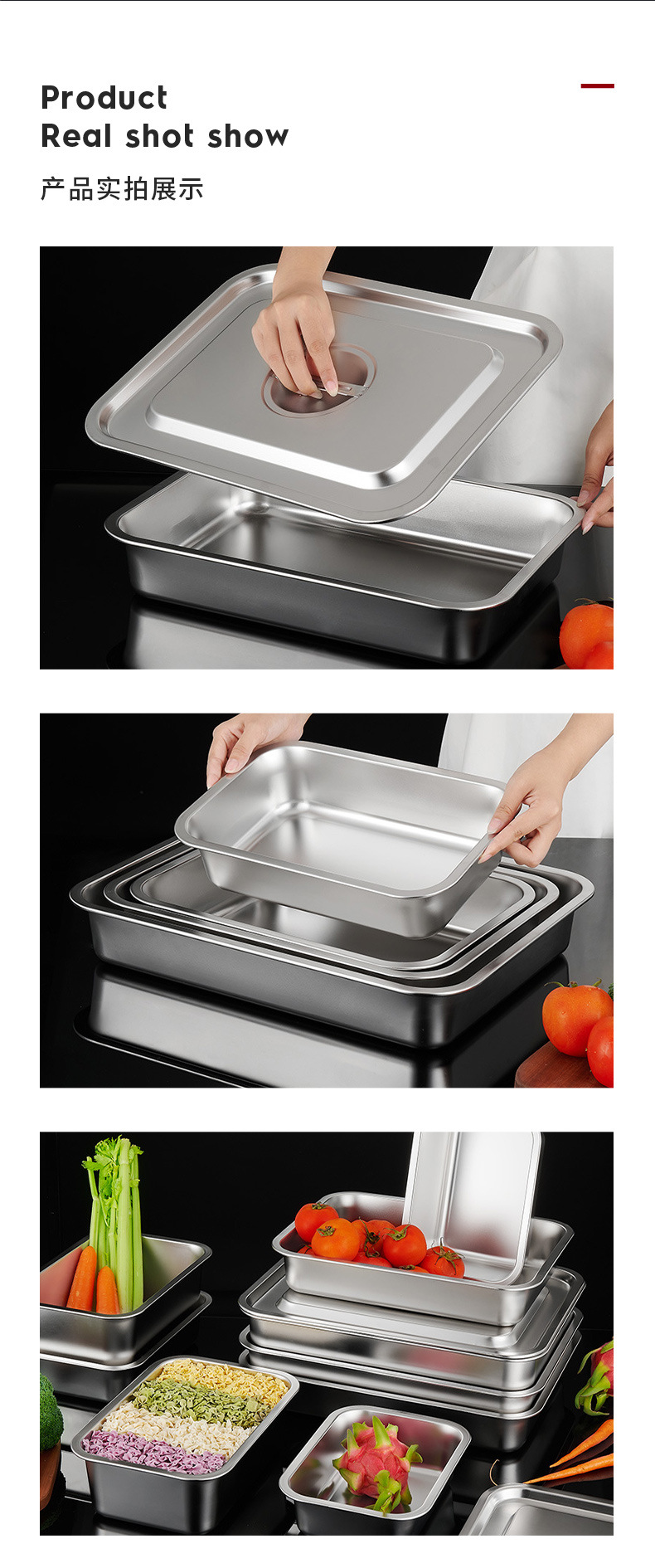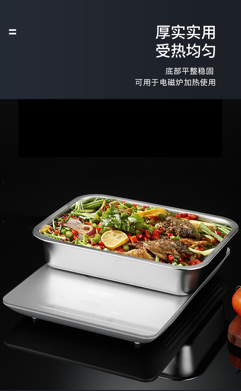 스테인레스 스틸 분지 직사각형 플레이트 부분 분지 평면 바닥 사각 분지 깊은 트레이 패스트 푸드 뚜껑이있는 야채 분지 사각 상자