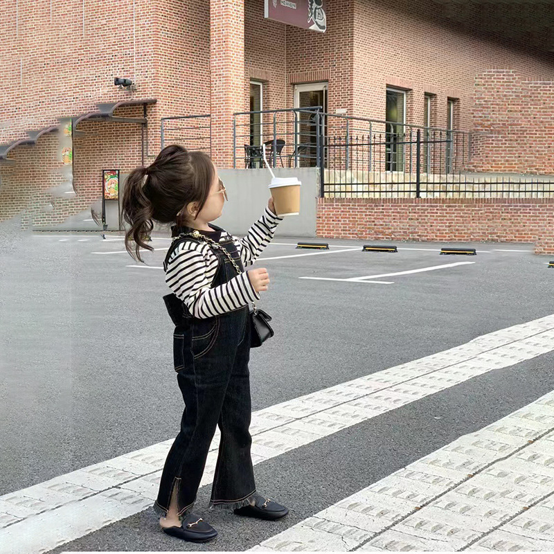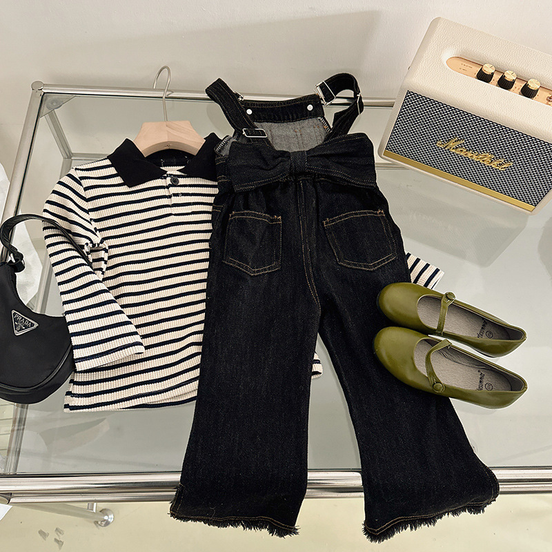 여아 아동복 봄 가을 보우 데님 멜빵 바지 세트 한국식 스트라이프 폴로 셔츠 긴팔 투피스 세트