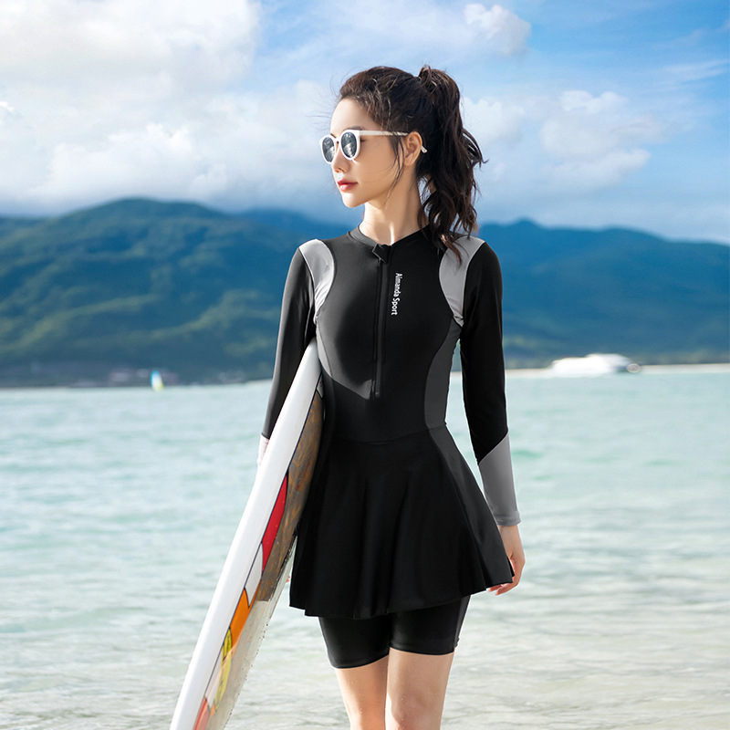 2023 새로운 긴팔 자외선 차단제 원피스 수영복 여성용 보수적 인 배꼽 덮기 슬림 스커트 온천 플러스 사이즈 단색 수영복스토어 가기