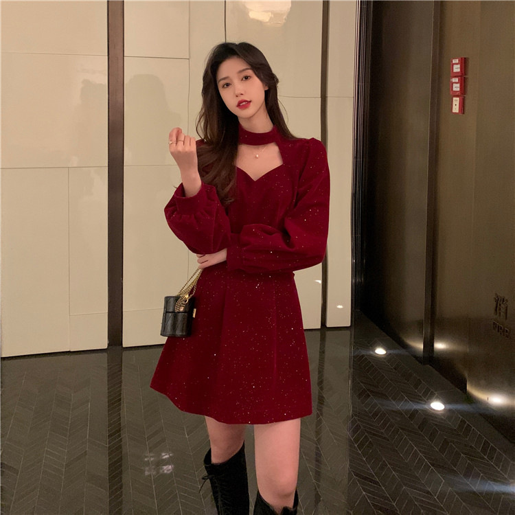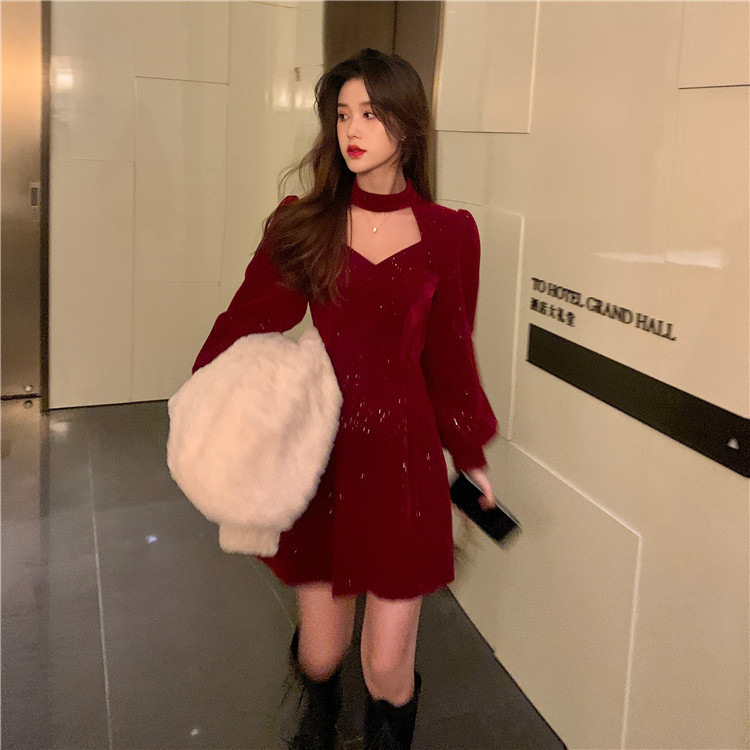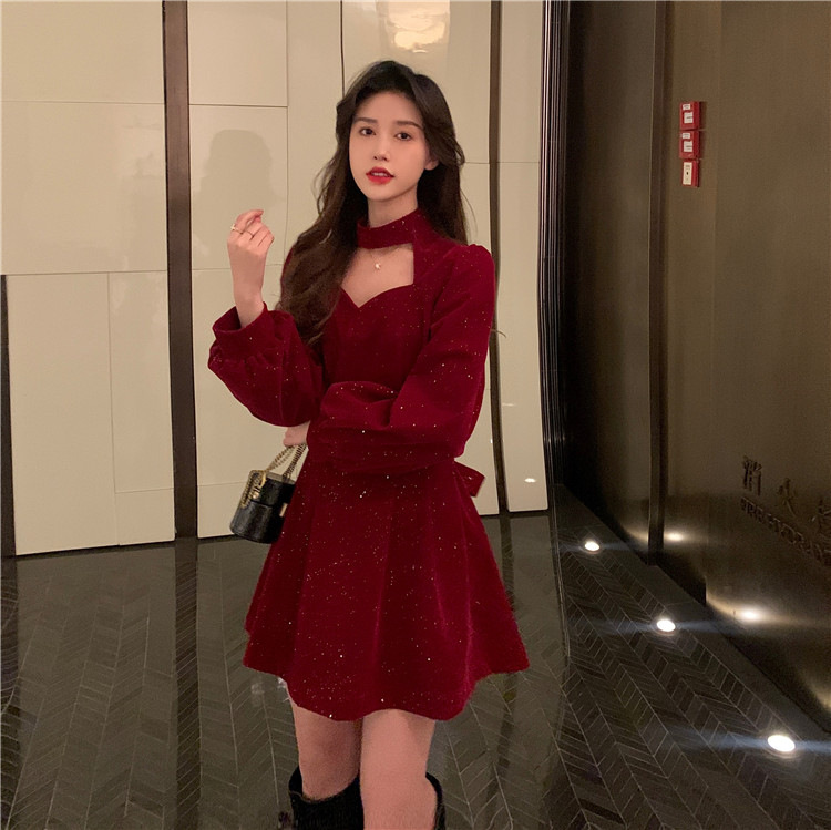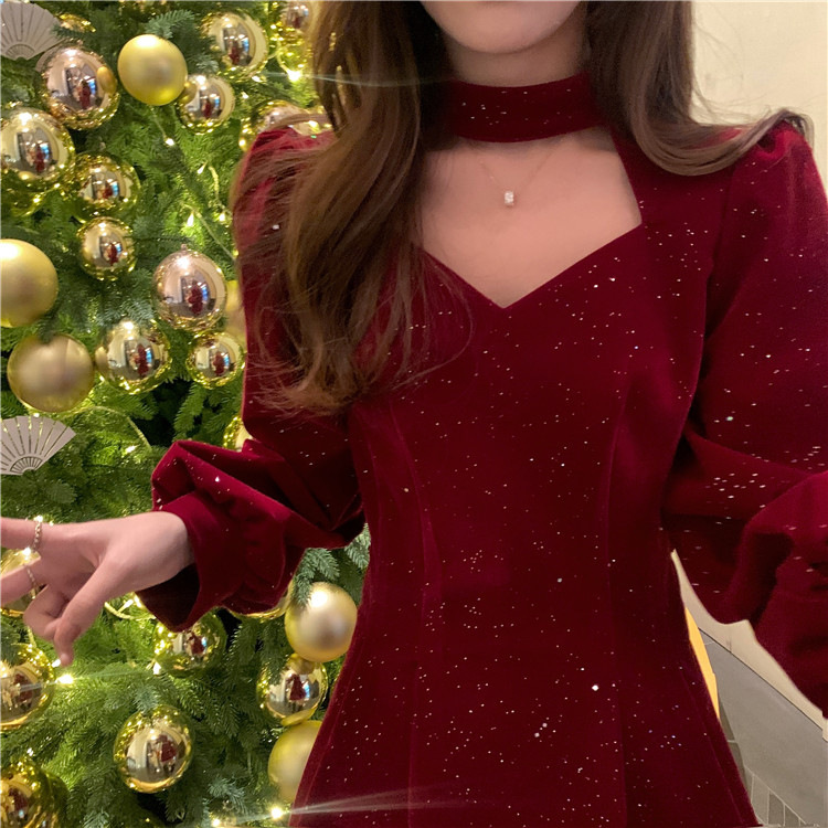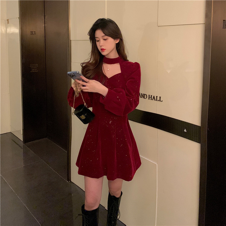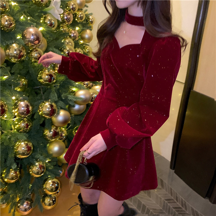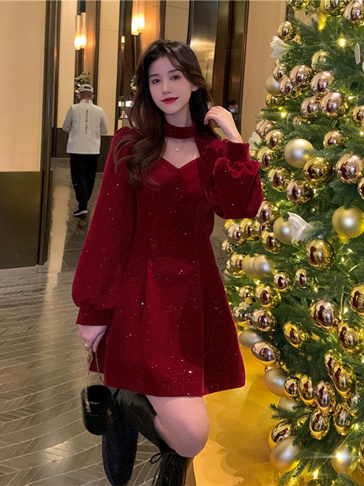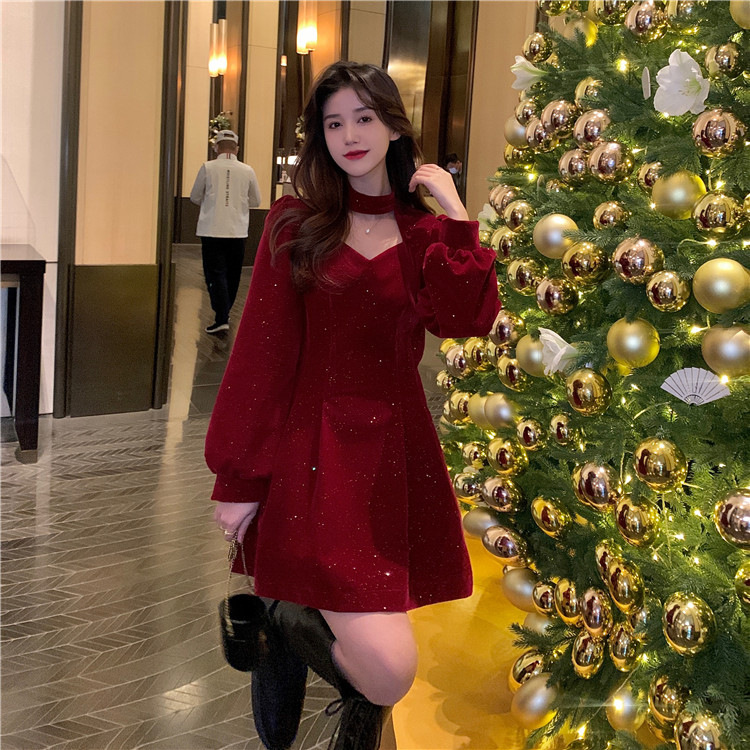 크리스마스 레드 연례 회의 자매 벨벳 원피스 가을과 겨울 새로운 기질 주의 기계 디자인 감각 원피스 여성의 원피스