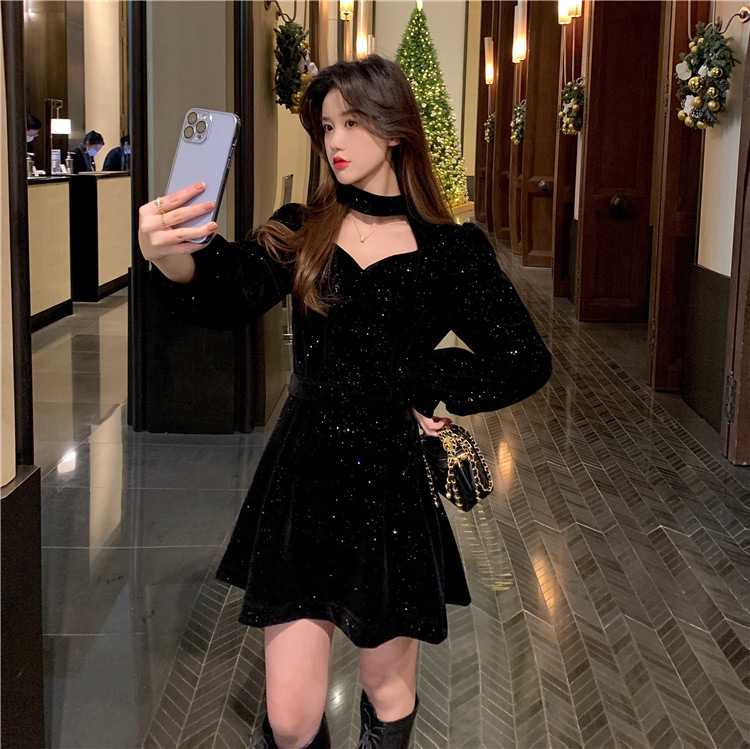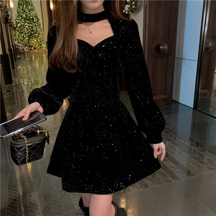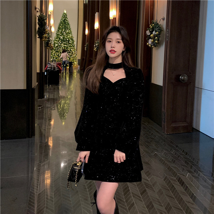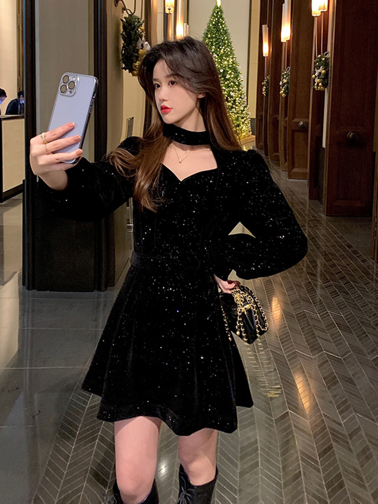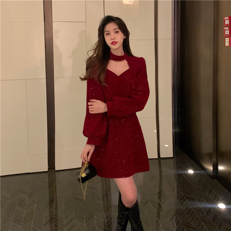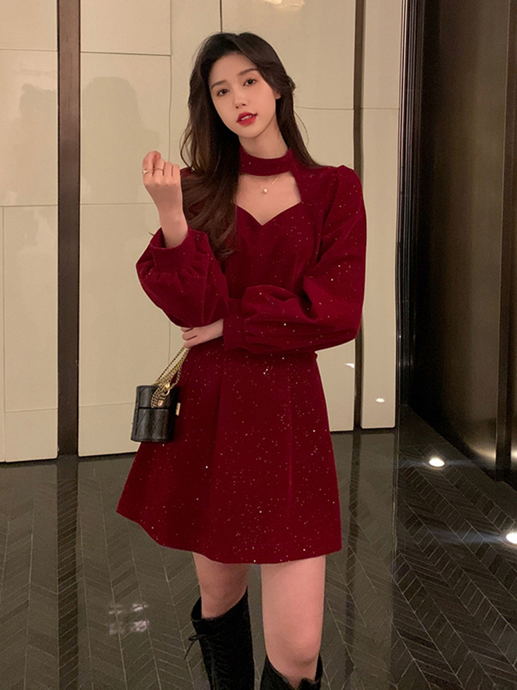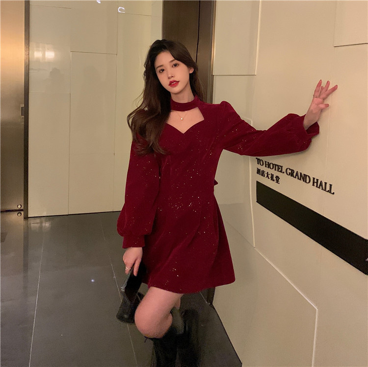 크리스마스 레드 연례 회의 자매 벨벳 원피스 가을과 겨울 새로운 기질 주의 기계 디자인 감각 원피스 여성의 원피스