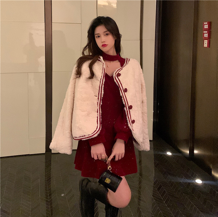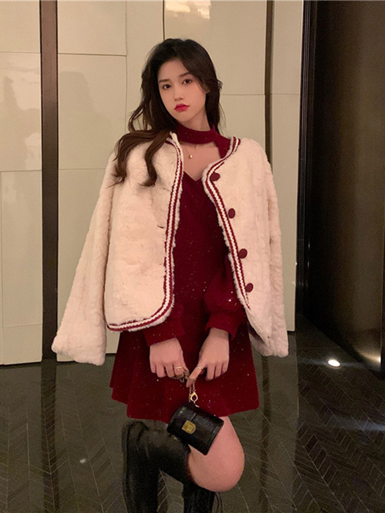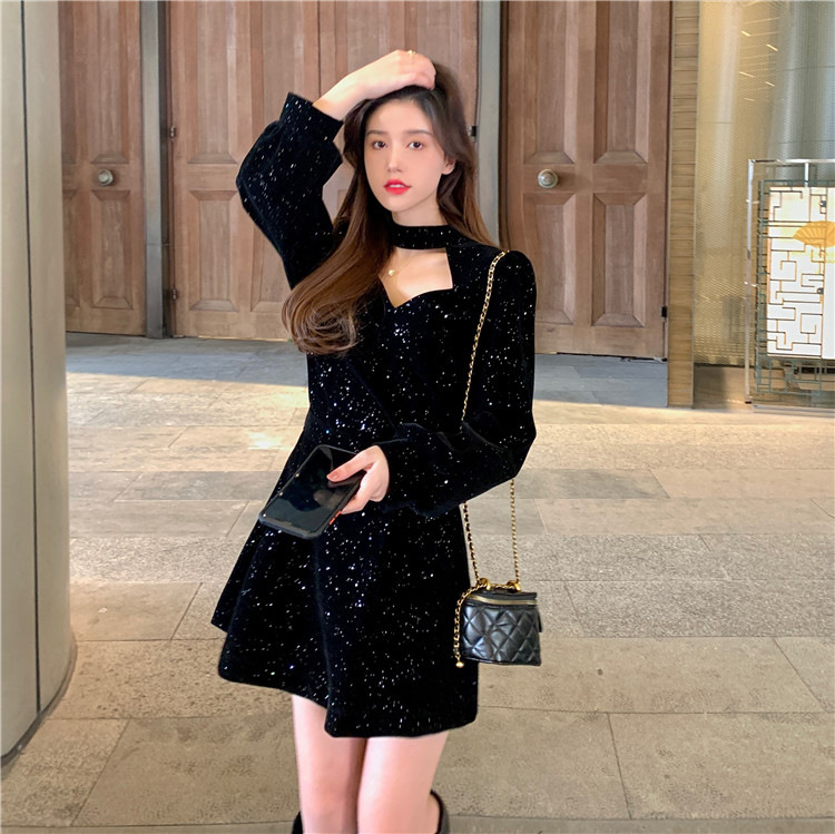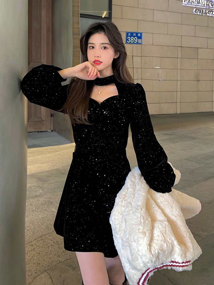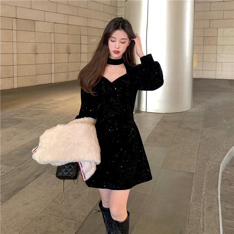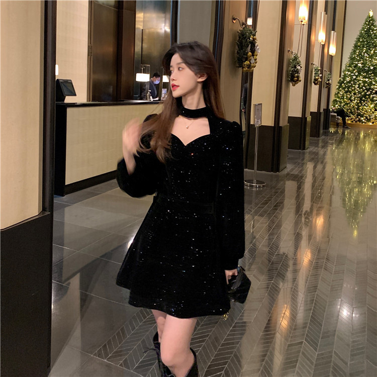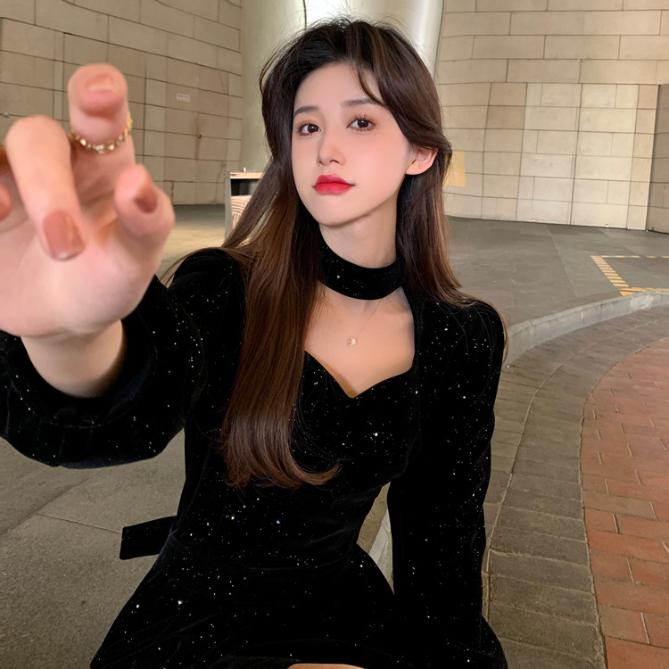 크리스마스 레드 연례 회의 자매 벨벳 원피스 가을과 겨울 새로운 기질 주의 기계 디자인 감각 원피스 여성의 원피스