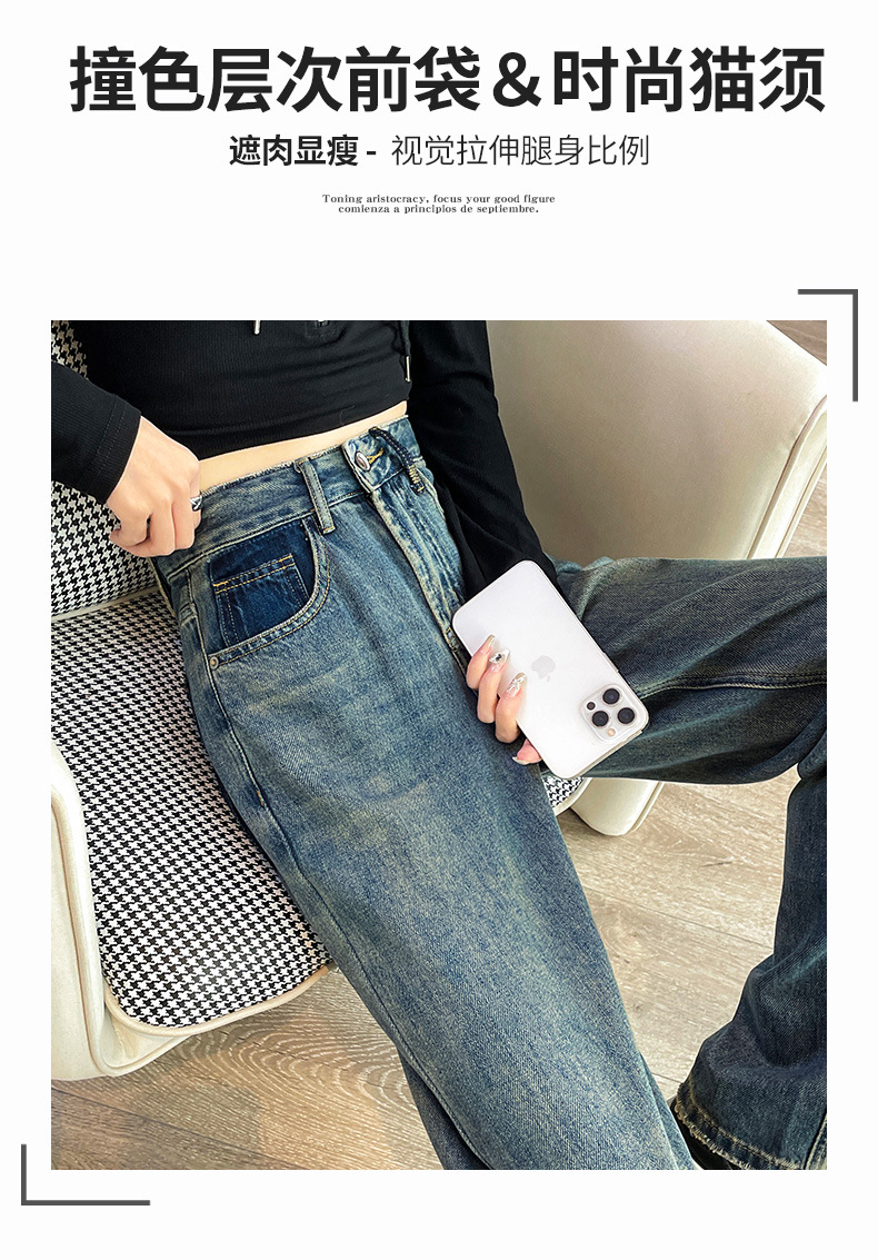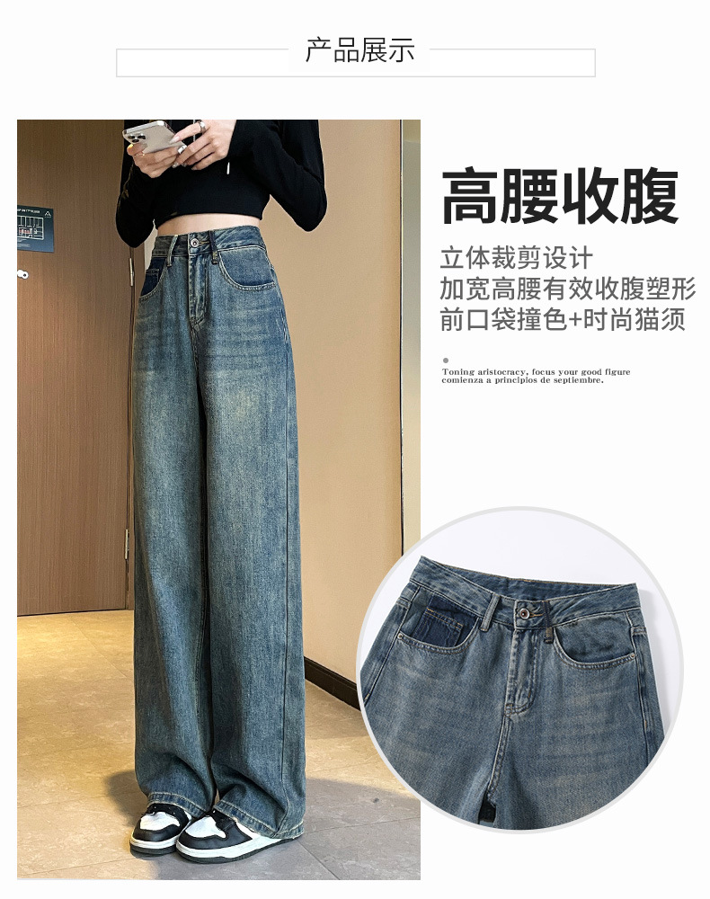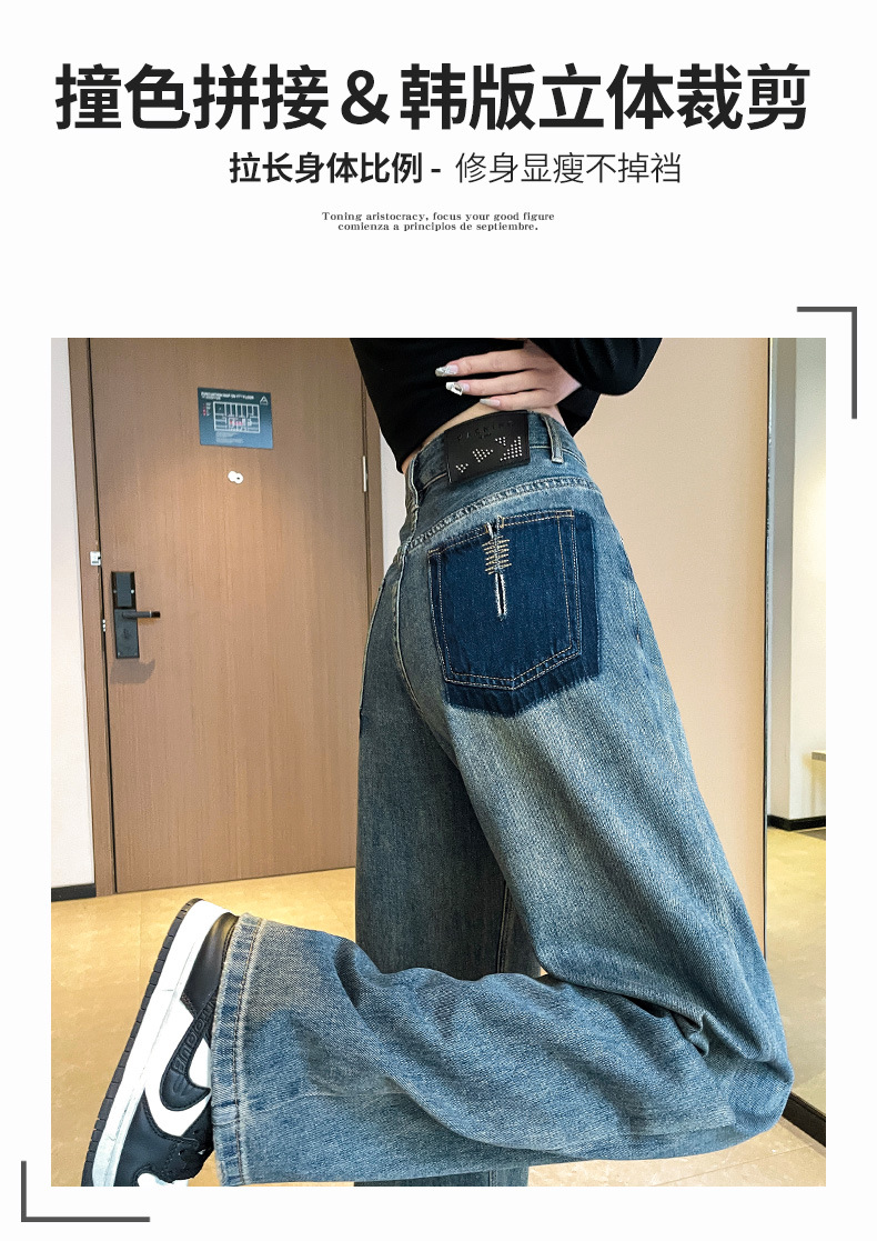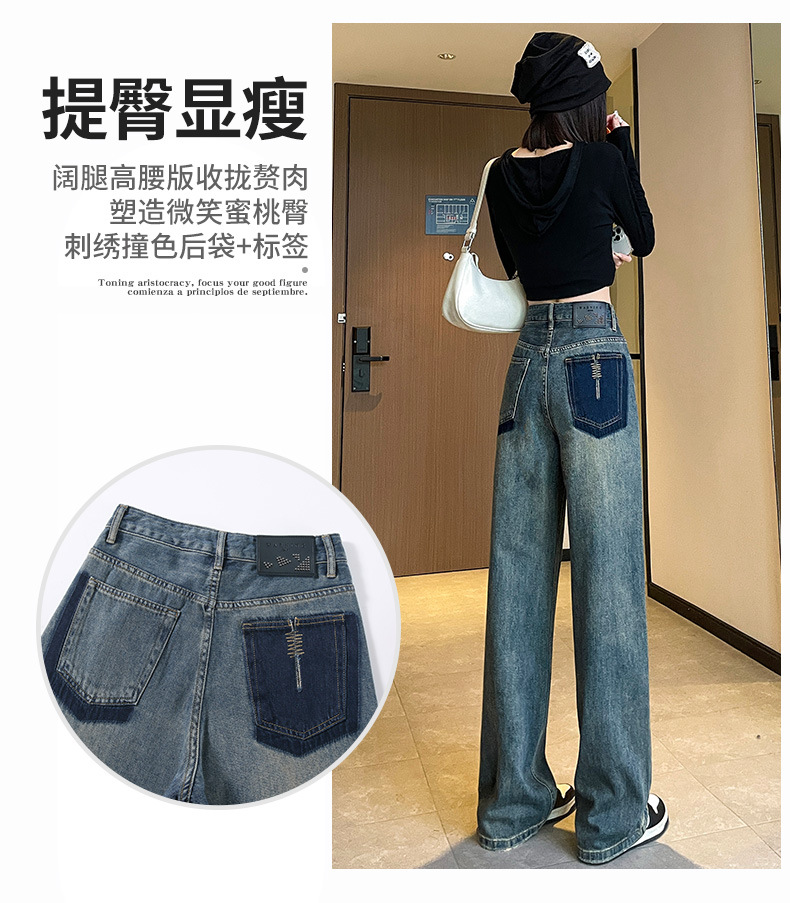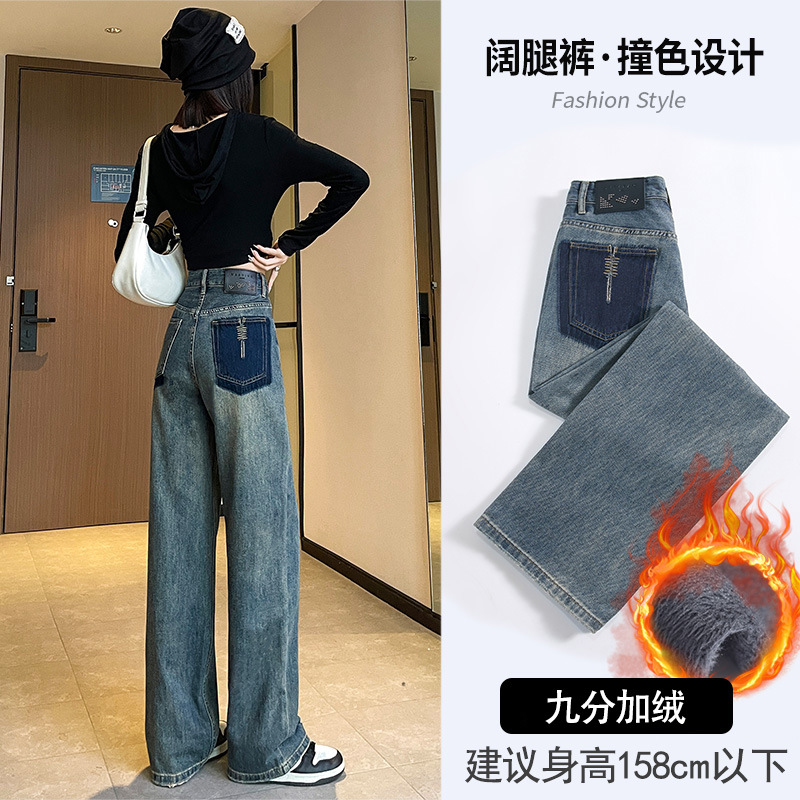 여성용 하이웨이스트 와이드 레그 캐주얼 청바지, 대비되는 색상, 복고풍 루즈 드레이프, 2024 가을 겨울 신상 슬리밍 바지스토어 가기