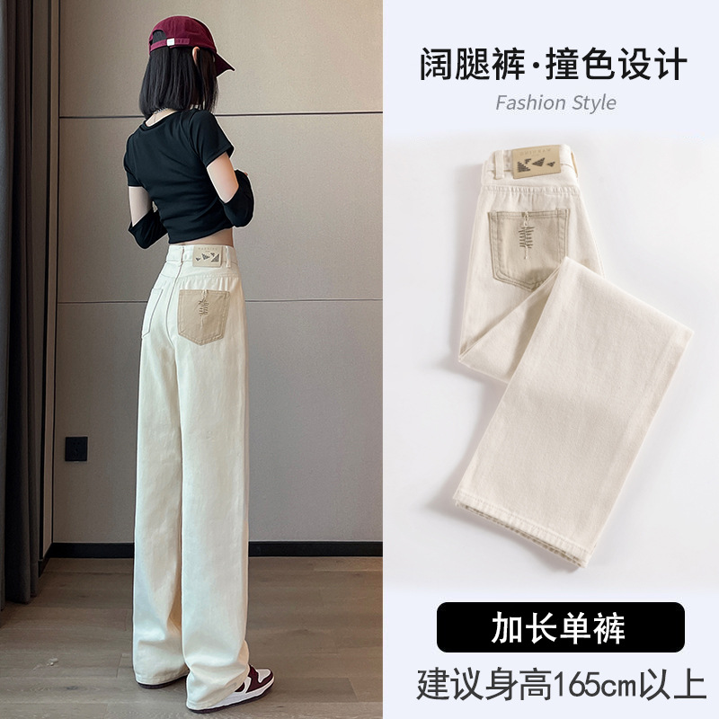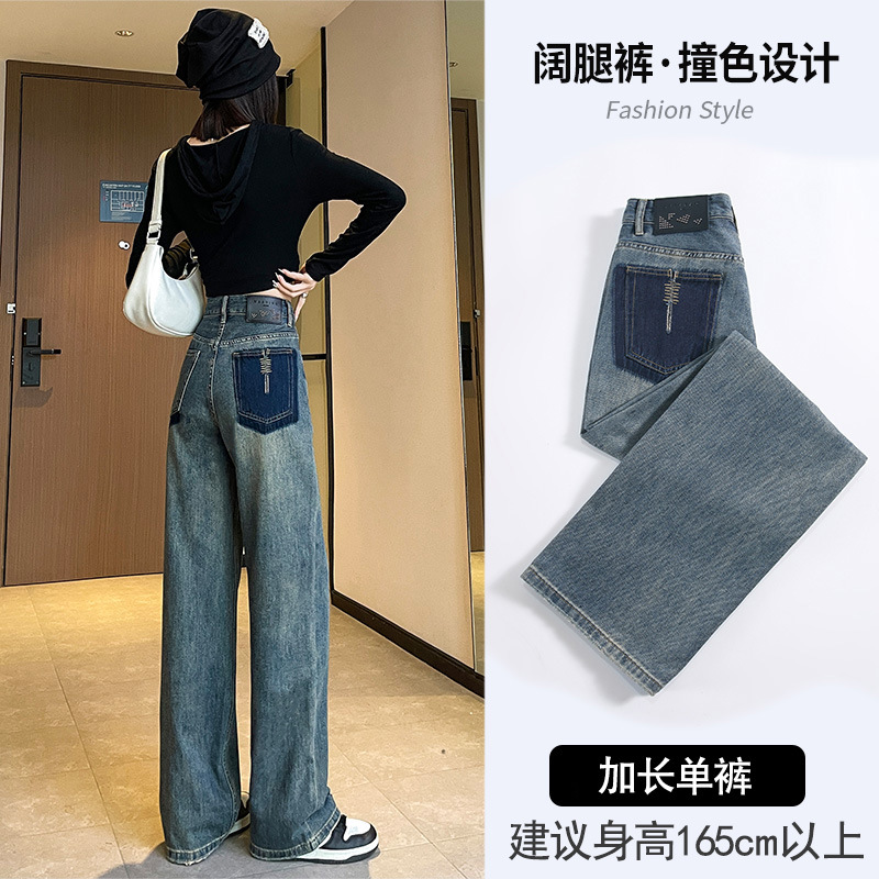 여성용 하이웨이스트 와이드 레그 캐주얼 청바지, 대비되는 색상, 복고풍 루즈 드레이프, 2024 가을 겨울 신상 슬리밍 바지