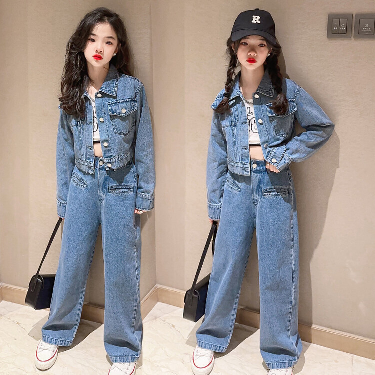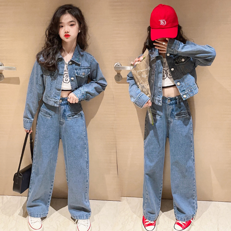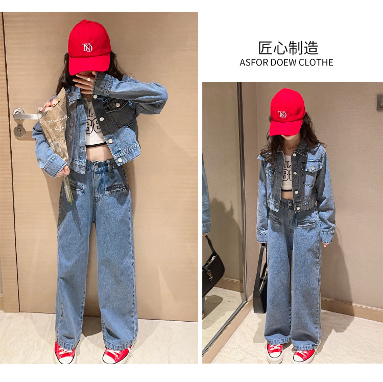 여아 데님 세트 2023 가을 새로운 어린이 느슨한 캐주얼 데님 코트 데님 와이드 레그 팬츠 투피스 세트스토어 가기