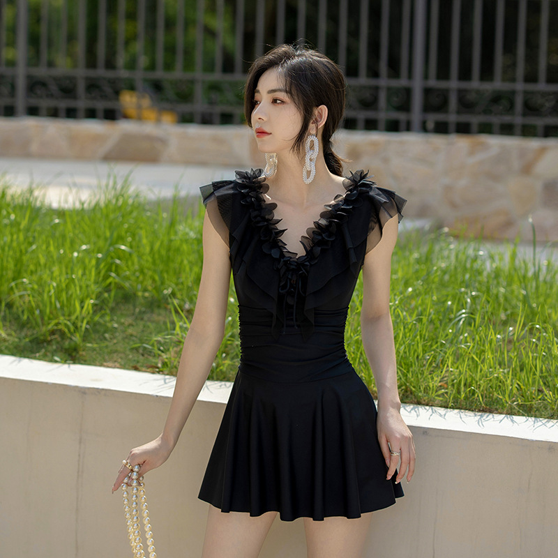여성을 위한 새로운 원피스 수영복, 러플 여신 스타일, 섹시한 등이 없는 온천 수영복, 스커트 스타일, 배를 커버하고 슬리밍 수영복, 여성용스토어 가기