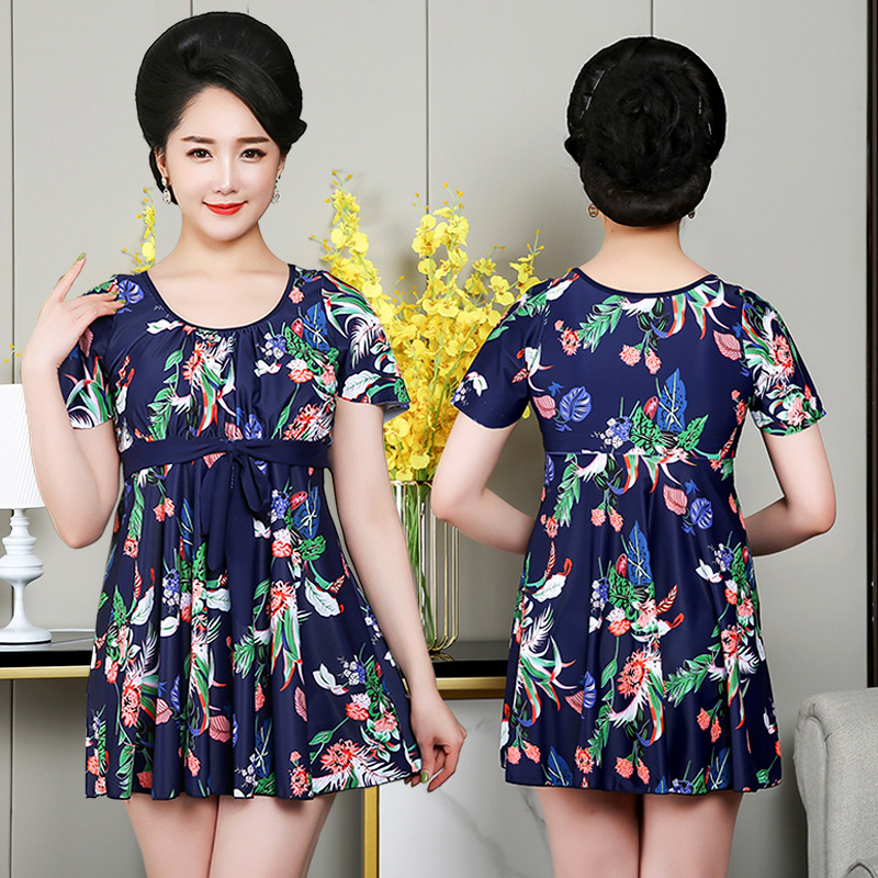 중년 및 노인 어머니 보수적이고 뚱뚱한 증가 수영복 여자의 통통녀 분할 치마 소매 배꼽 덮는 수영복 온천 도매스토어 가기