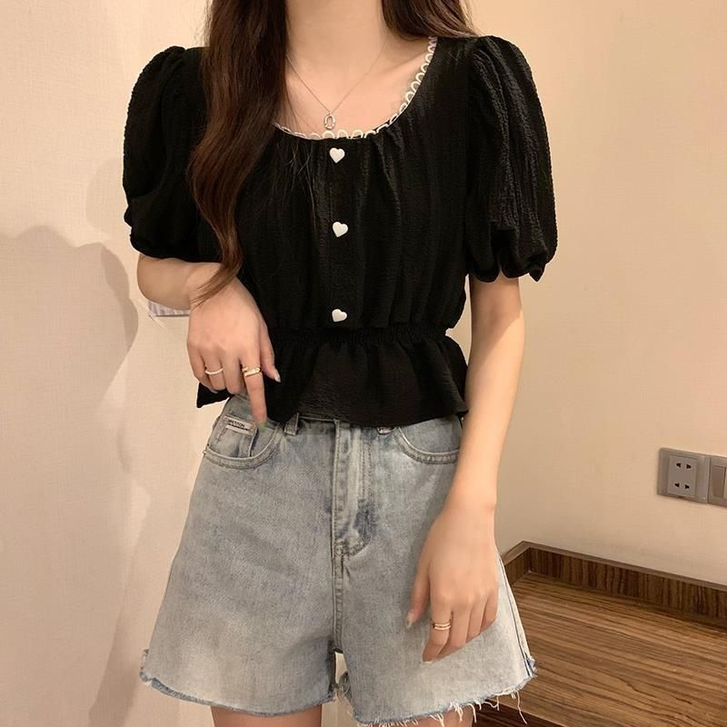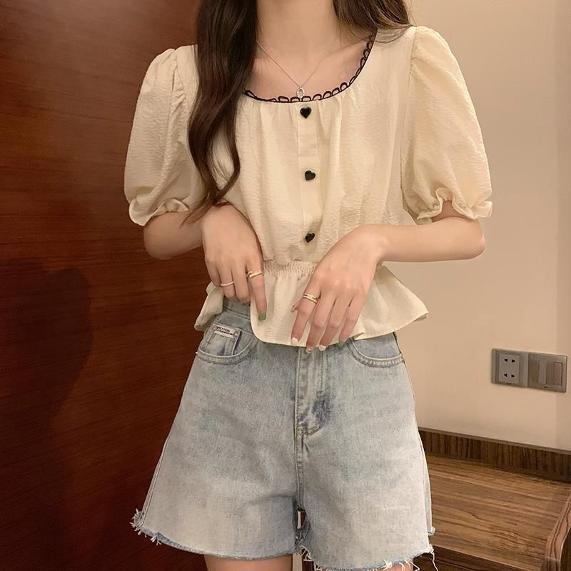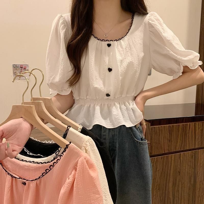 재고 달콤한 스퀘어 칼라 쉬폰 셔츠 여성의 여름 2022 부드러운 스타일 틈새 디자인 흰색 짧은 탑 여름
