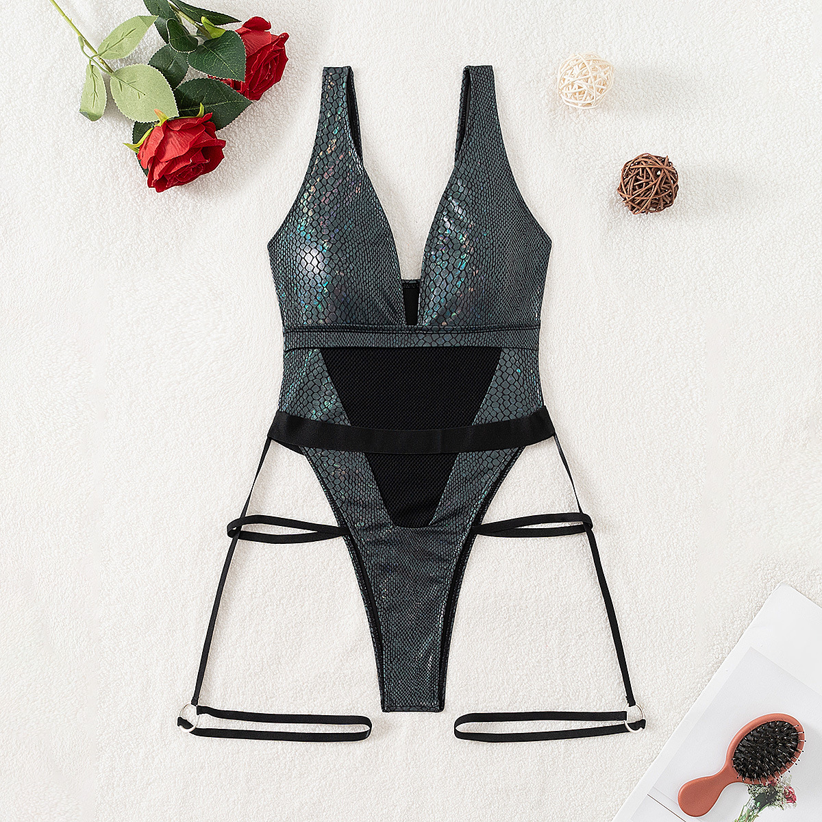 유럽과 미국의 새로운 깊은 V 섹시 타이트 원피스 수영복 금박 메쉬 바느질 여성의 비키니 비키니 재고