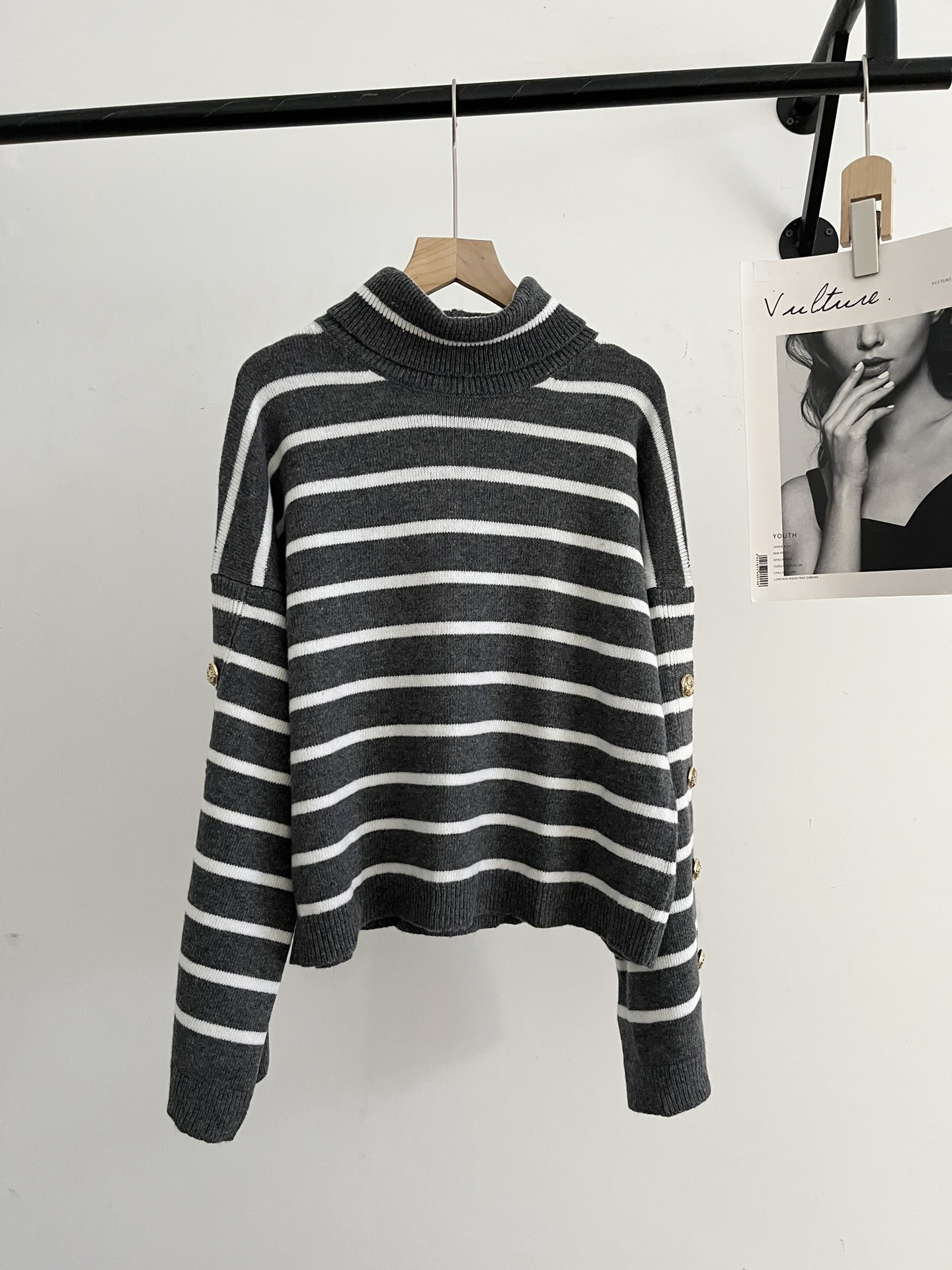 MD 스타일 가을 새로운 슬림 핏 버튼 장식 터틀넥 스트라이프 스웨터