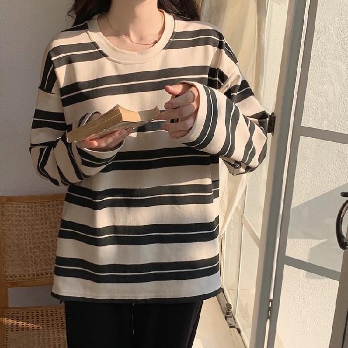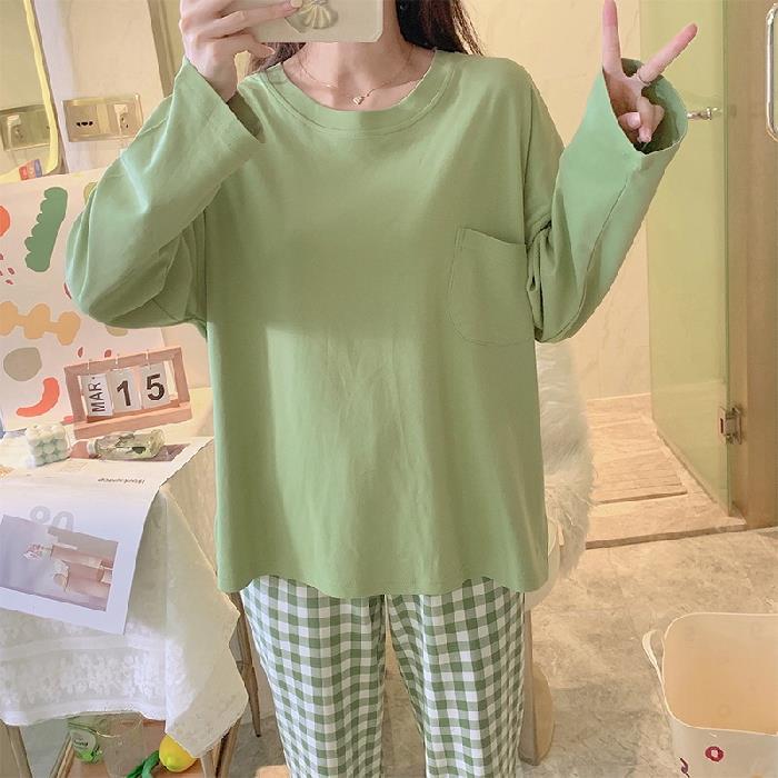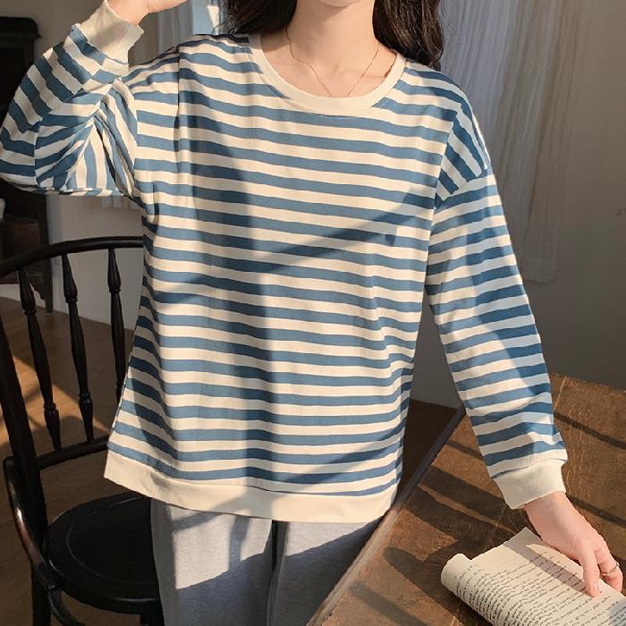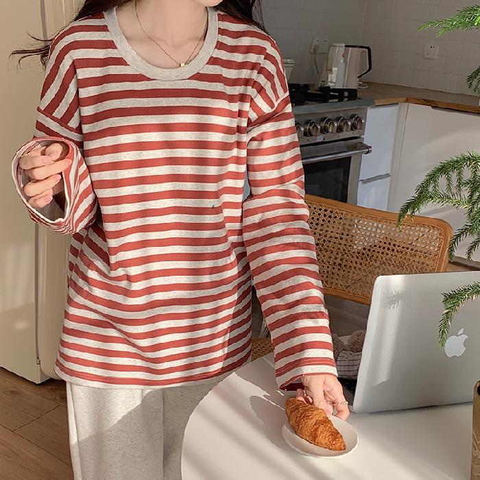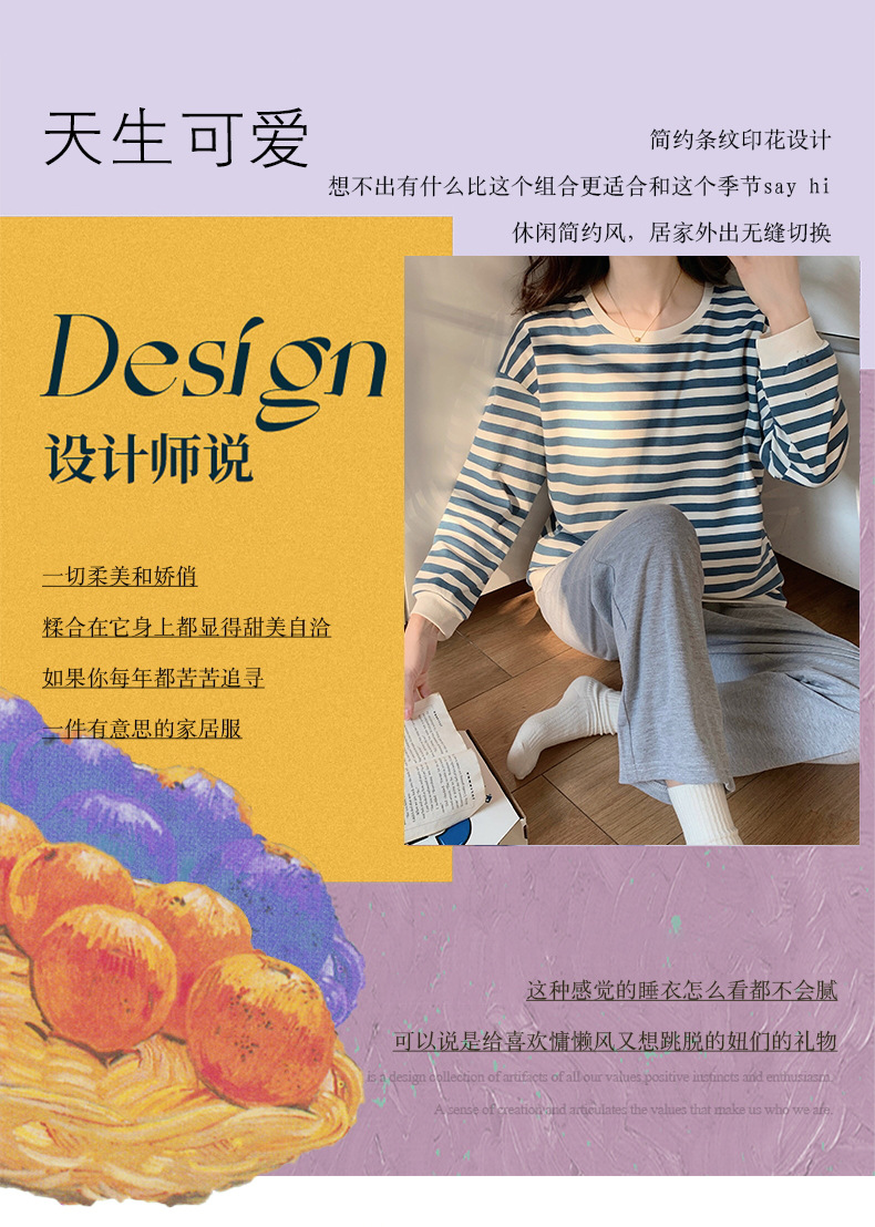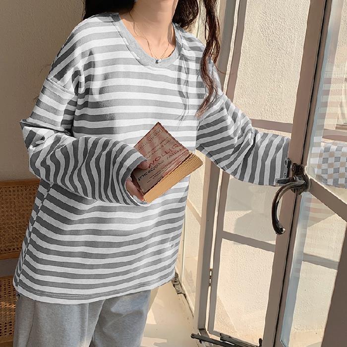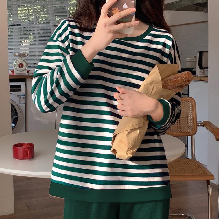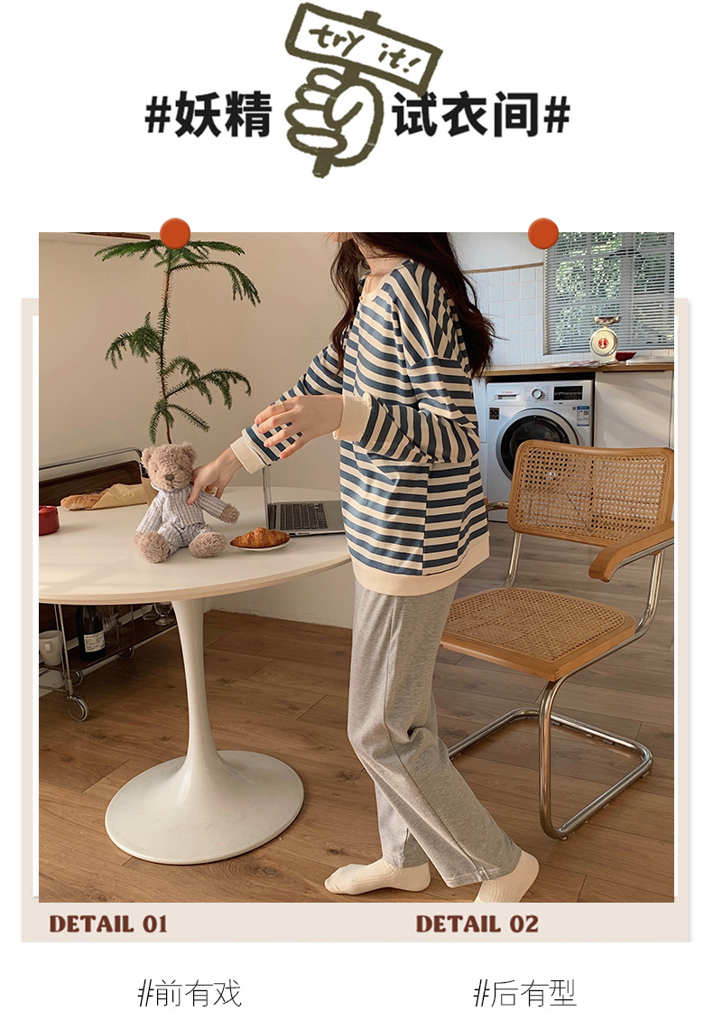 가슴 패드가있는 잠옷 봄 여성의 긴 소매 2023 간단한 봄과 가을 줄무늬 소녀의 가정복 세트 면 일본식스토어 가기