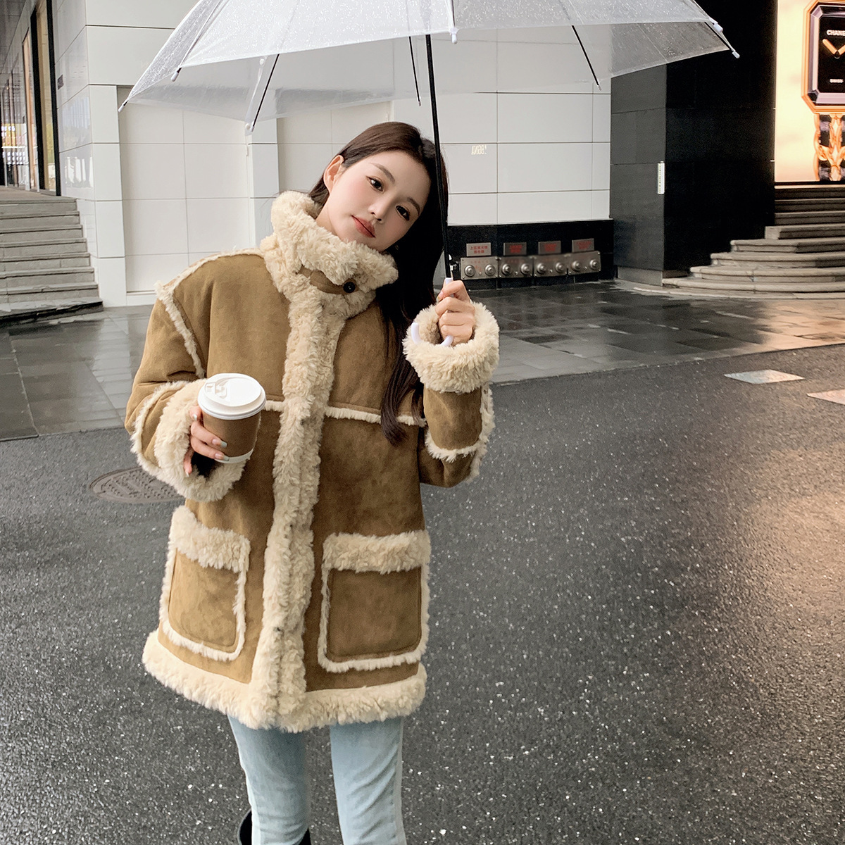 2024 카키색 스플라이스 양털 코트 여성 겨울 디자인 두꺼운 보온 가죽과 모피 일체형 코트스토어 가기