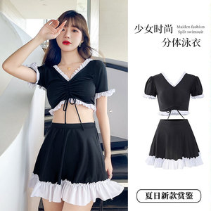 泳衣女保守2021新款韩国分体裙式遮肚显瘦学生少女泳装温泉黑色