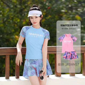 分体短袖游泳衣女裙式平角遮肚显瘦保守夏季防晒简单高中大学生