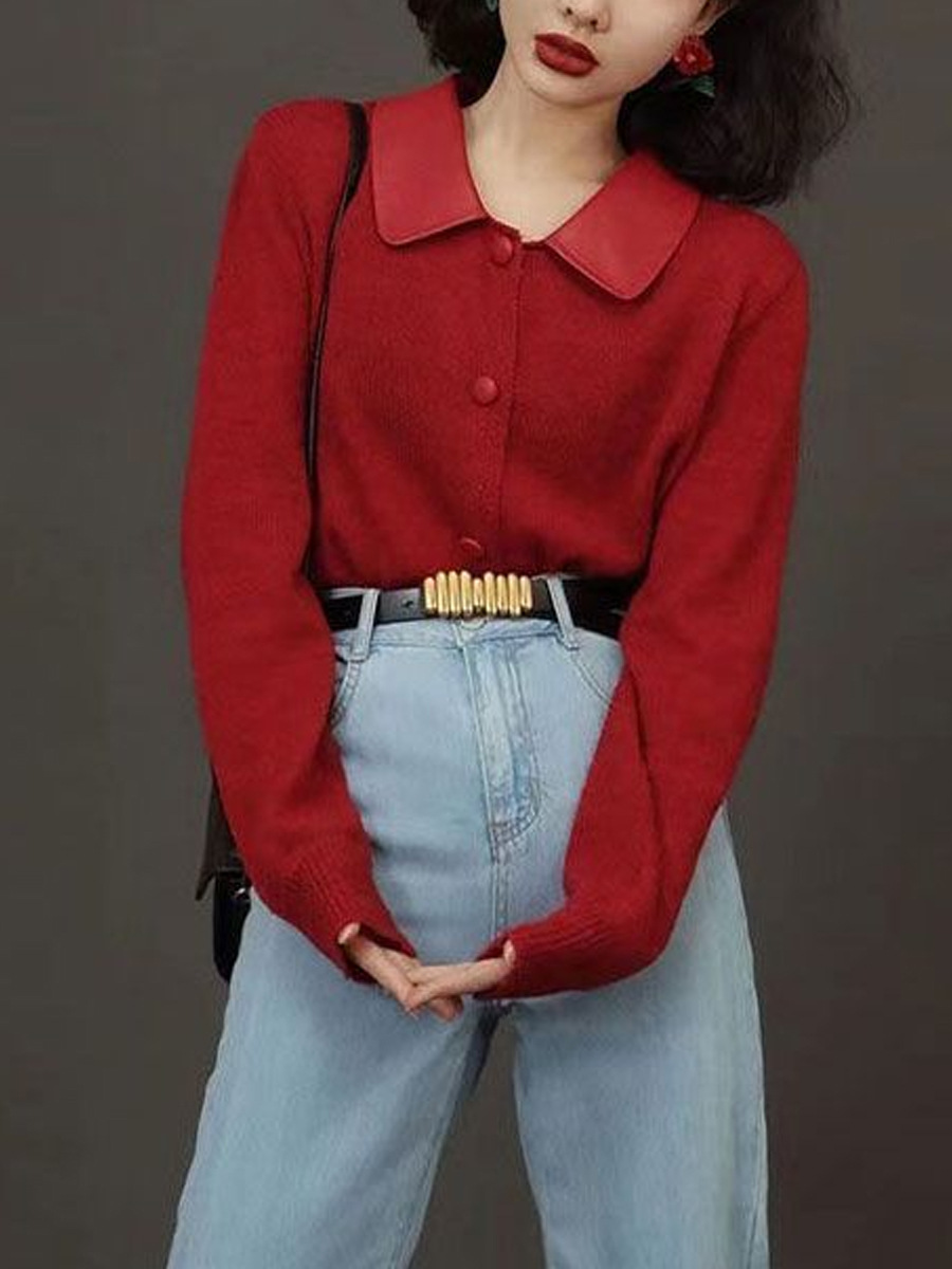 XIAOZHI ~ 외국 스타일 가죽 칼라 스티칭 긴 소매 스웨터 여성용 2023 봄 복고풍 디자인 스웨터스토어 가기