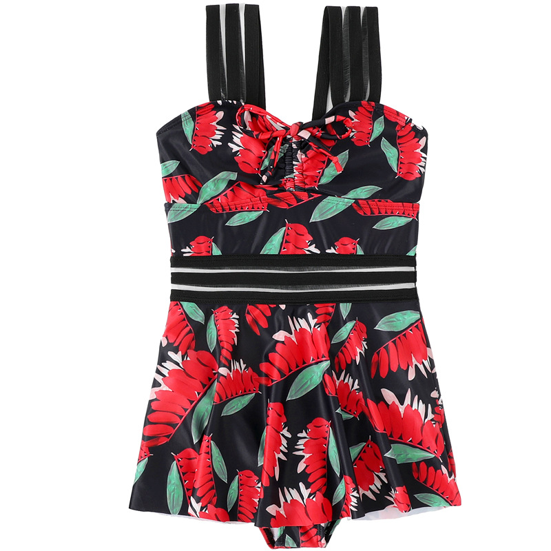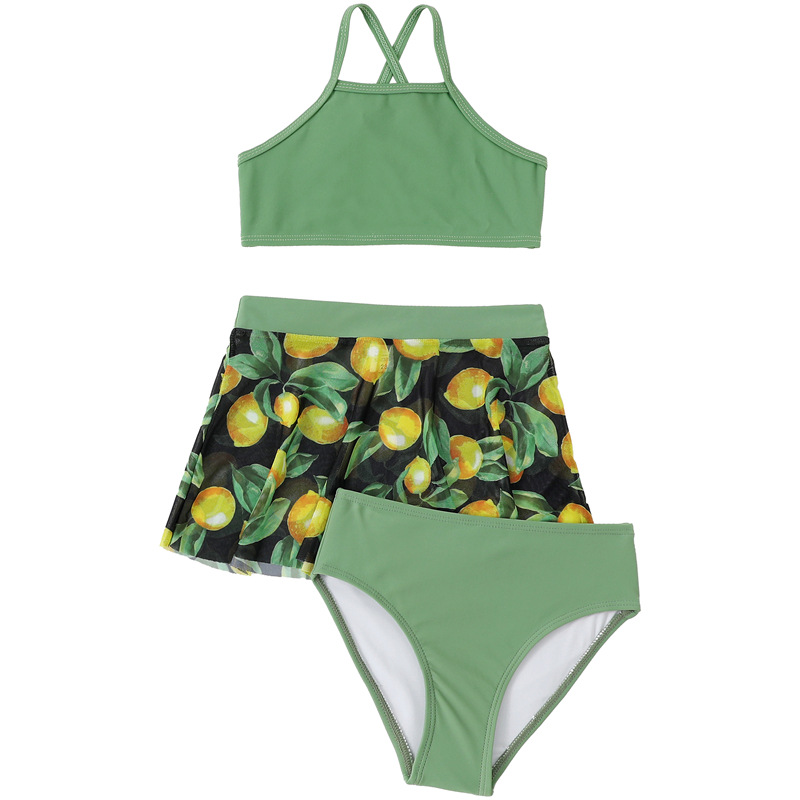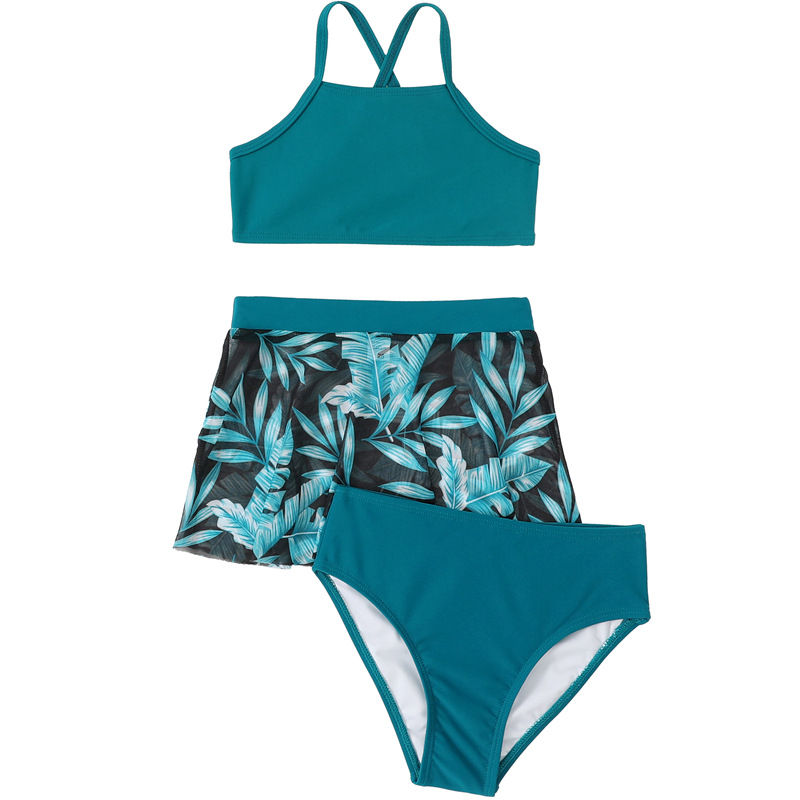 새로운 스타일의 여아 수영복, 큰 아이들을 위한 분리형 어린이 수영 팬츠, 나일론 고탄성 3피스 세트, 메쉬 스커트, 여아 활동복