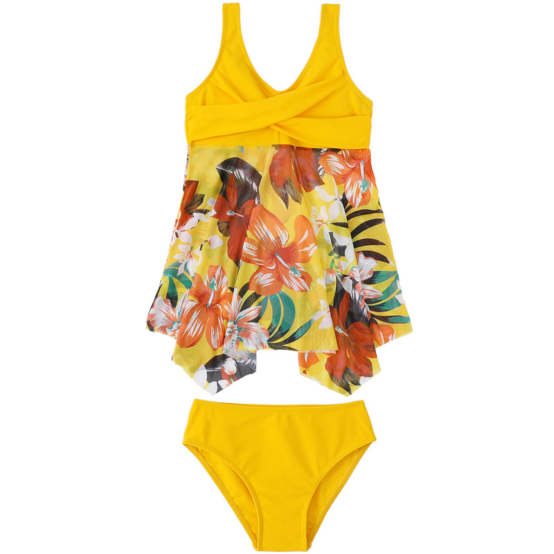 새로운 스타일의 여아 수영복, 큰 아이들을 위한 분리형 어린이 수영 팬츠, 나일론 고탄성 3피스 세트, 메쉬 스커트, 여아 활동복스토어 가기