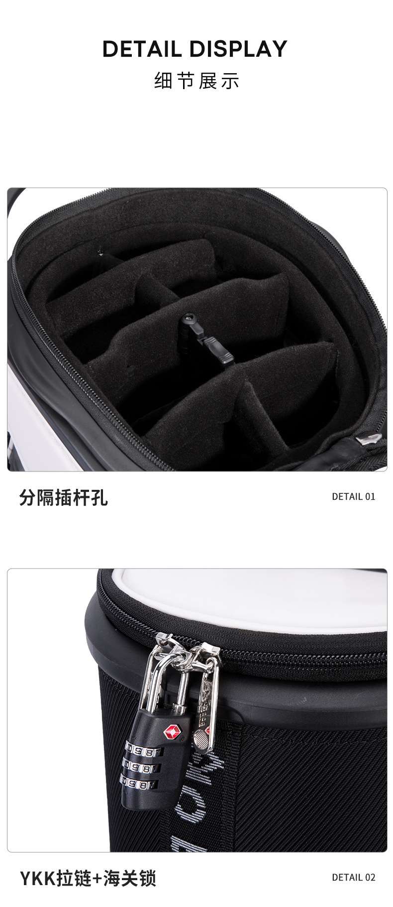 | 5 | 配海关锁,便于航空托运,确保球杆安全 | |||
