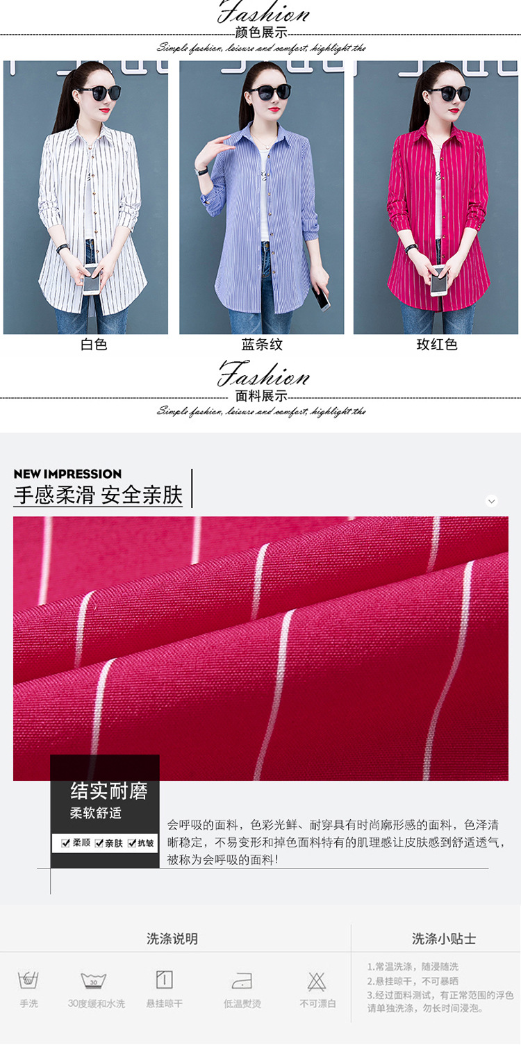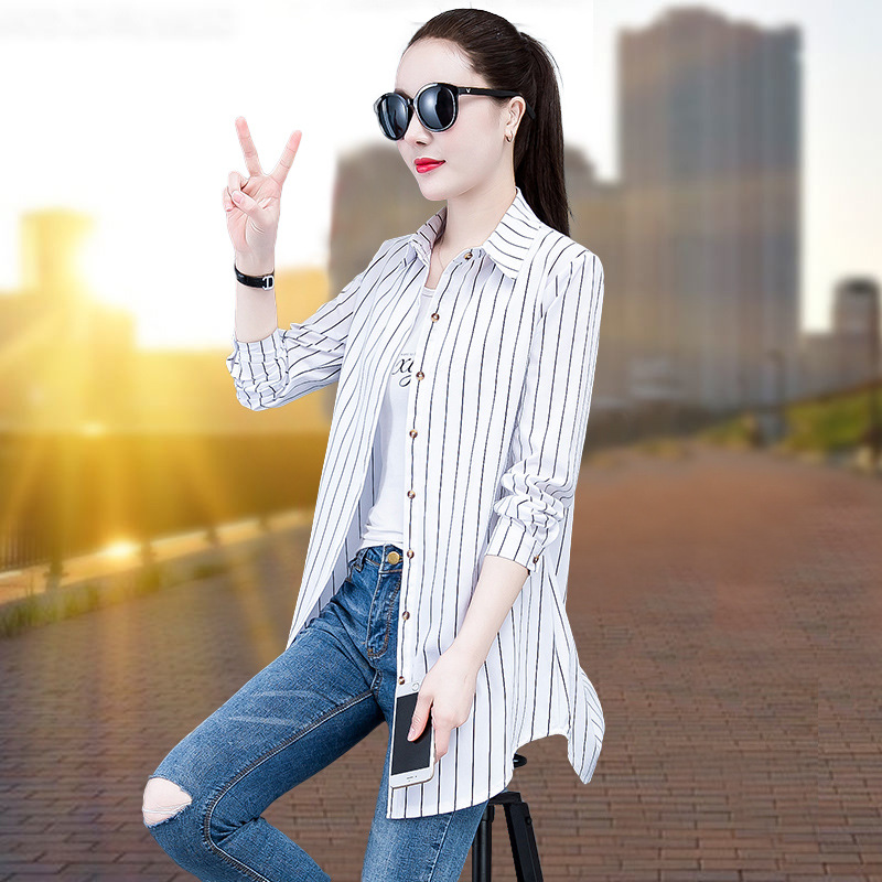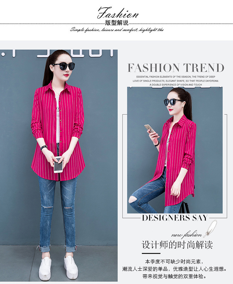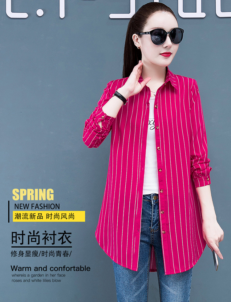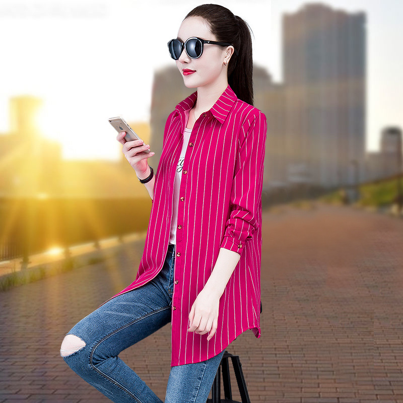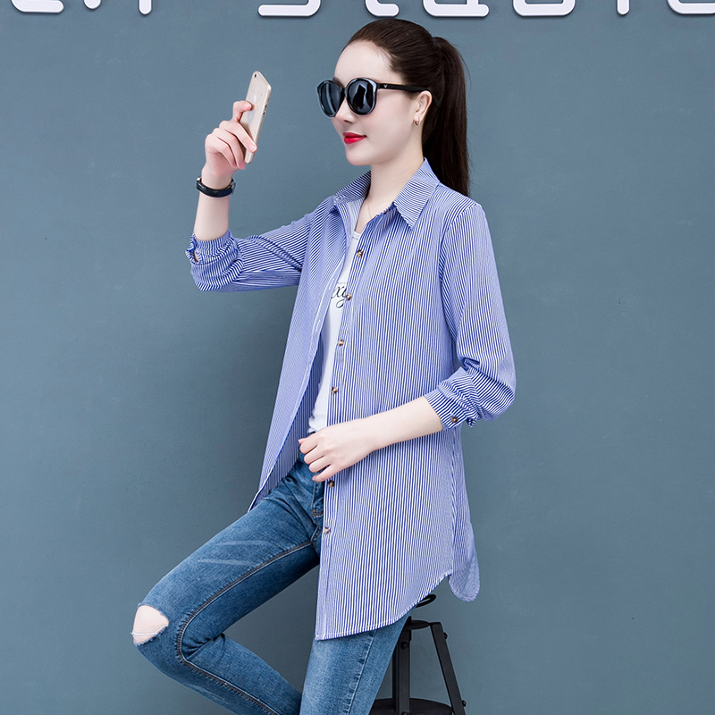 흰색 셔츠 여자의 긴 소매 중간 길이 한국어 스타일 bf 스타일 섹시 잠옷 스트라이프 블루 레드 느슨한 슬림 셔츠 원피스스토어 가기