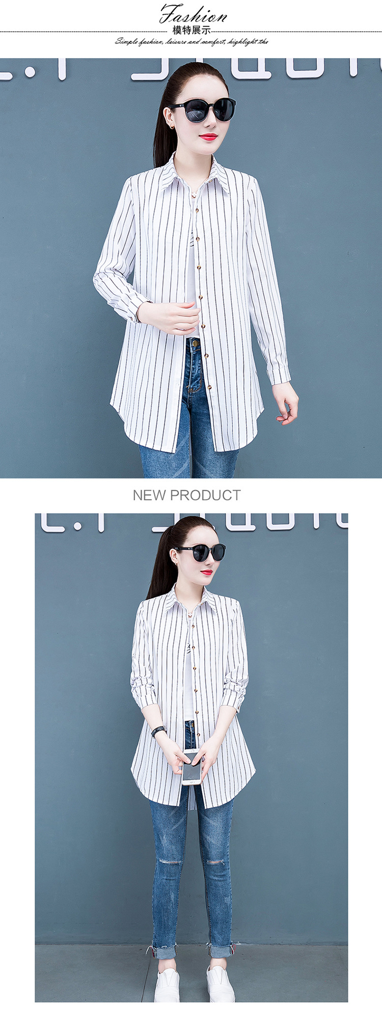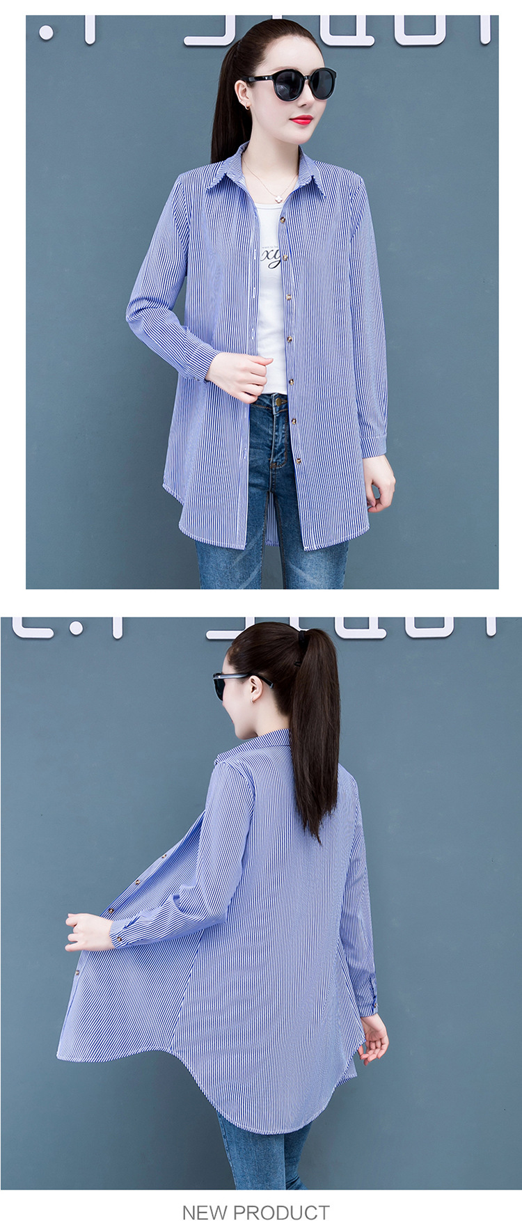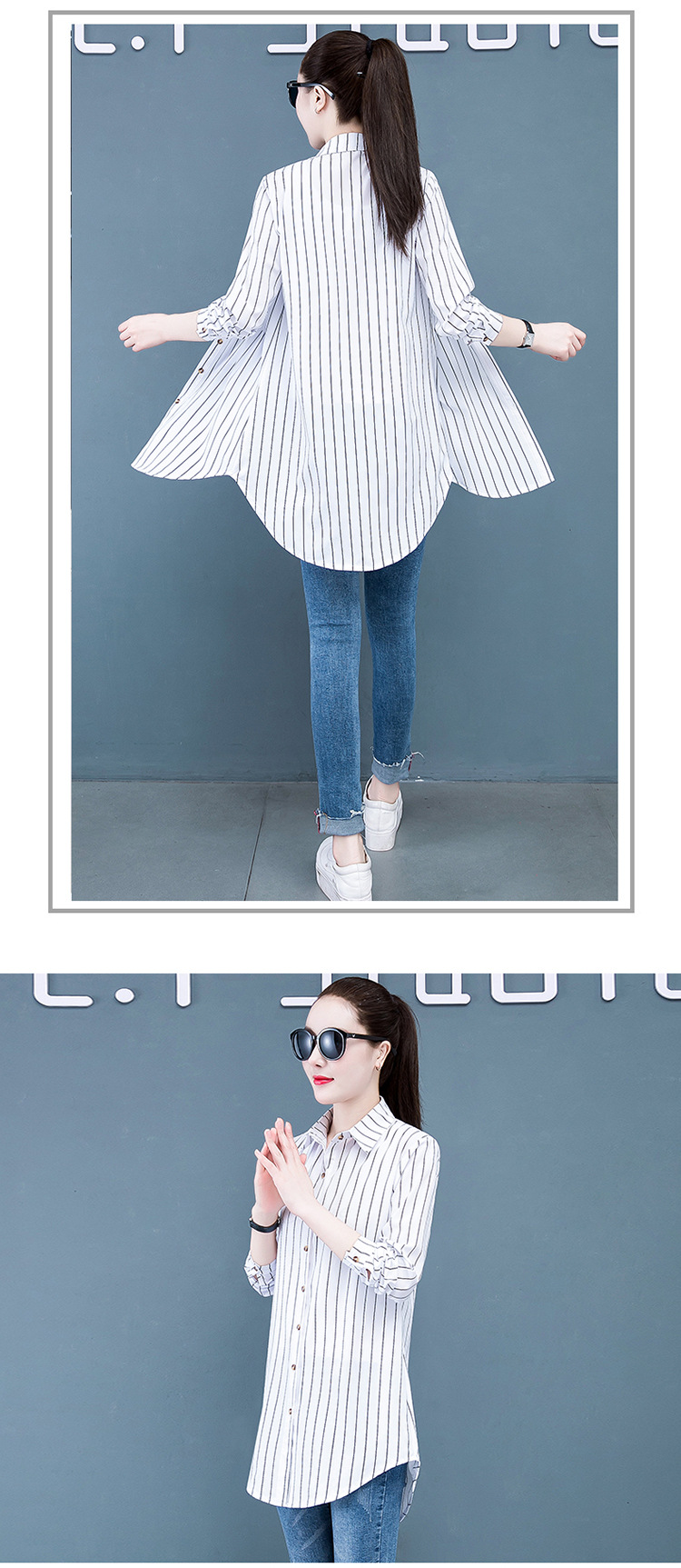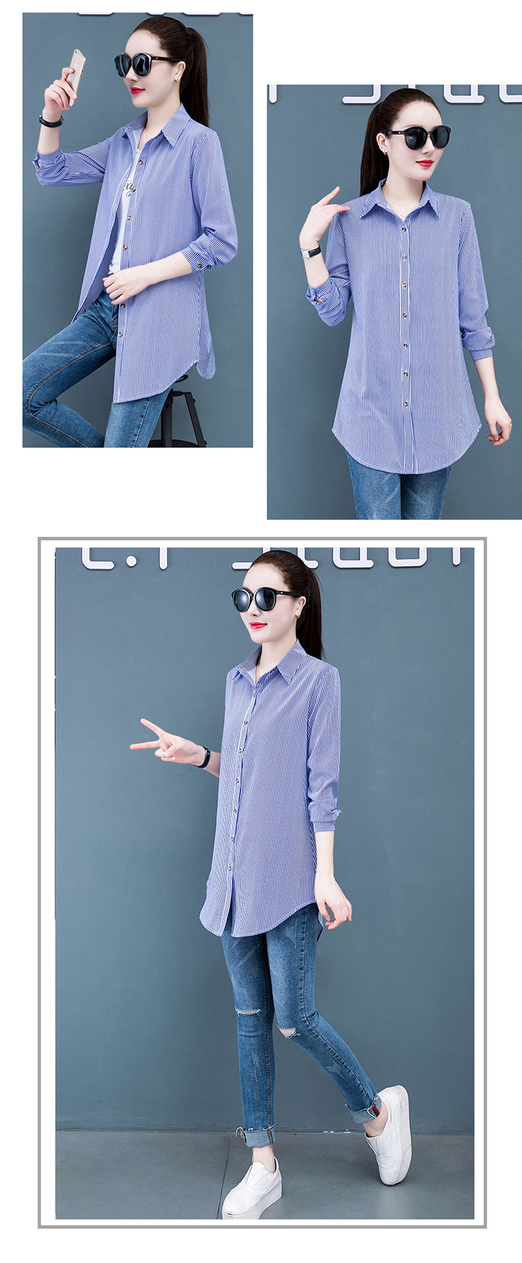흰색 셔츠 여자의 긴 소매 중간 길이 한국어 스타일 bf 스타일 섹시 잠옷 스트라이프 블루 레드 느슨한 슬림 셔츠 원피스스토어 가기