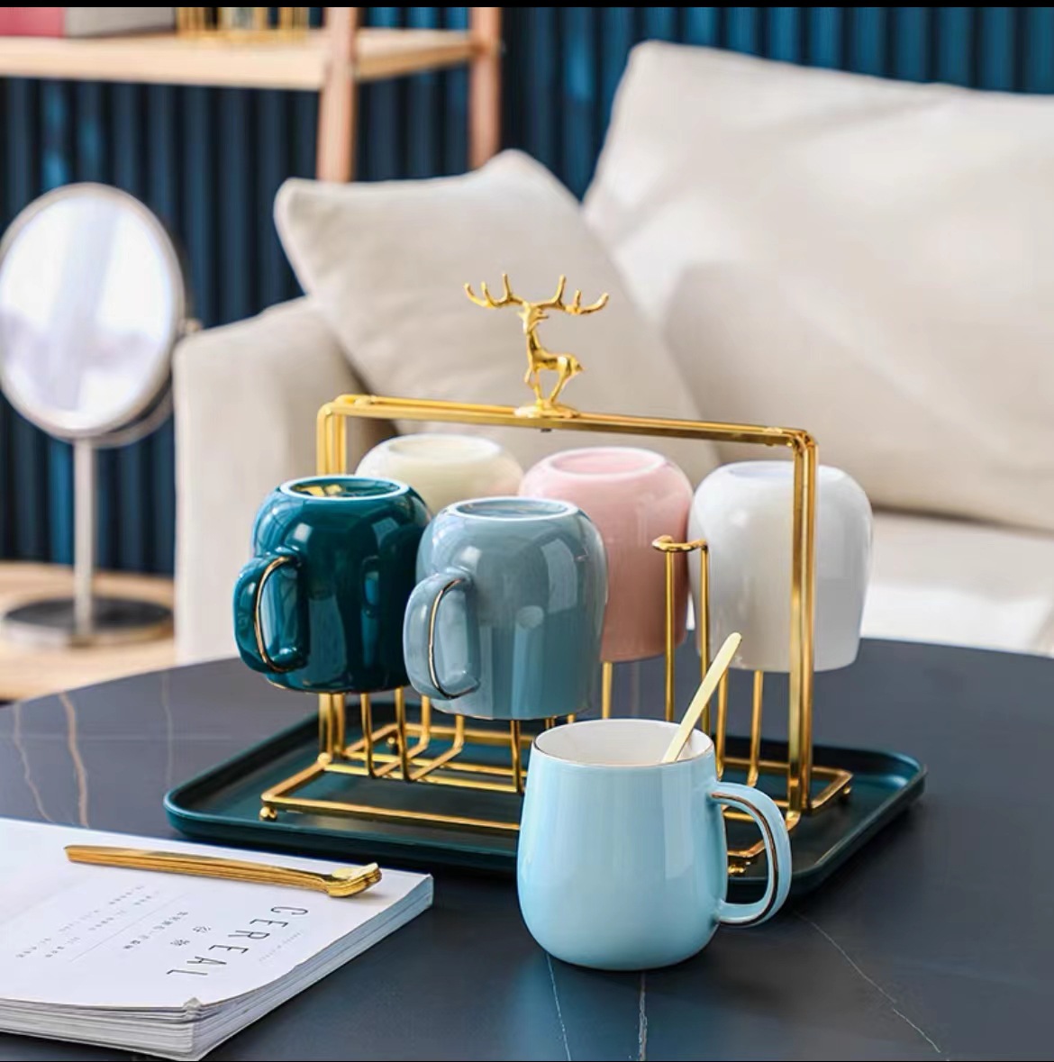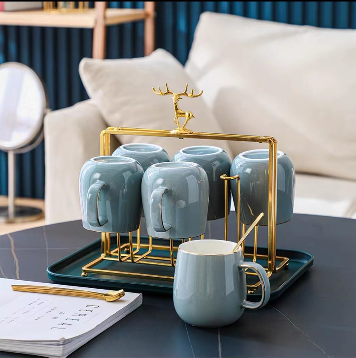 • 큰 배꼽 라인 회색 6 컵 + 사슴 랙 무료 플레이트 무료 스푼