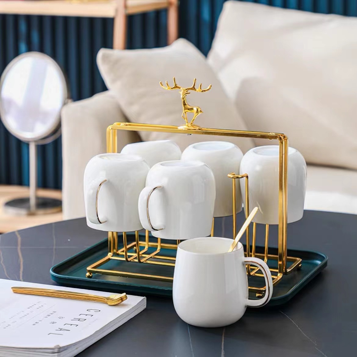 • 큰 배꼽 라인 흰색 6 컵 + 사슴 랙 무료 플레이트 무료 스푼