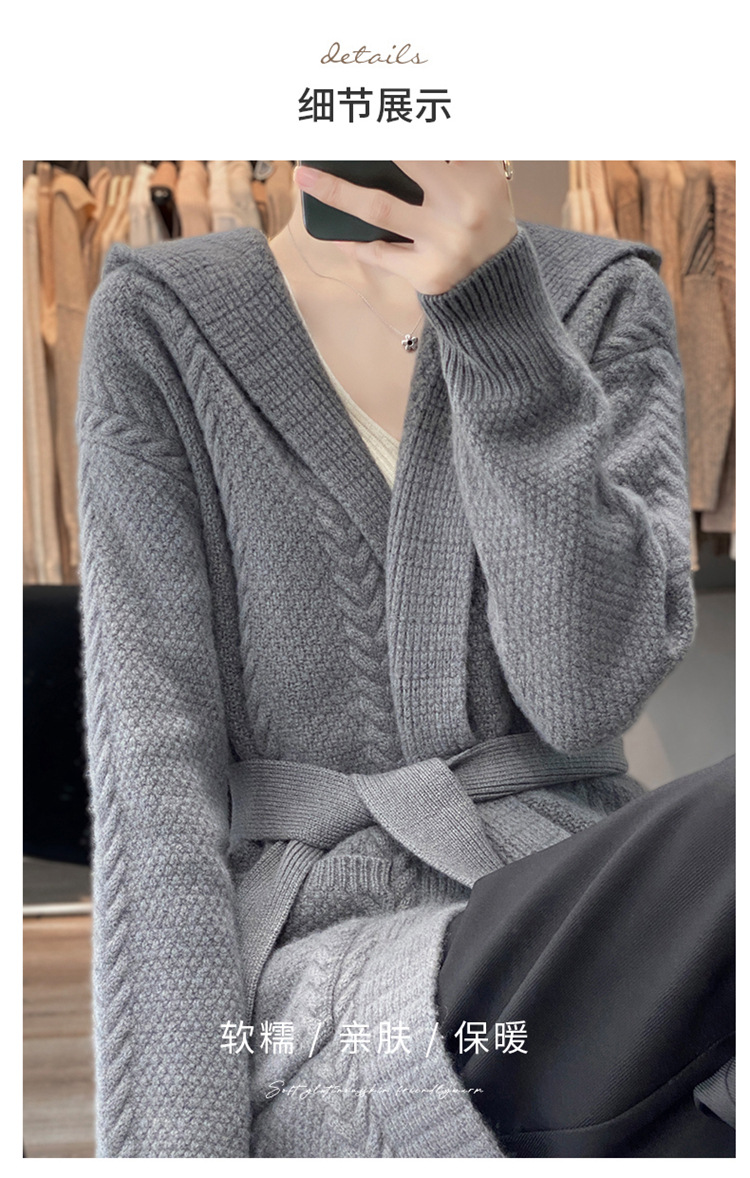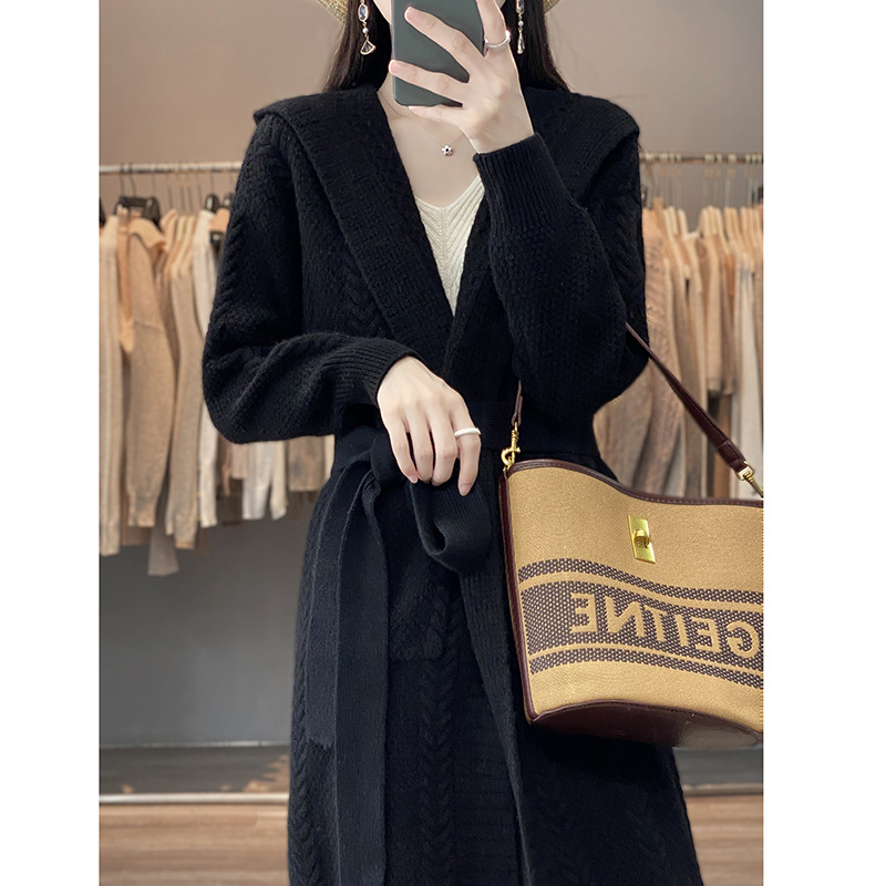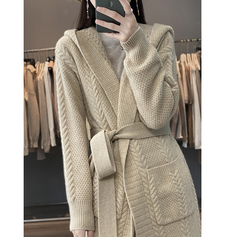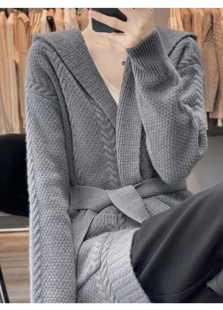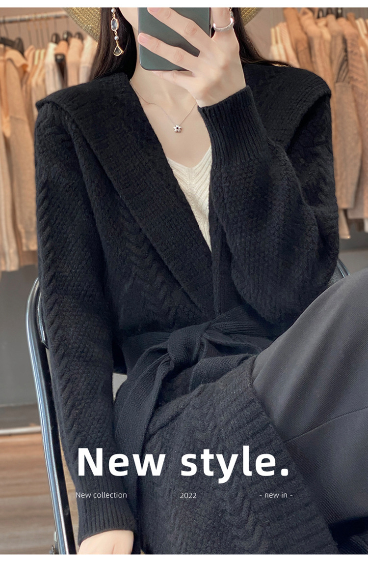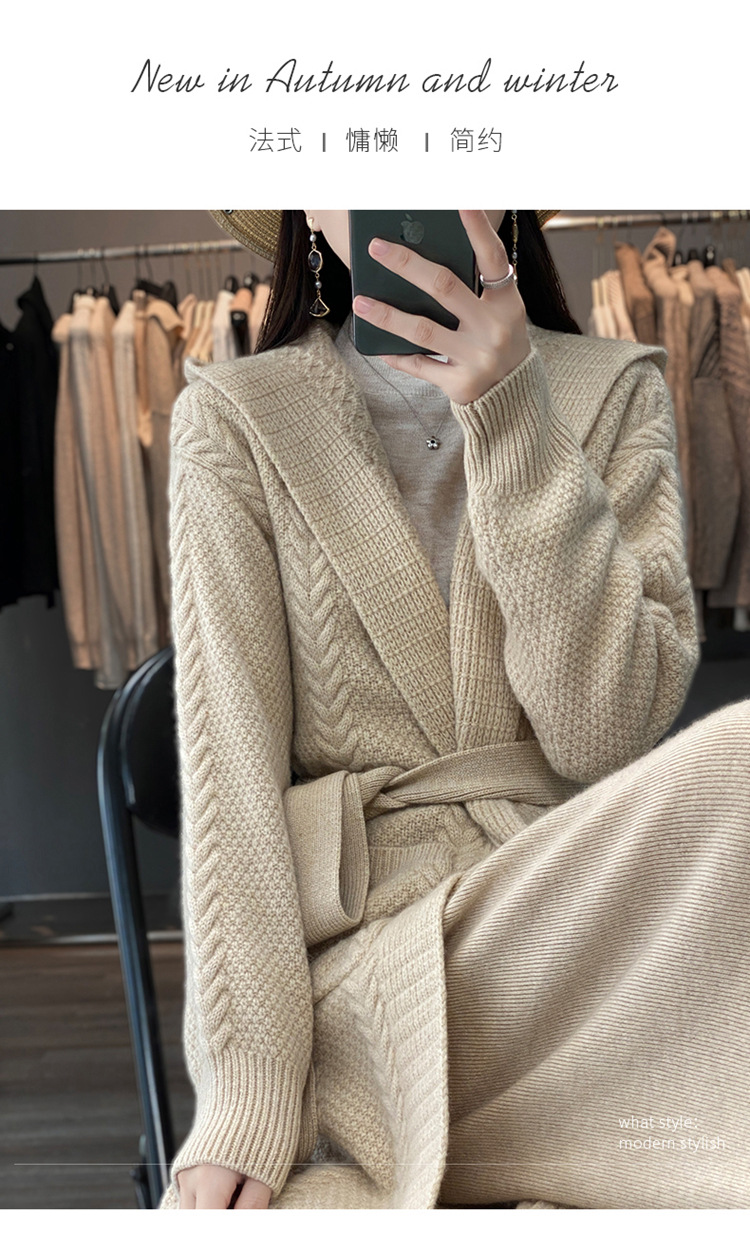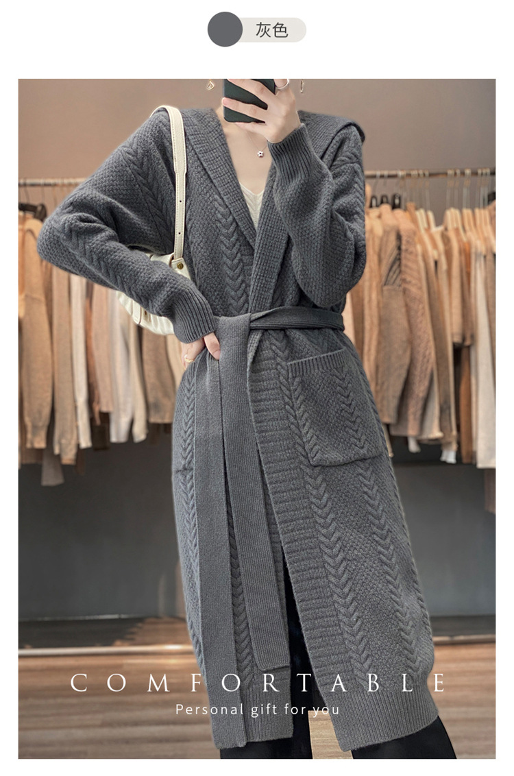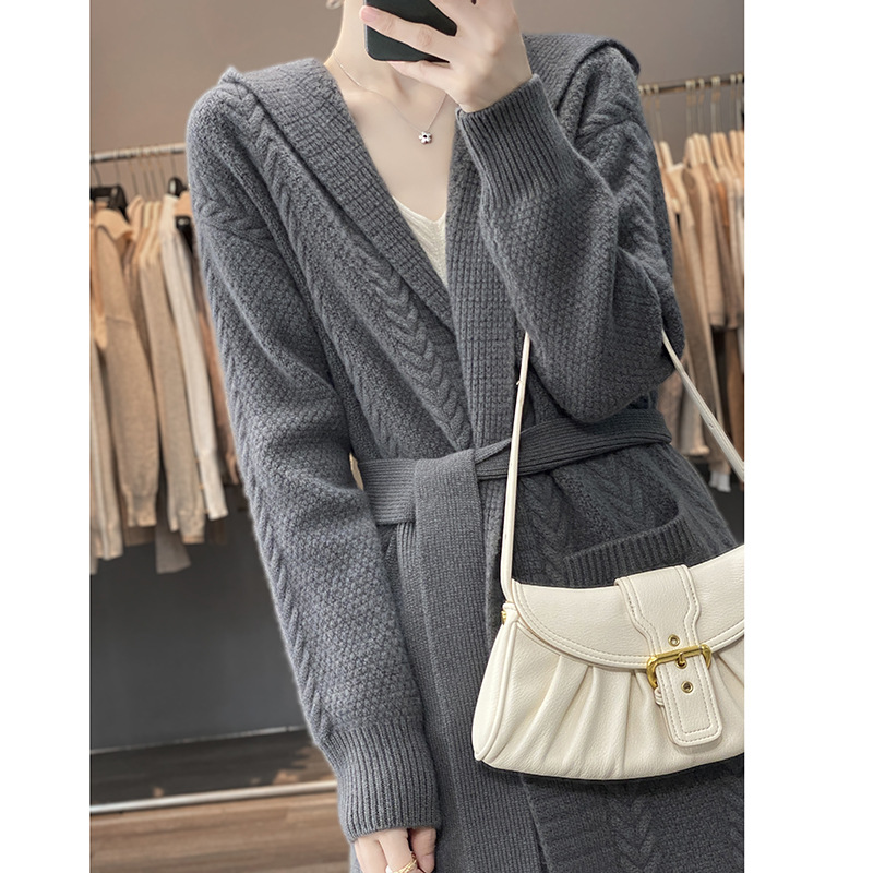 무거운 가을과 겨울 두꺼운 울 카디건 여성의 디자인 감각 느슨한 전체 울 니트 후드 벨트 게으른 스타일 코트스토어 가기