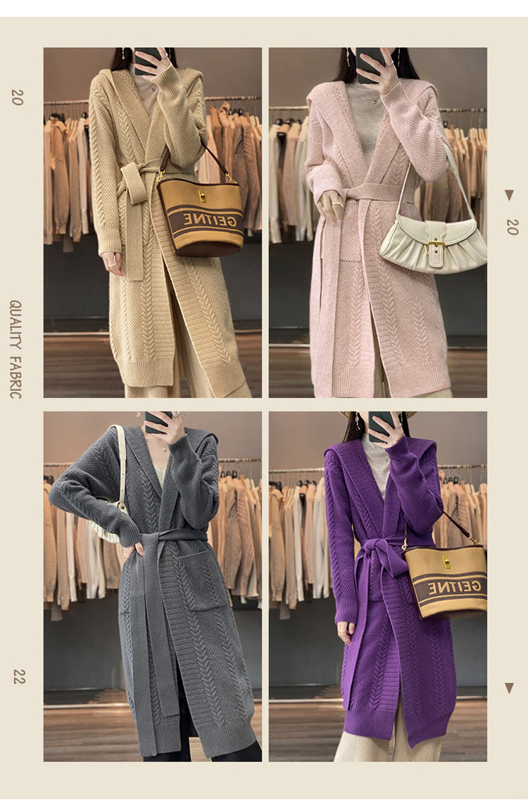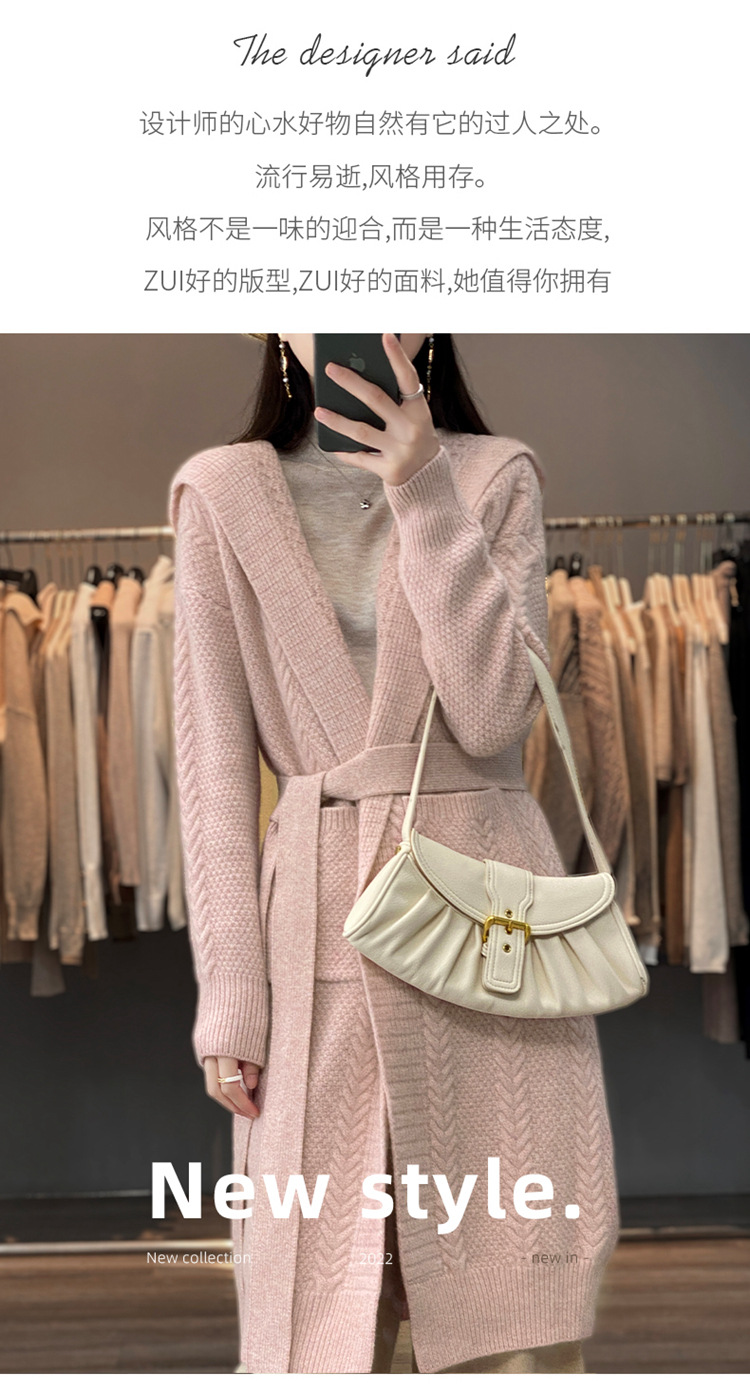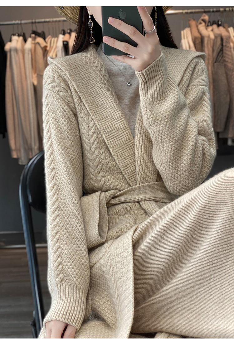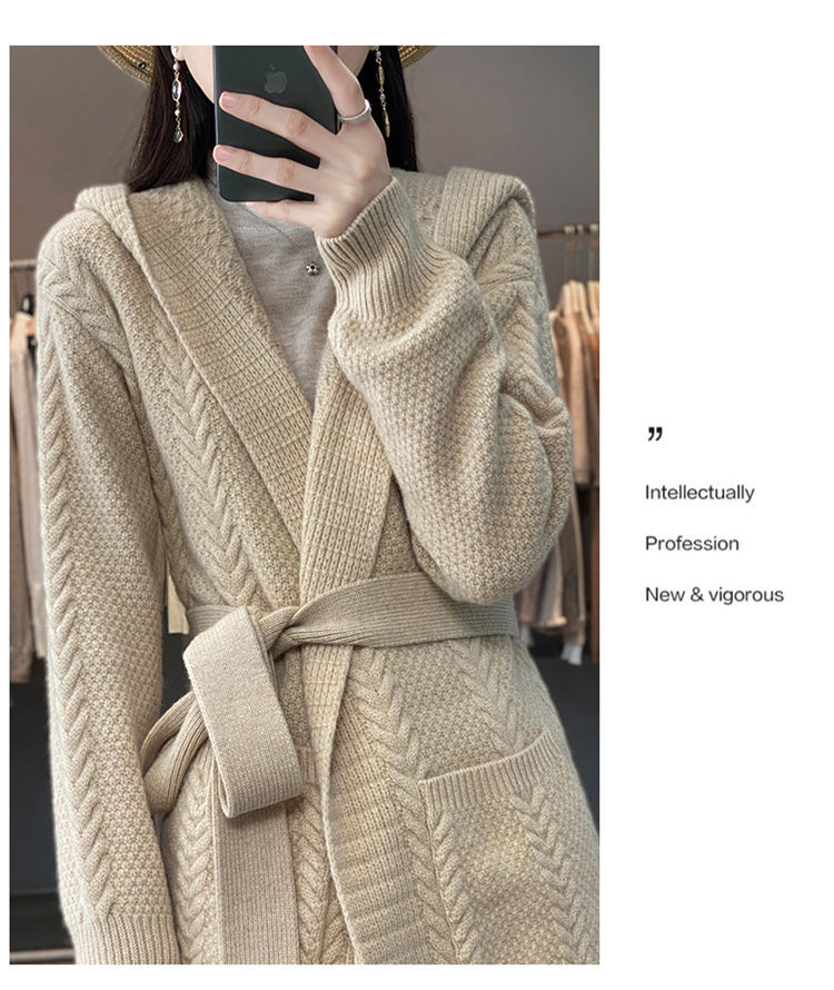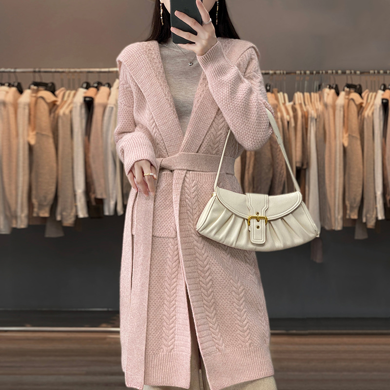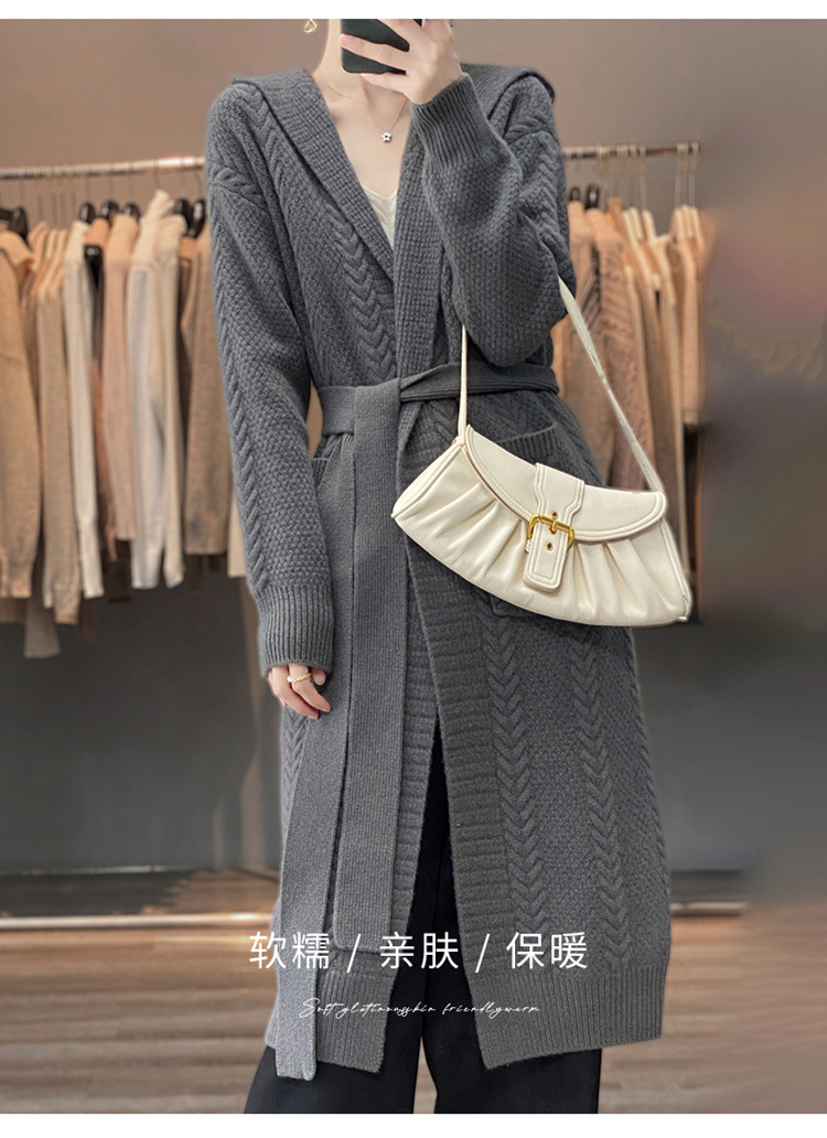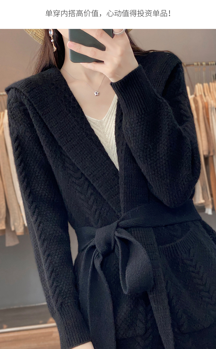 무거운 가을과 겨울 두꺼운 울 카디건 여성의 디자인 감각 느슨한 전체 울 니트 후드 벨트 게으른 스타일 코트스토어 가기