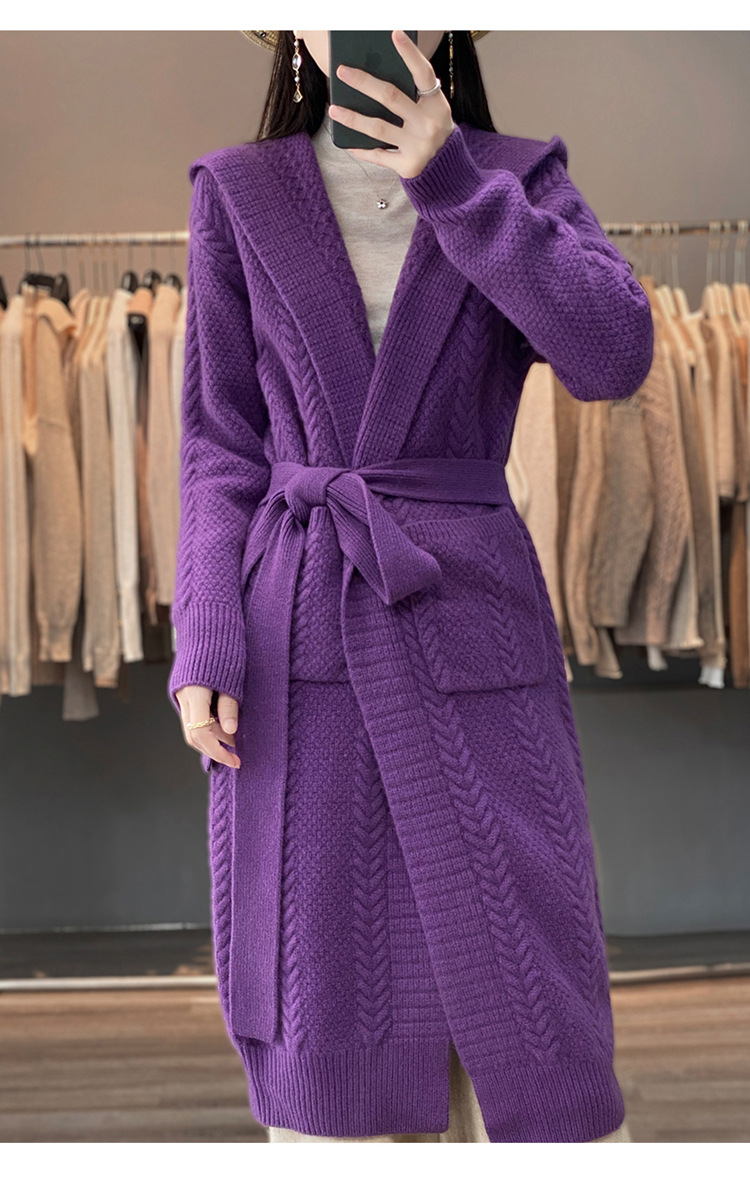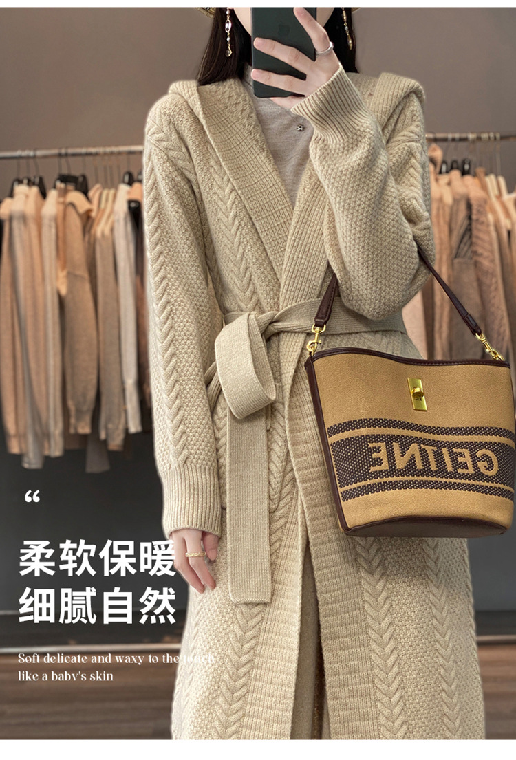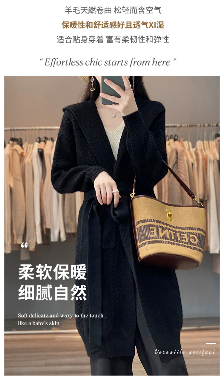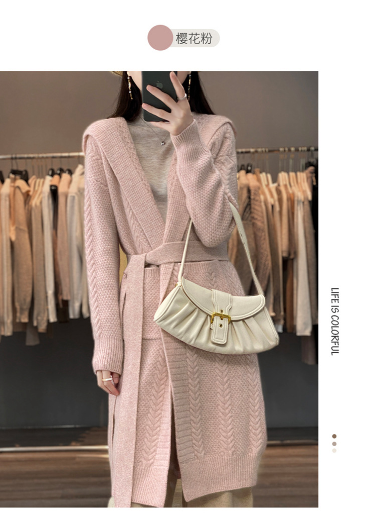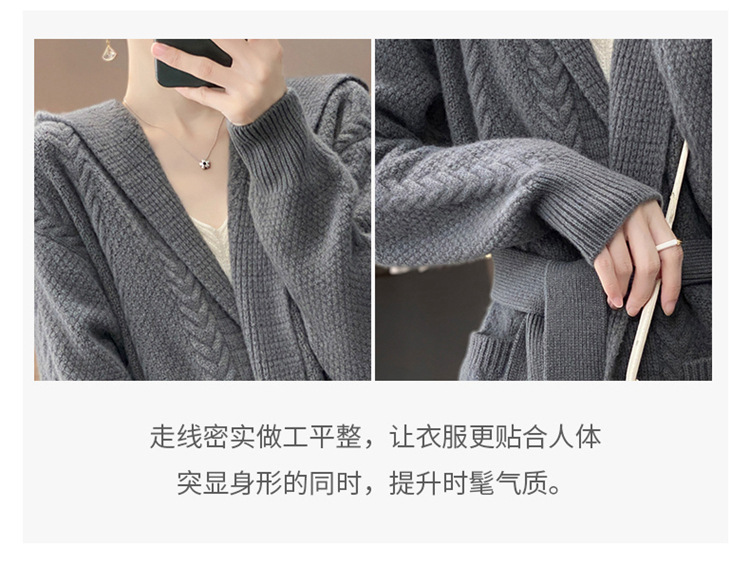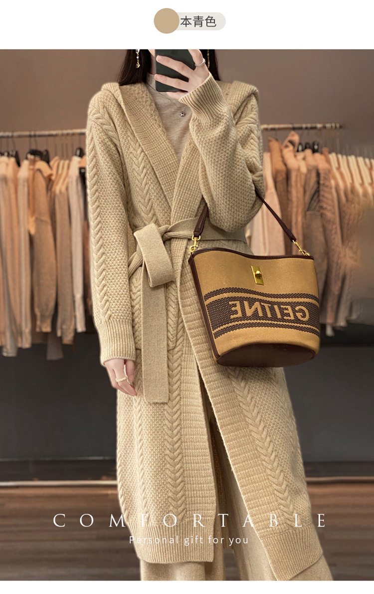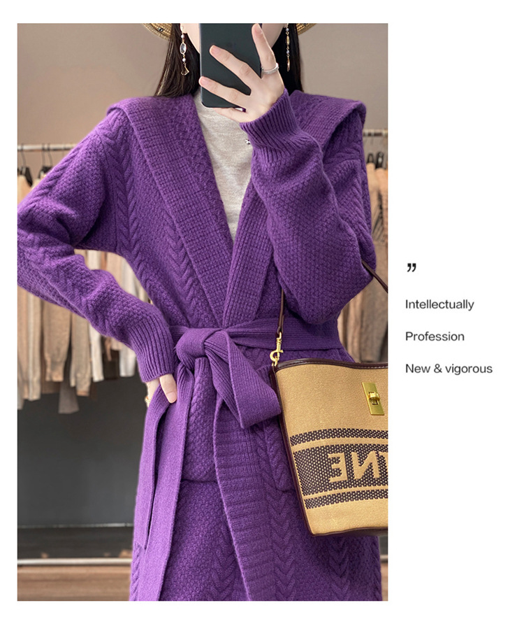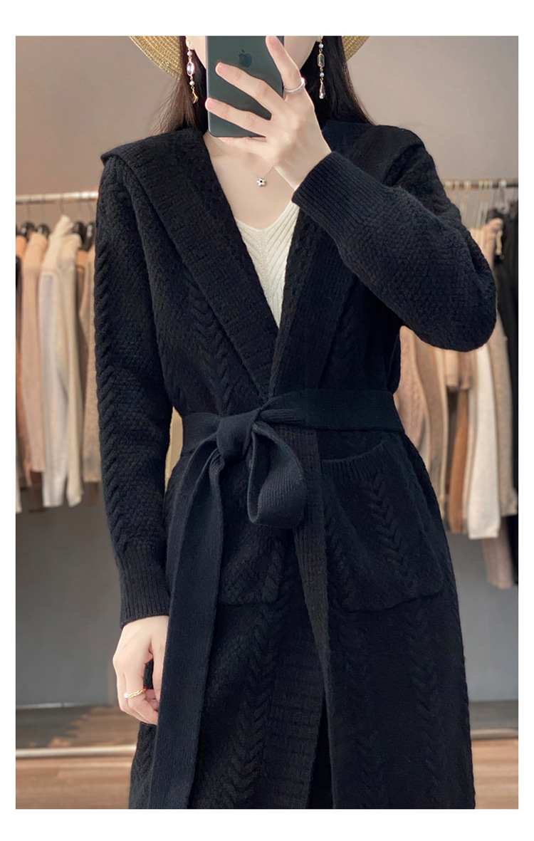 무거운 가을과 겨울 두꺼운 울 카디건 여성의 디자인 감각 느슨한 전체 울 니트 후드 벨트 게으른 스타일 코트스토어 가기