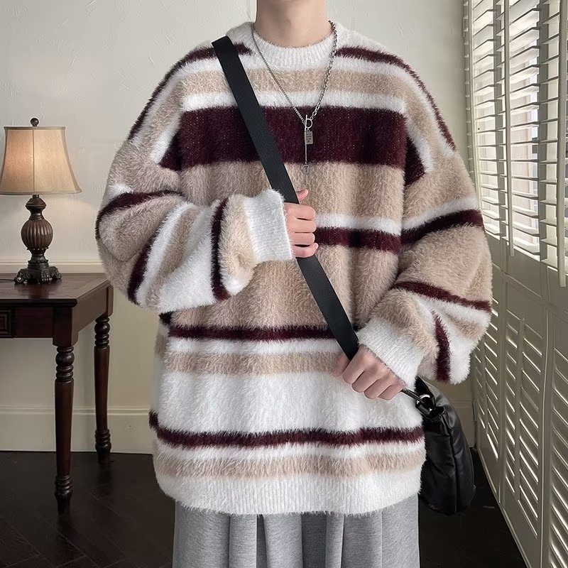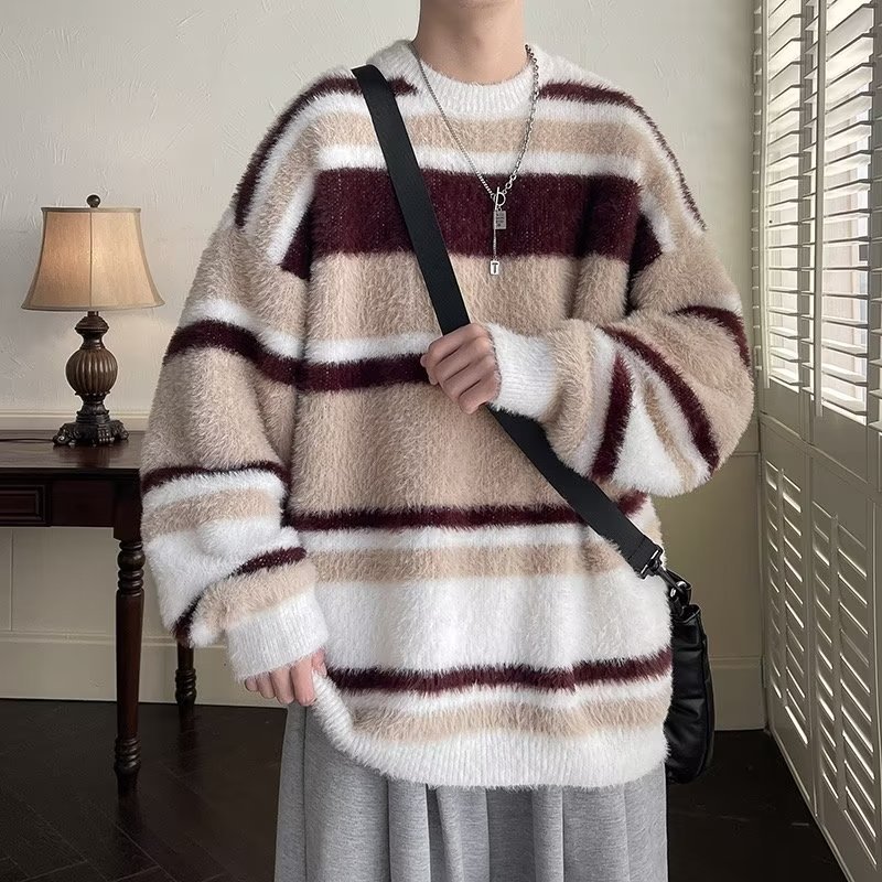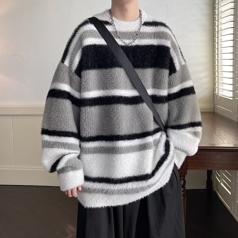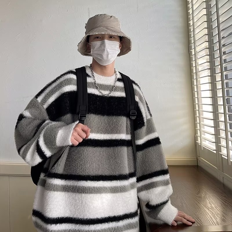 스트라이프 대비 바다 말 울 스웨터 남자의 겨울 빈티지 라운드 넥 두꺼운 느긋한 스타일 따뜻한 내부 스웨터와 니트 스웨터
