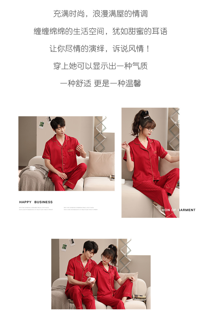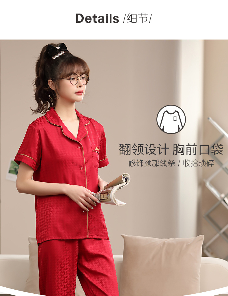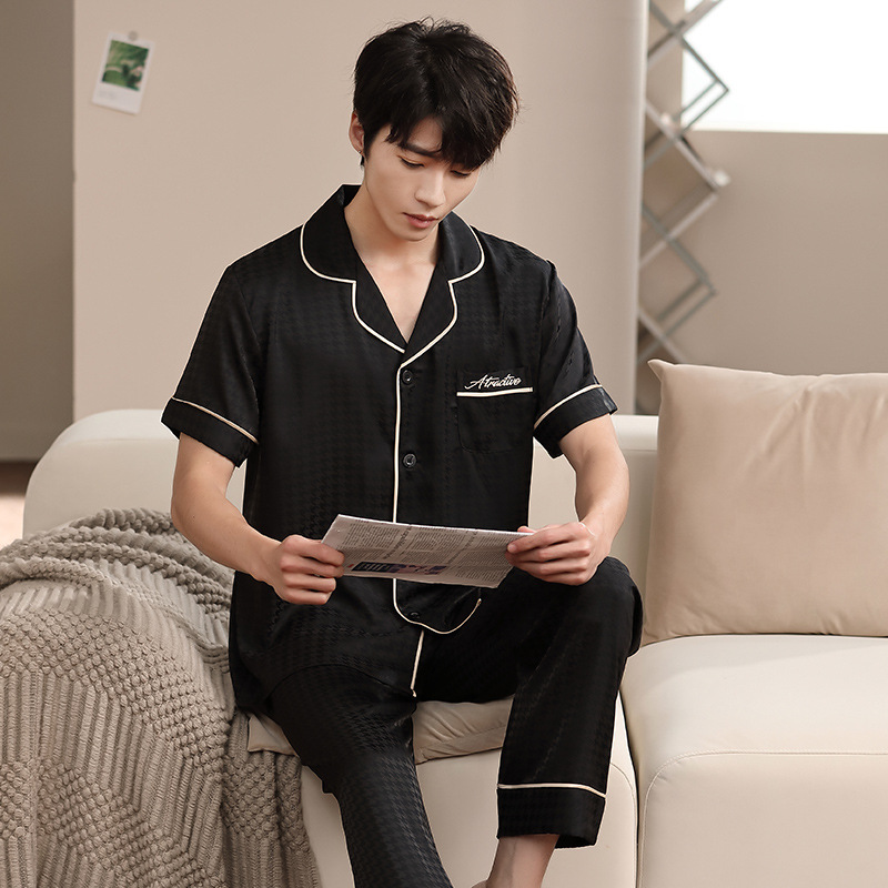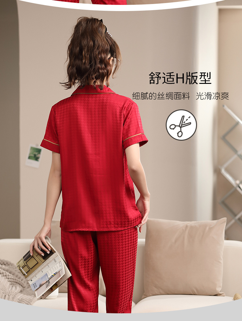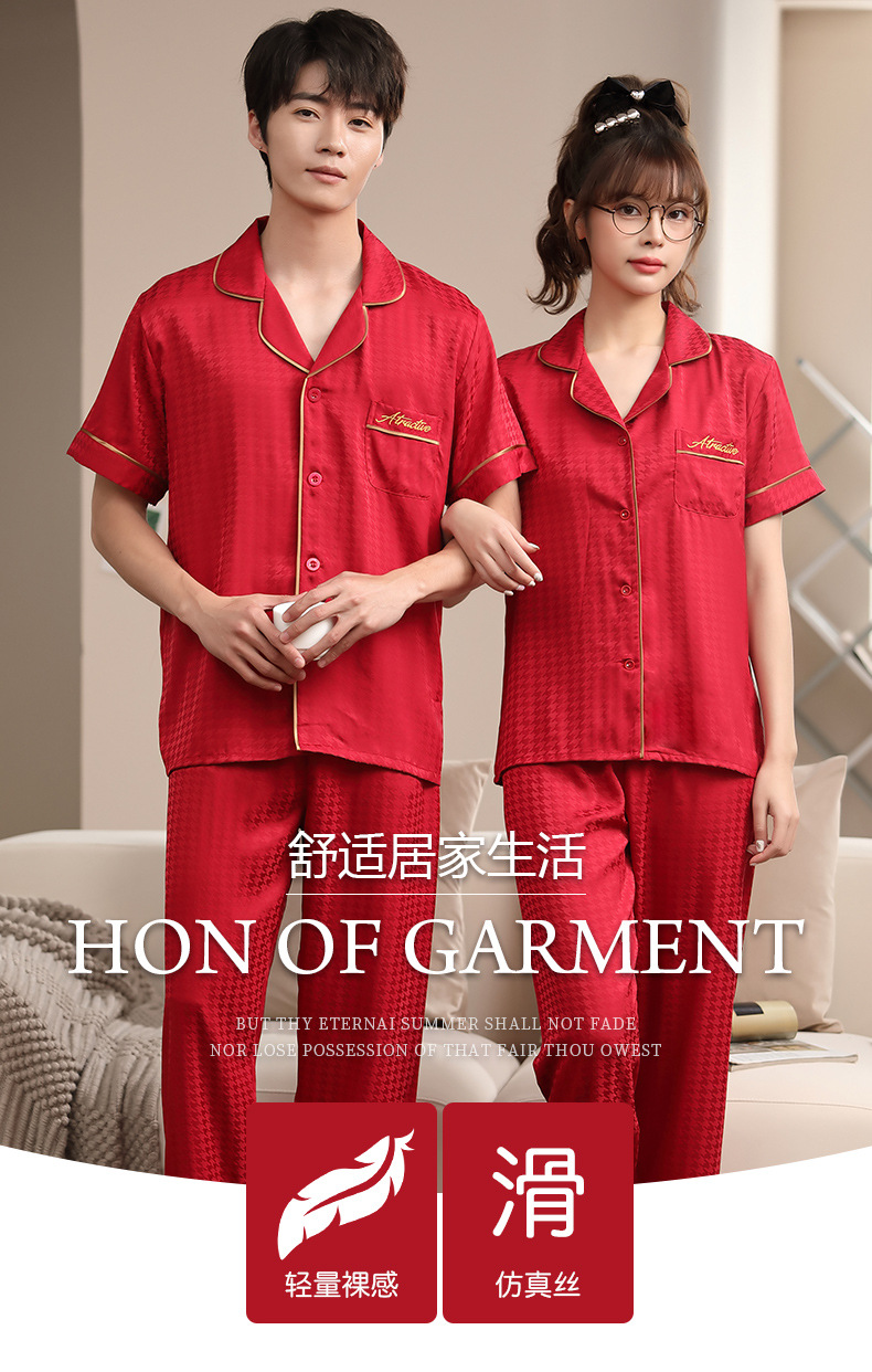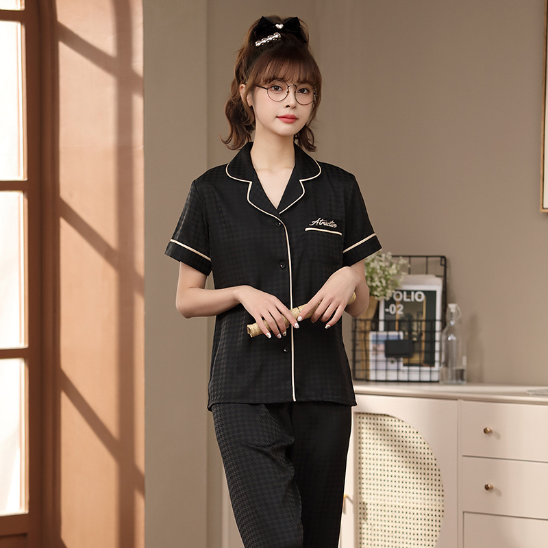 2023 새로운 커플 잠옷 여자의 봄과 가을 얇은 얼음 실크 반팔 Houndstooth 인쇄 세트 남자의 가정 옷