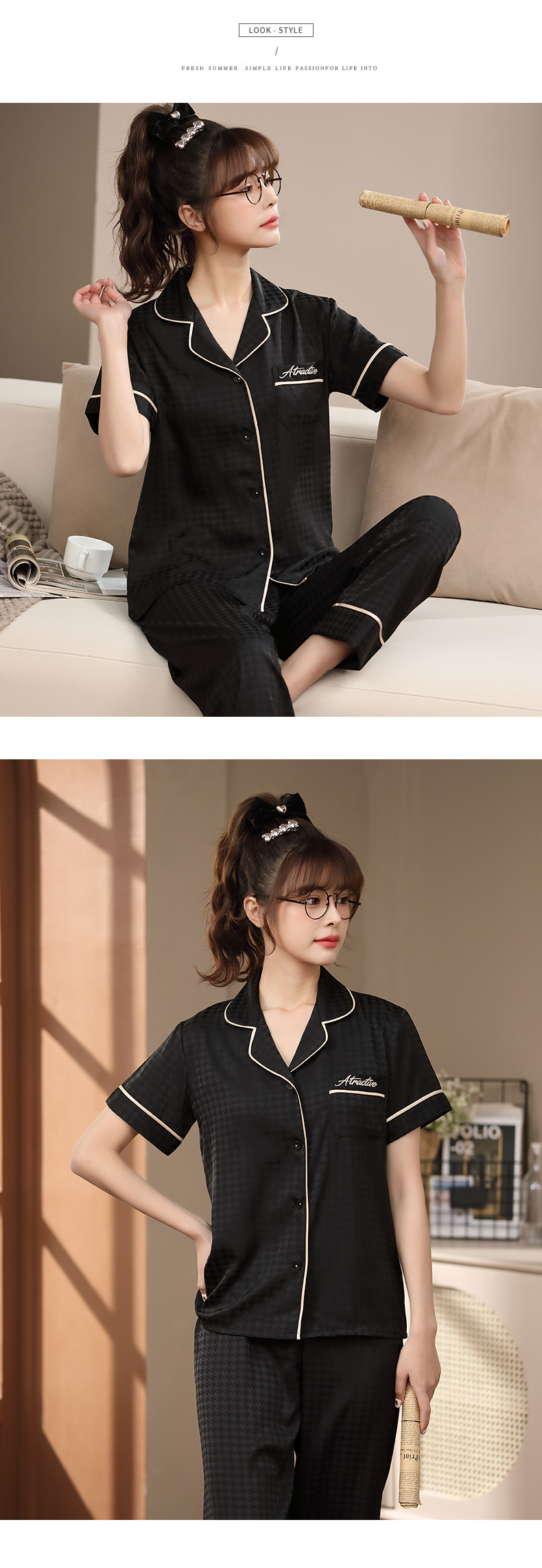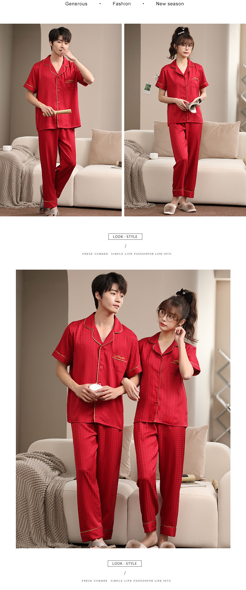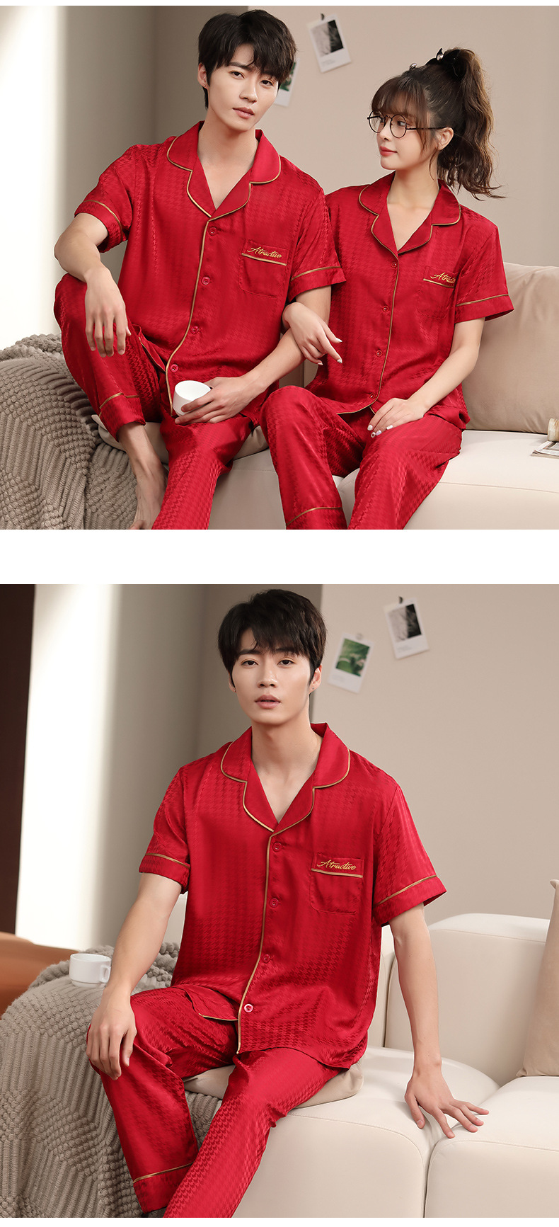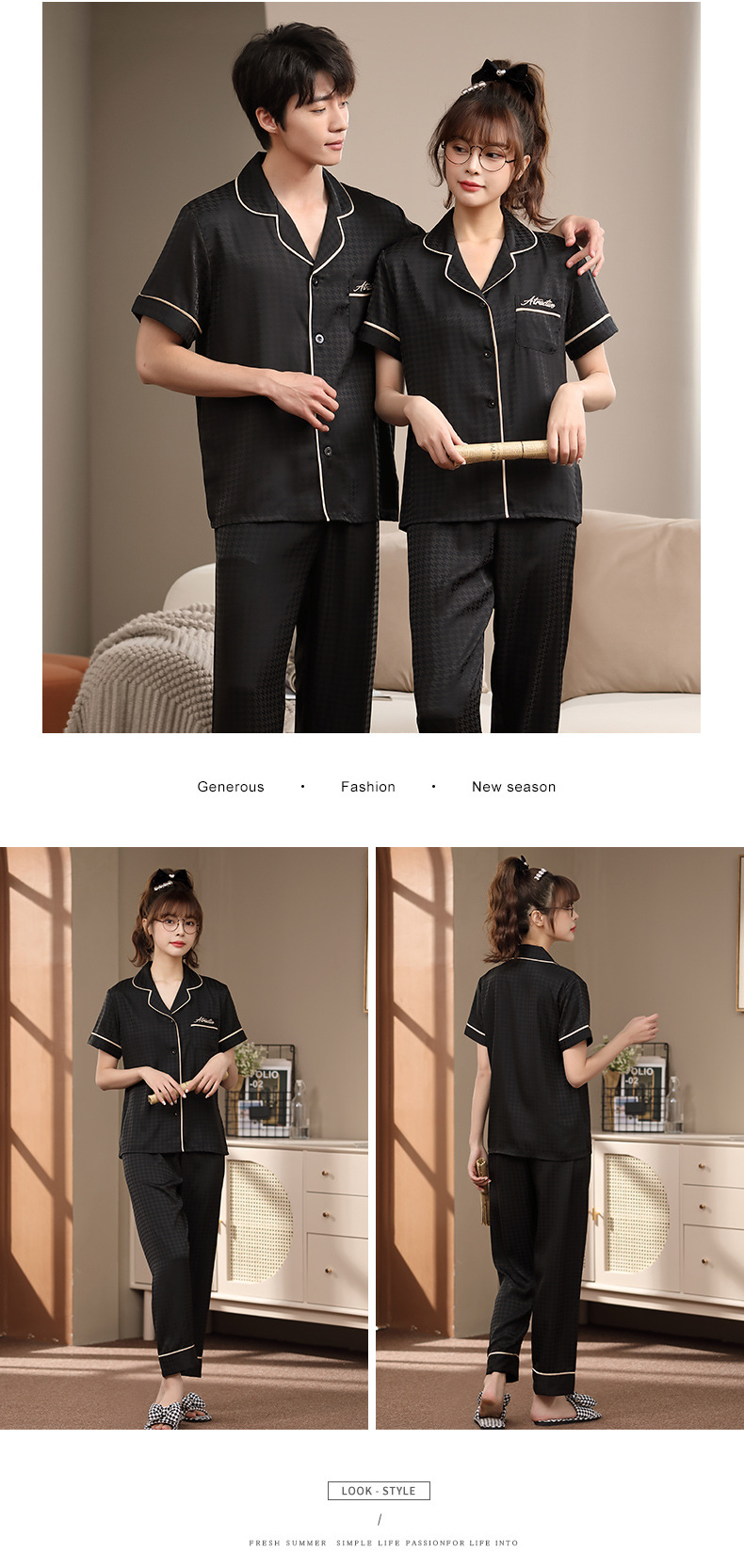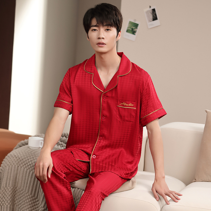 2023 새로운 커플 잠옷 여자의 봄과 가을 얇은 얼음 실크 반팔 Houndstooth 인쇄 세트 남자의 가정 옷