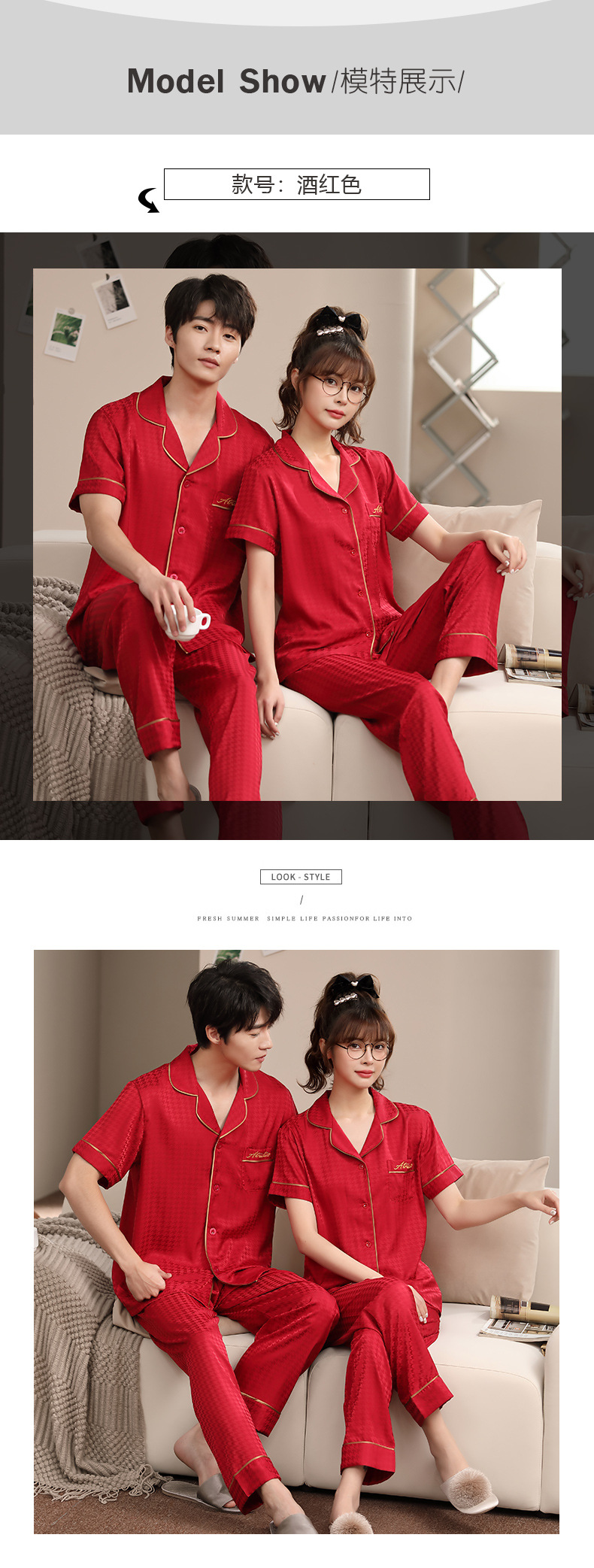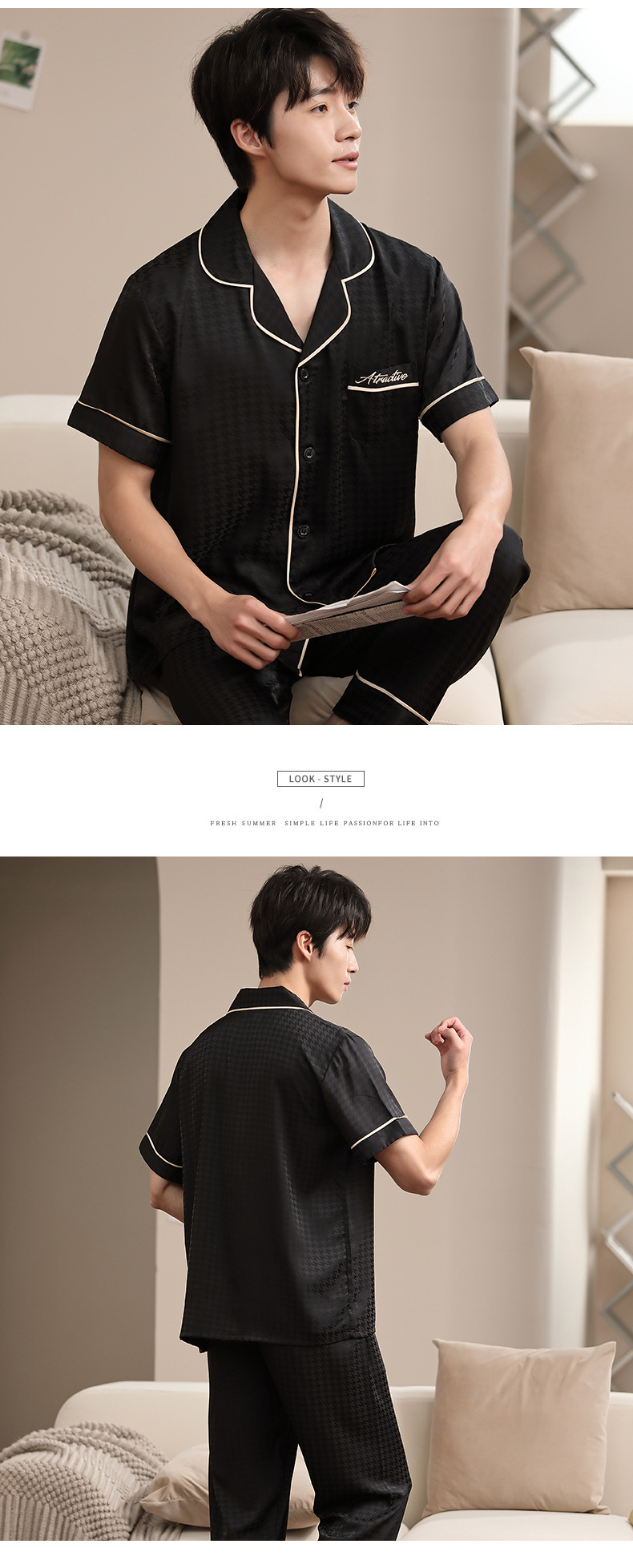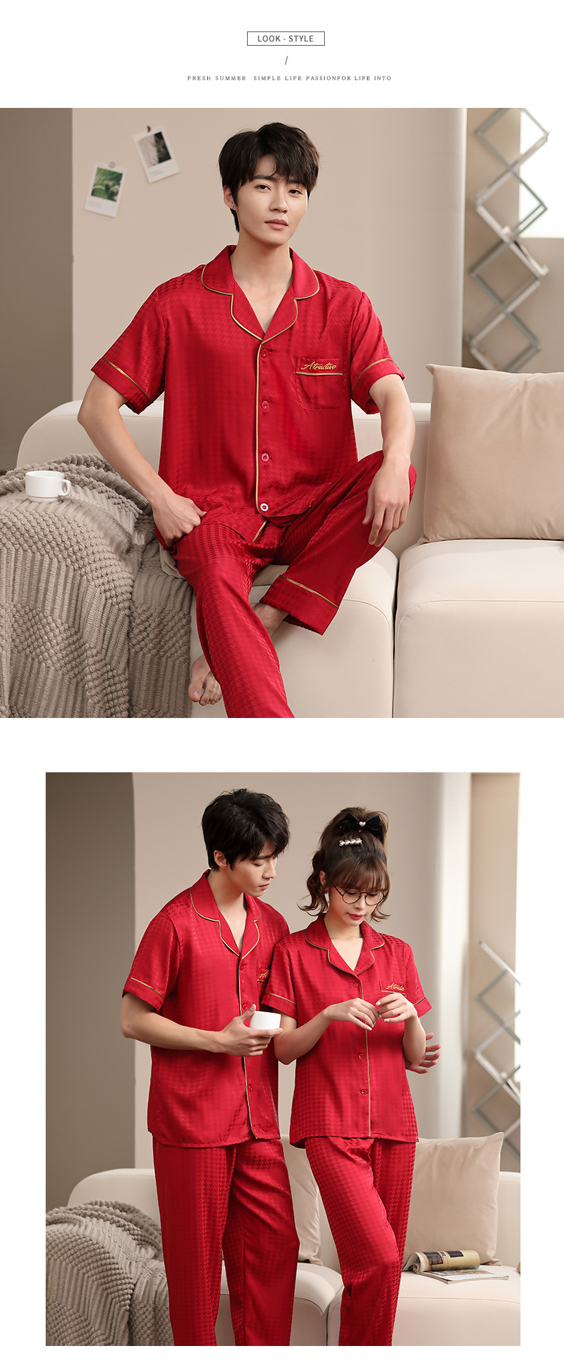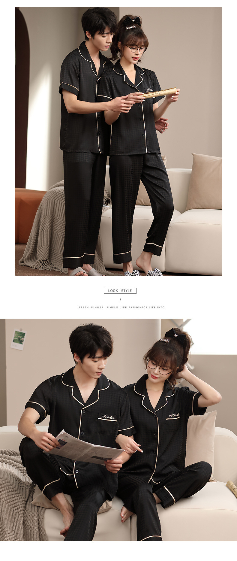 2023 새로운 커플 잠옷 여자의 봄과 가을 얇은 얼음 실크 반팔 Houndstooth 인쇄 세트 남자의 가정 옷스토어 가기