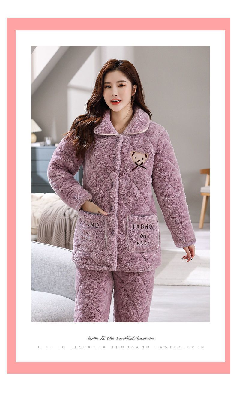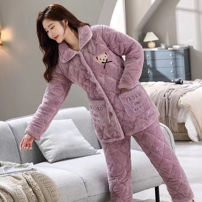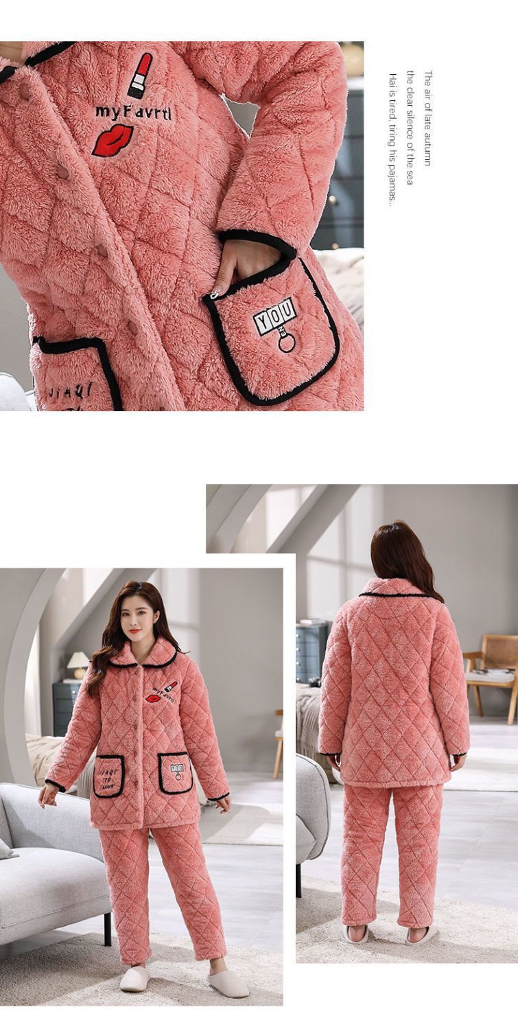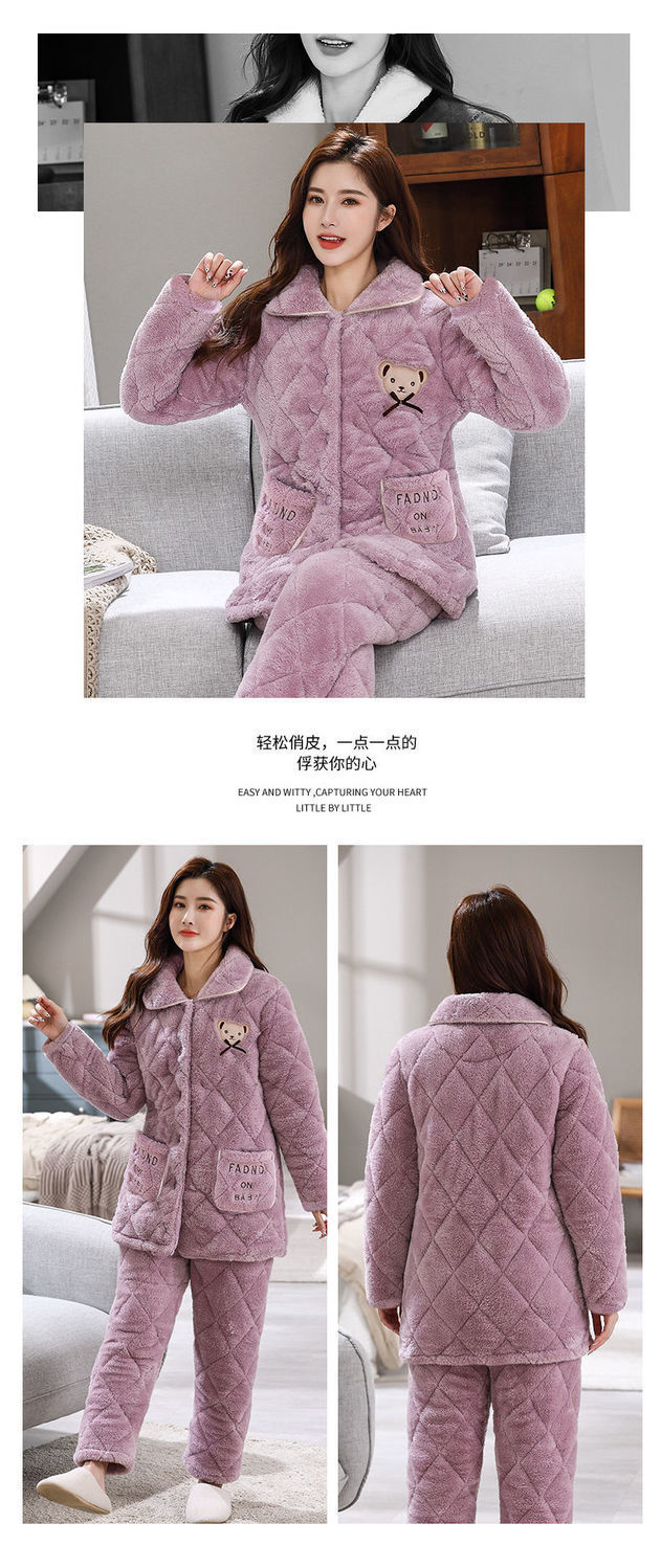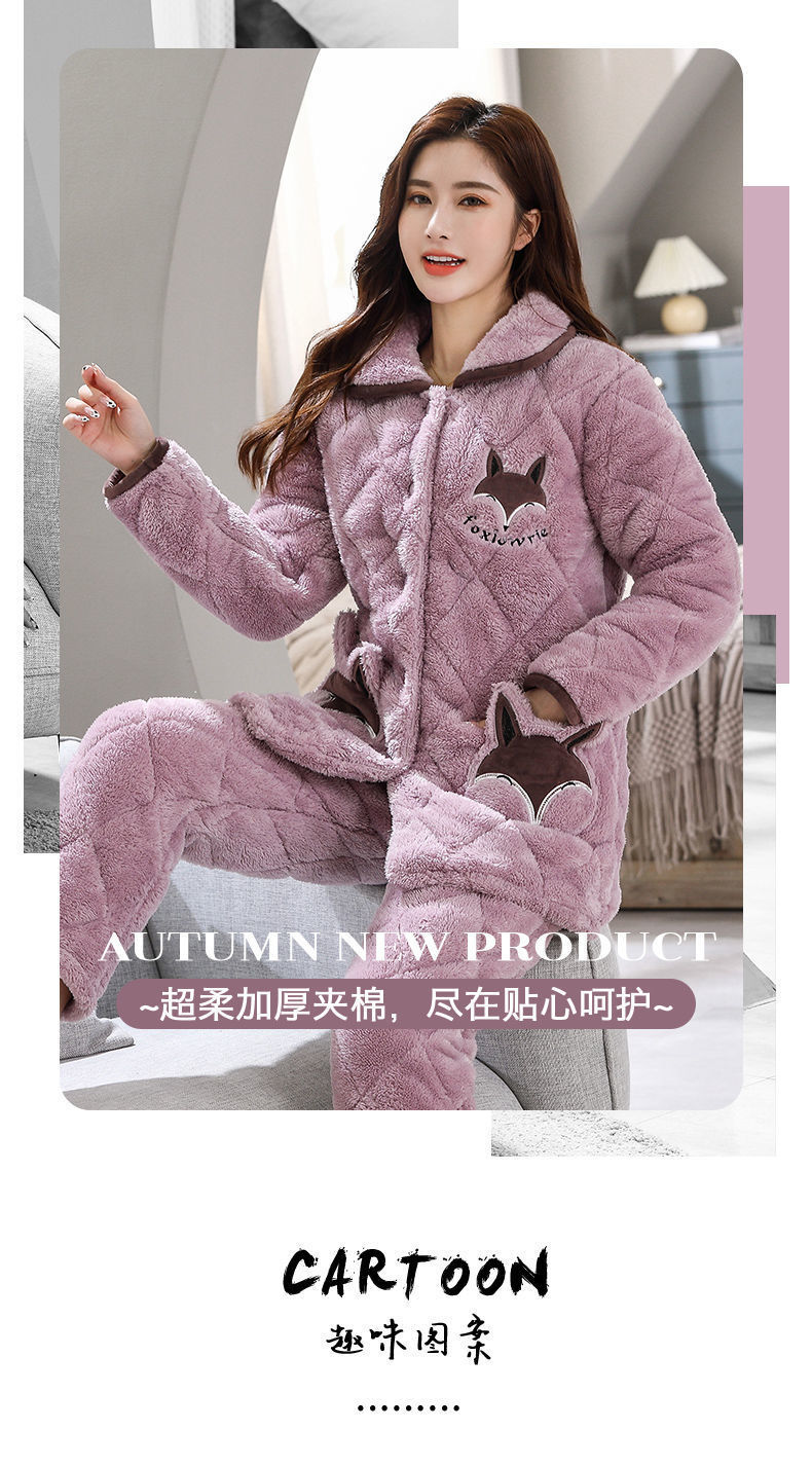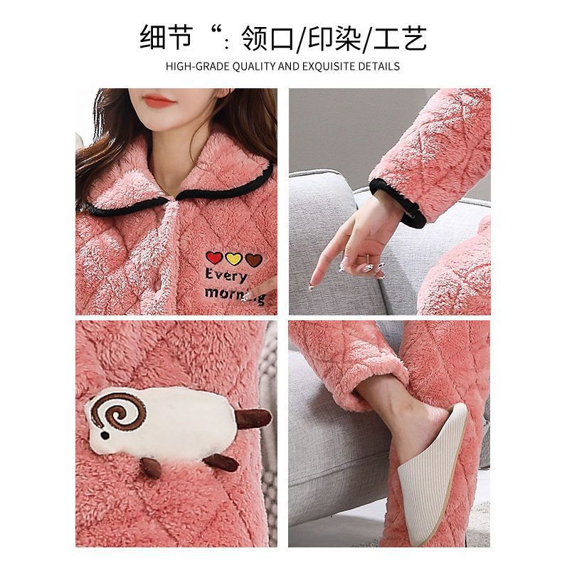 잠옷 여자의 가을과 겨울 3 층 면 두꺼운 기모 따뜻한 달콤한 슈퍼 두꺼운 산호 양털 면 패딩 코트 가정 옷 세트